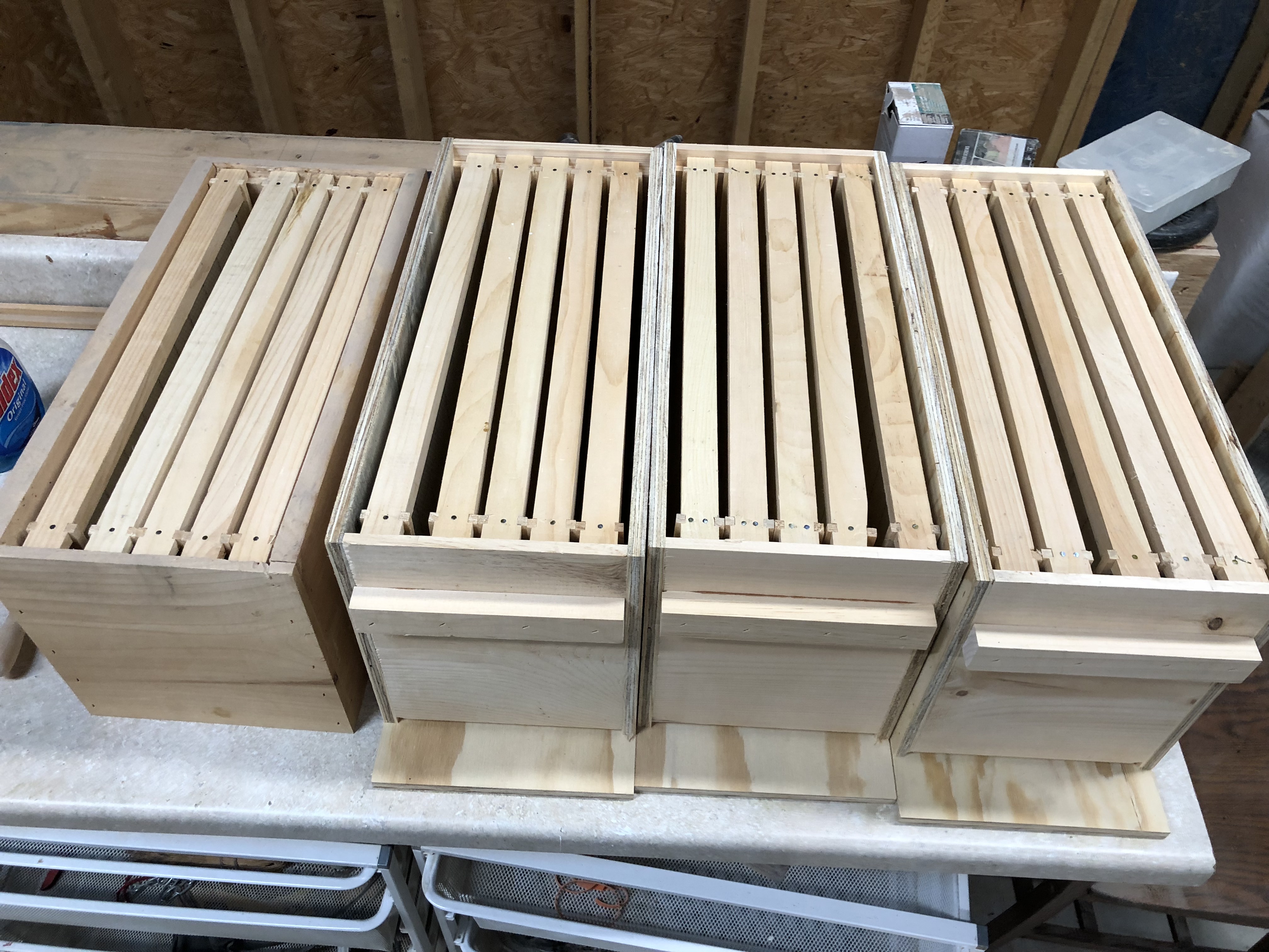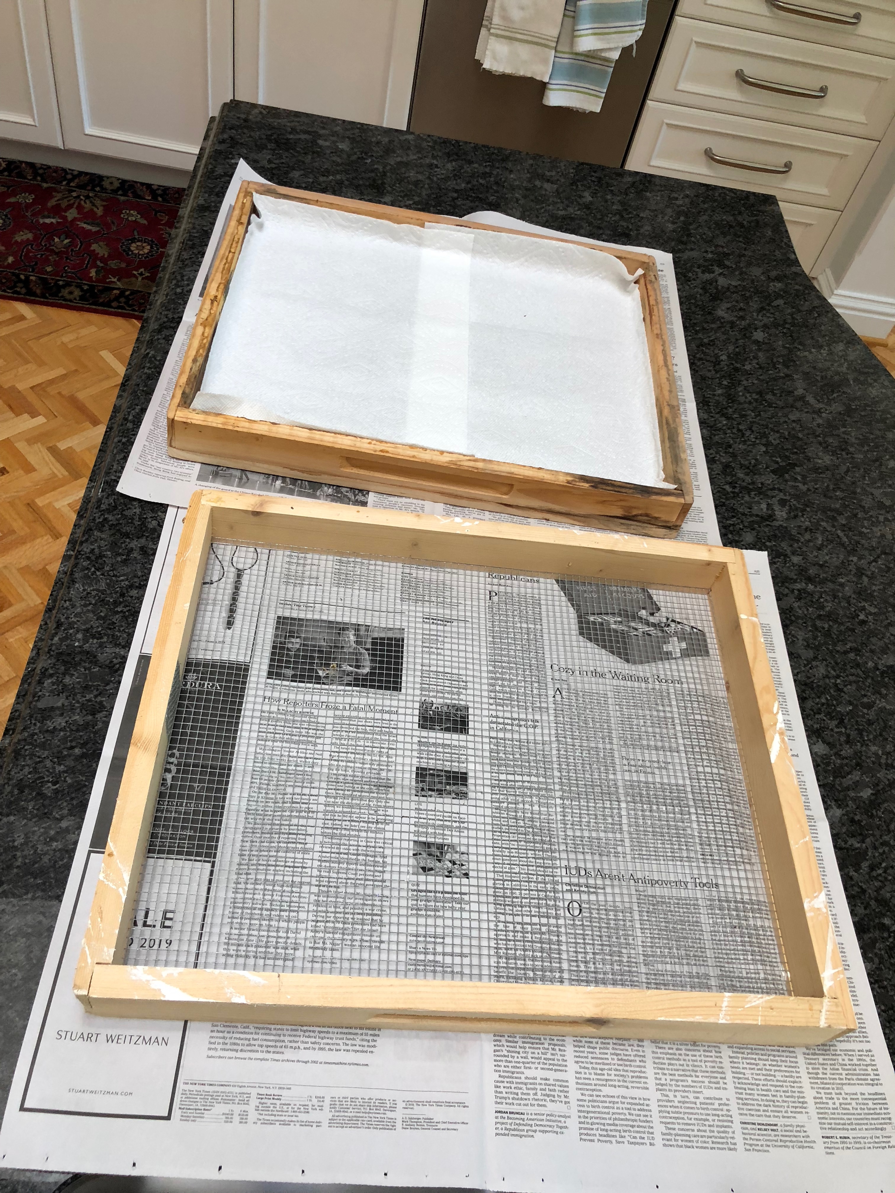 Robbing the bees of their surplus honey is stressful for them (of course I always get stung a few times but I’m used to that!) so I made sure to give them empty replacement frames to fill, something that gives them adequate space as well as something to do while we take their honey. The previous week I had constructed 2 boxes full of frames for this purpose. I buy the wooden pieces from my bee supply house and nail them carefully together before adding the wax foundations. On the day we pulled the fat, honey filled boxes, we also gave them the empties to begin the summer harvest.