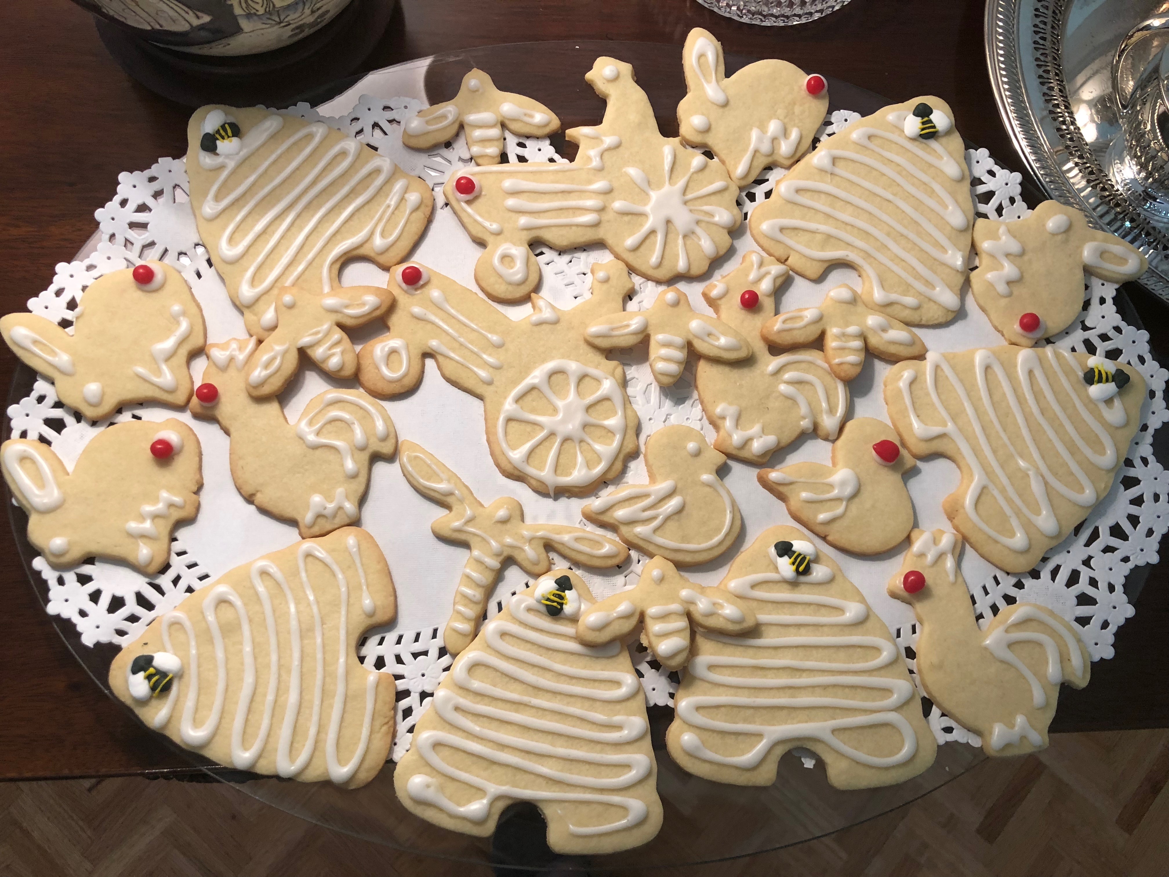 Joyce and I scurried back and forth, indoors and out, since there were food preparations to attend to for our guests…coffee, cookies, snacks, sandwiches and more. Here are the farm famous brown sugar, spice and jam cookies (think Linzer) that we had prepared along with trays of brownies and yummy PB&J sandwiches (with farm jam, no less!) As you can see, the fall theme of oak leaves, acorns, apples and maple leaves are the design element on the cookies which were a huge hit with many asking for the recipe!