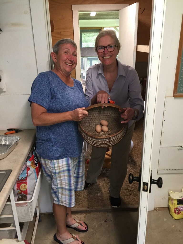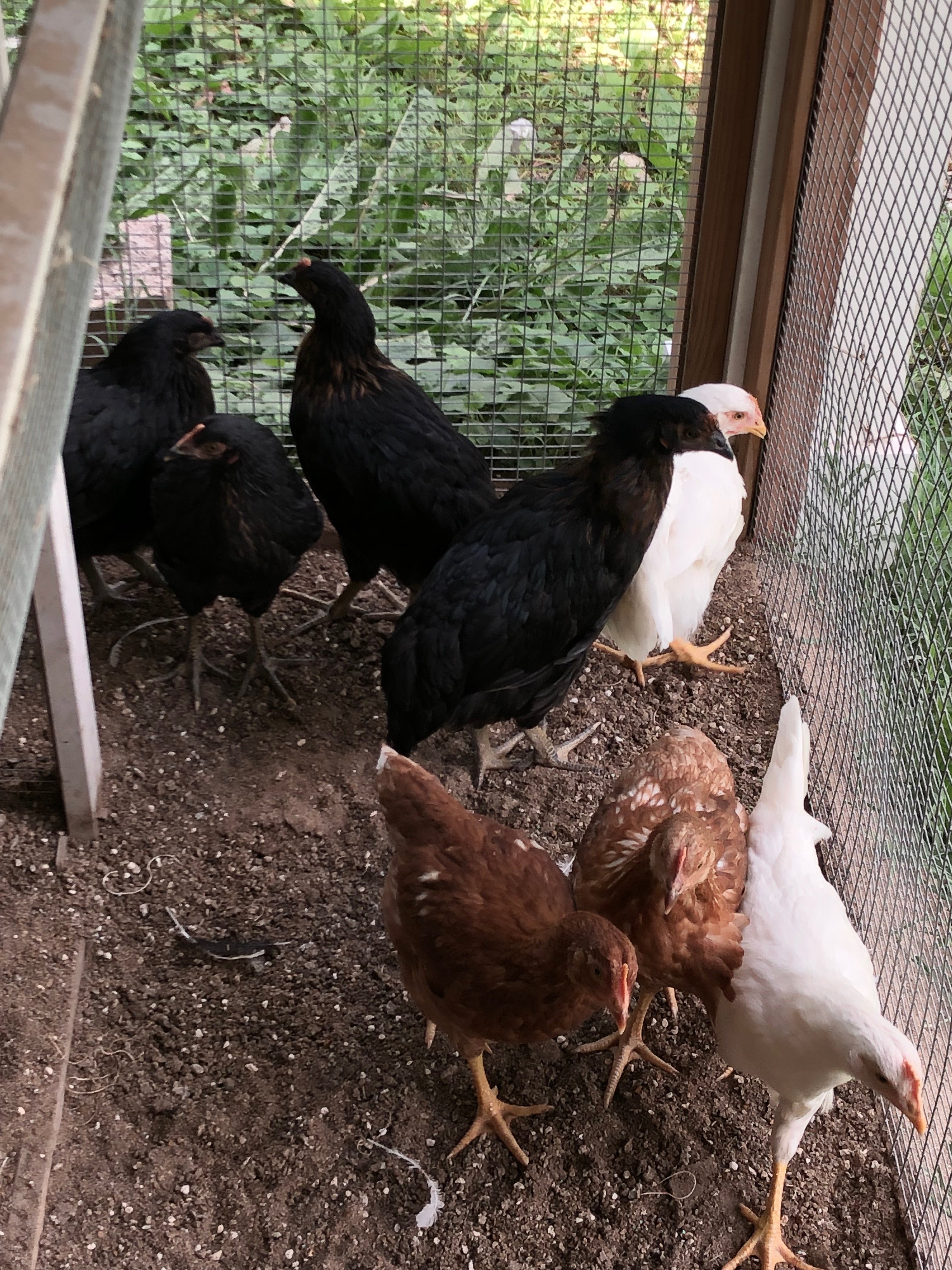 Perhaps the biggest news of the month is that we have had the first eggs laid from the new crop of chicks. In anticipation of this, we opened the nest boxes in the mini coop on July 20th (at 17 weeks of age) and patiently waited as we watched the newbies investigate these nests as well as those of the main coop. The first egg came from a Cinnamon Queen on July 26 at approximately 18 weeks old and today we had the first, smallish white egg (so telling from the color!) from one of the Leghorns. YAY!