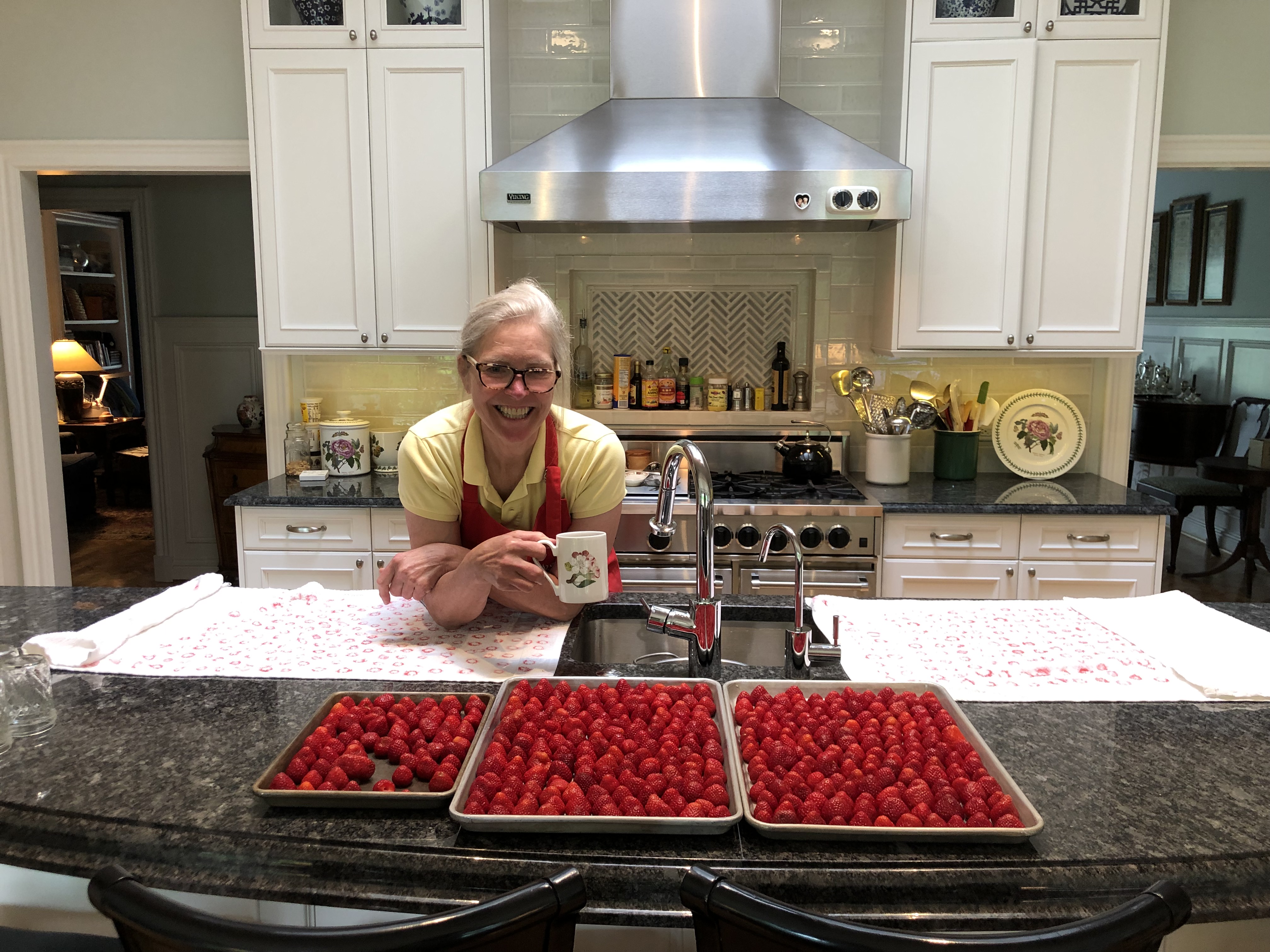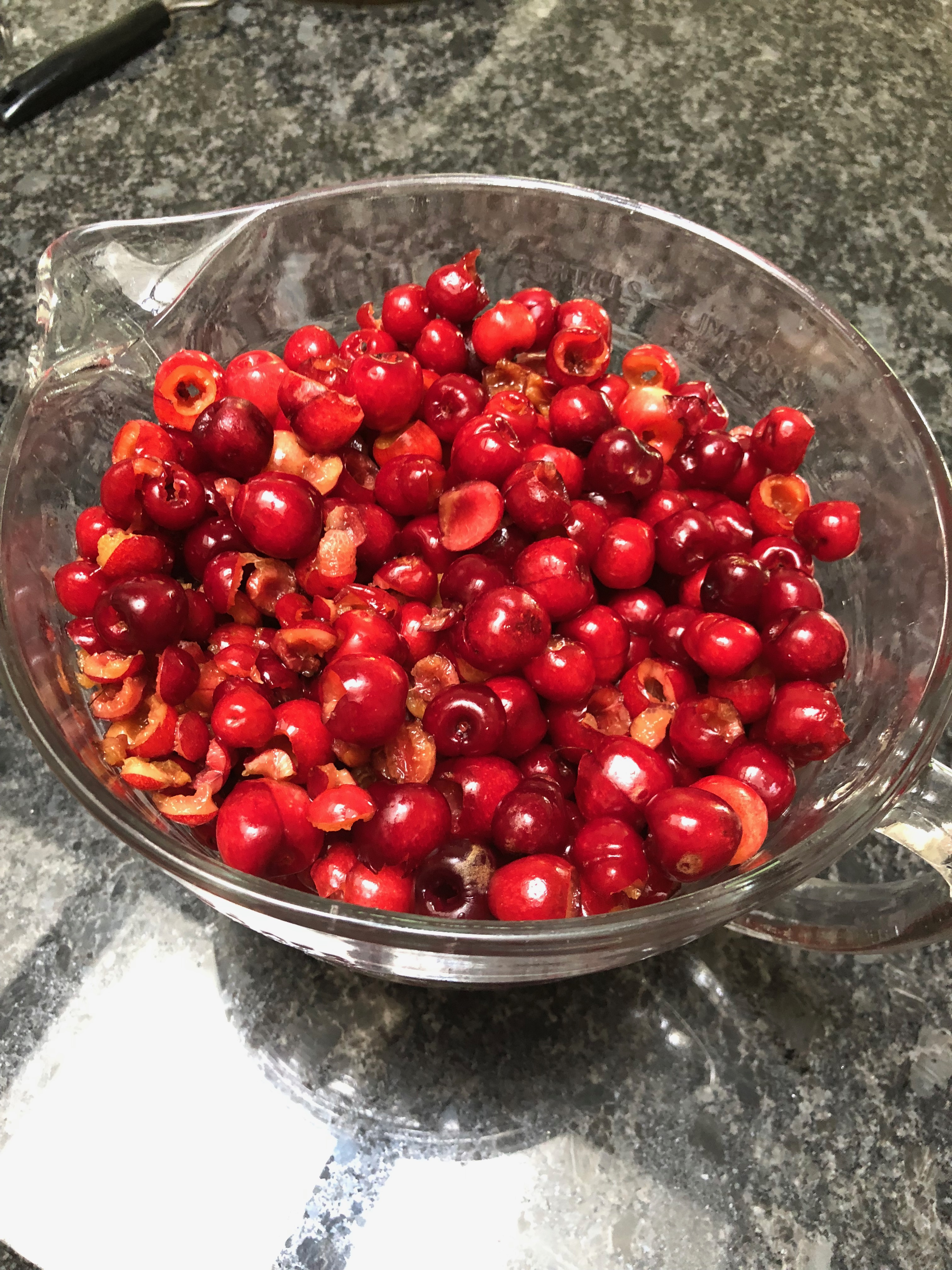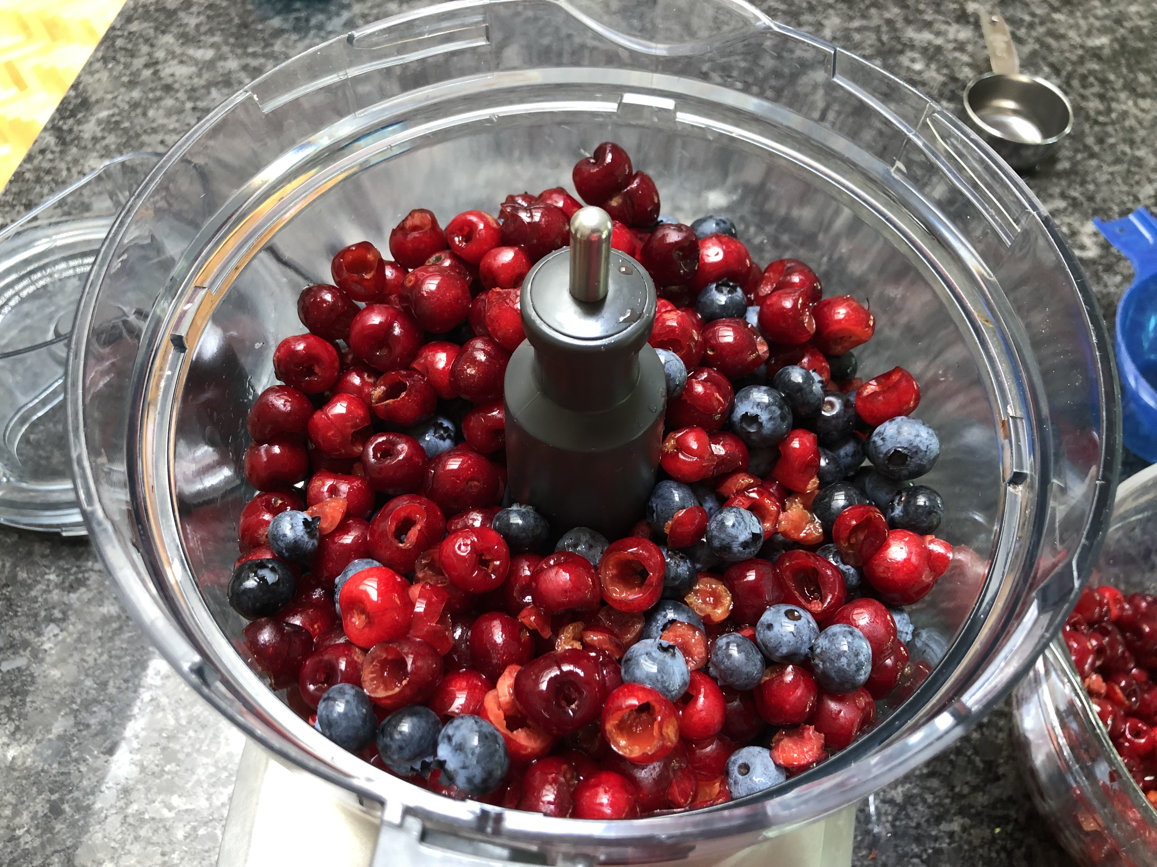 Even though this current variety of ripened blue berries are not considered “jam berries,” I decided to create a new jam recipe using cherries + blueberries for a special Seven Oaks Fourth of July Jam. It was fun to combine the two but with limited cherries left to utilize, I was only able to make 12 half pints to show for it! Yumbo! We sold some to customers and will be saving the rest for special tasters!