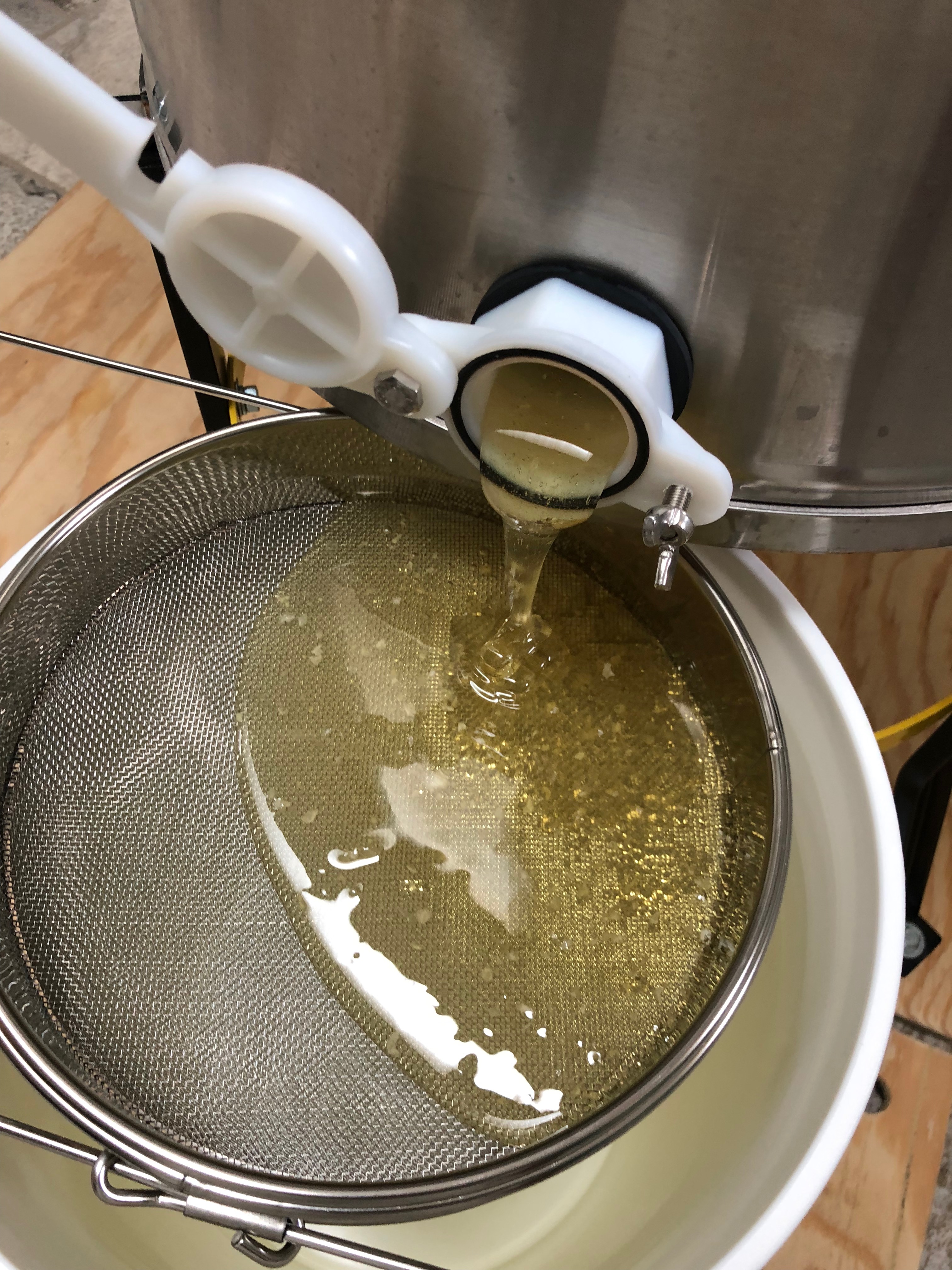 It takes time to do this work but this time of year, the air conditioning is spoiling us and the results are so enticing! We had 36 frames of honey which, after being picked clean of capped wax, were put into the extractor in batches of six. Our customers watched for just a few minutes but our work continued from 8am until well after 4 in the afternoon with an out pouring of 150 pounds of beautiful, spring honey which, after filtering, we put into 3 fifty pound buckets until we have time to jar it up!