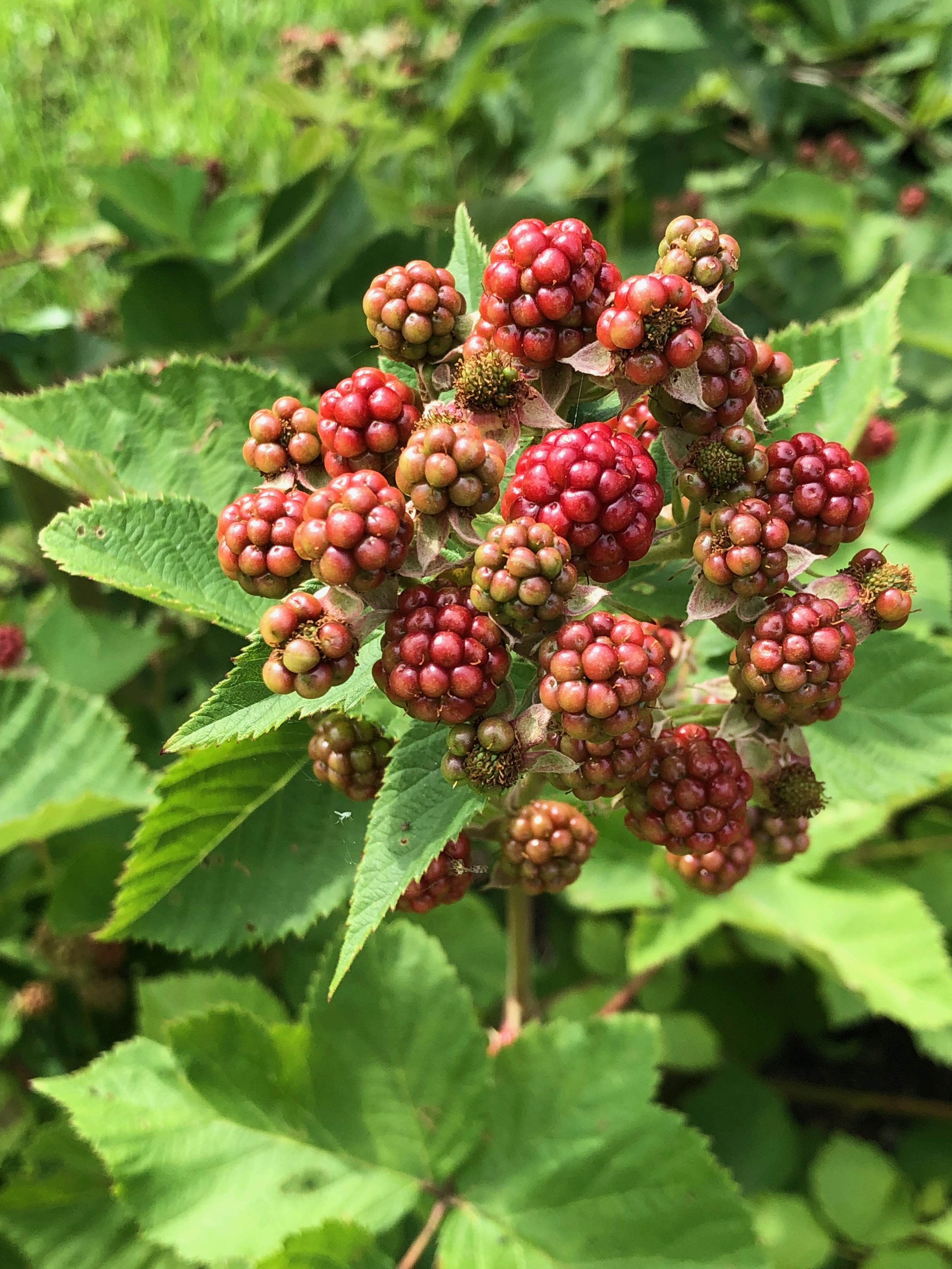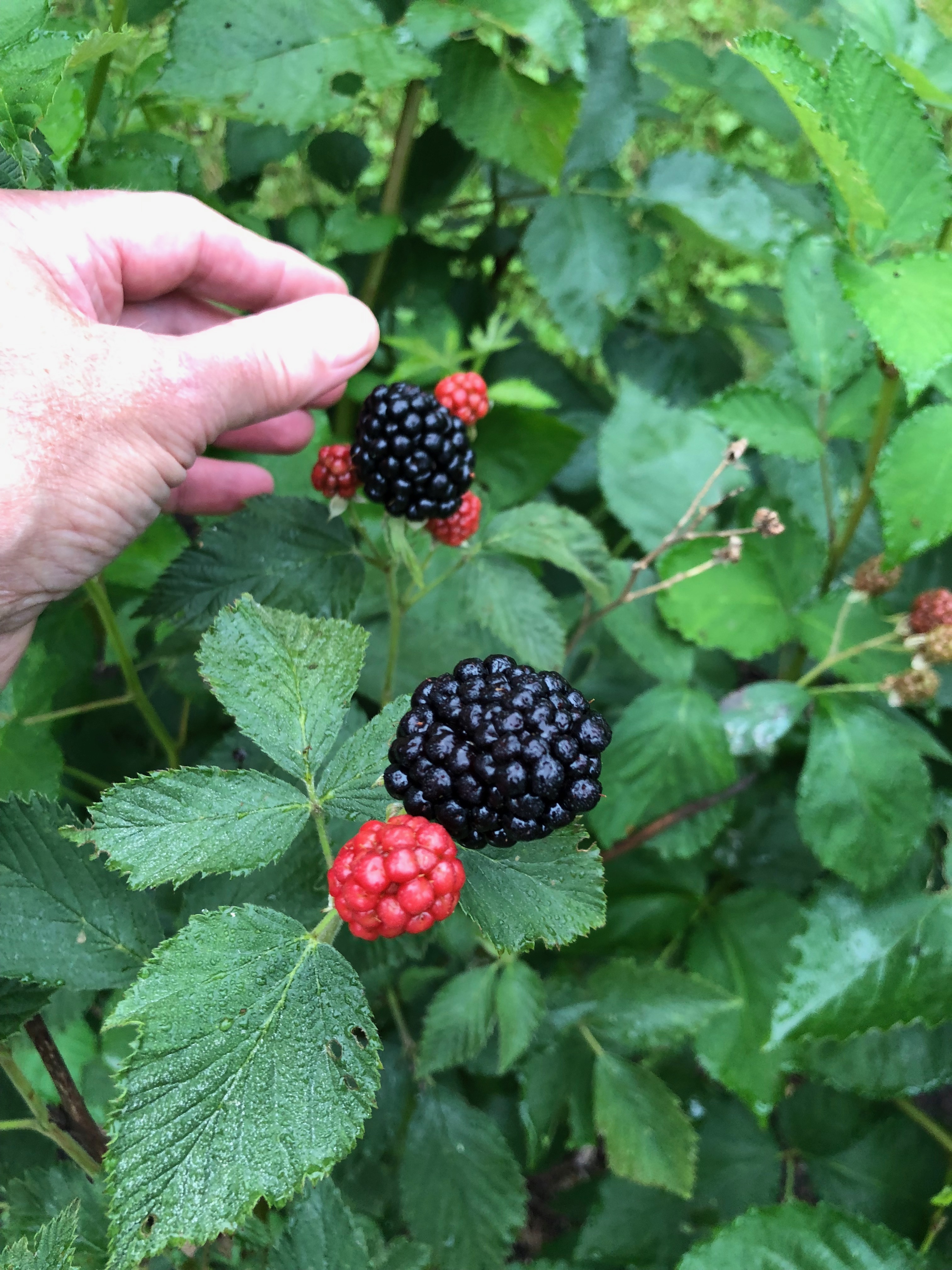 Blueberries are not the only goodies within the netting…as our 2018 plantings of two blackberry varieties are now starting to produce. ‘Sweetie Pie’ and ‘Chester’ are doing their thing! Both are thornless but with different qualities, as Chester has more of a bush-like structure with clusters and clusters of berries, while Sweetie Pie wants to vine and has stellar, large berries that are show stoppers.