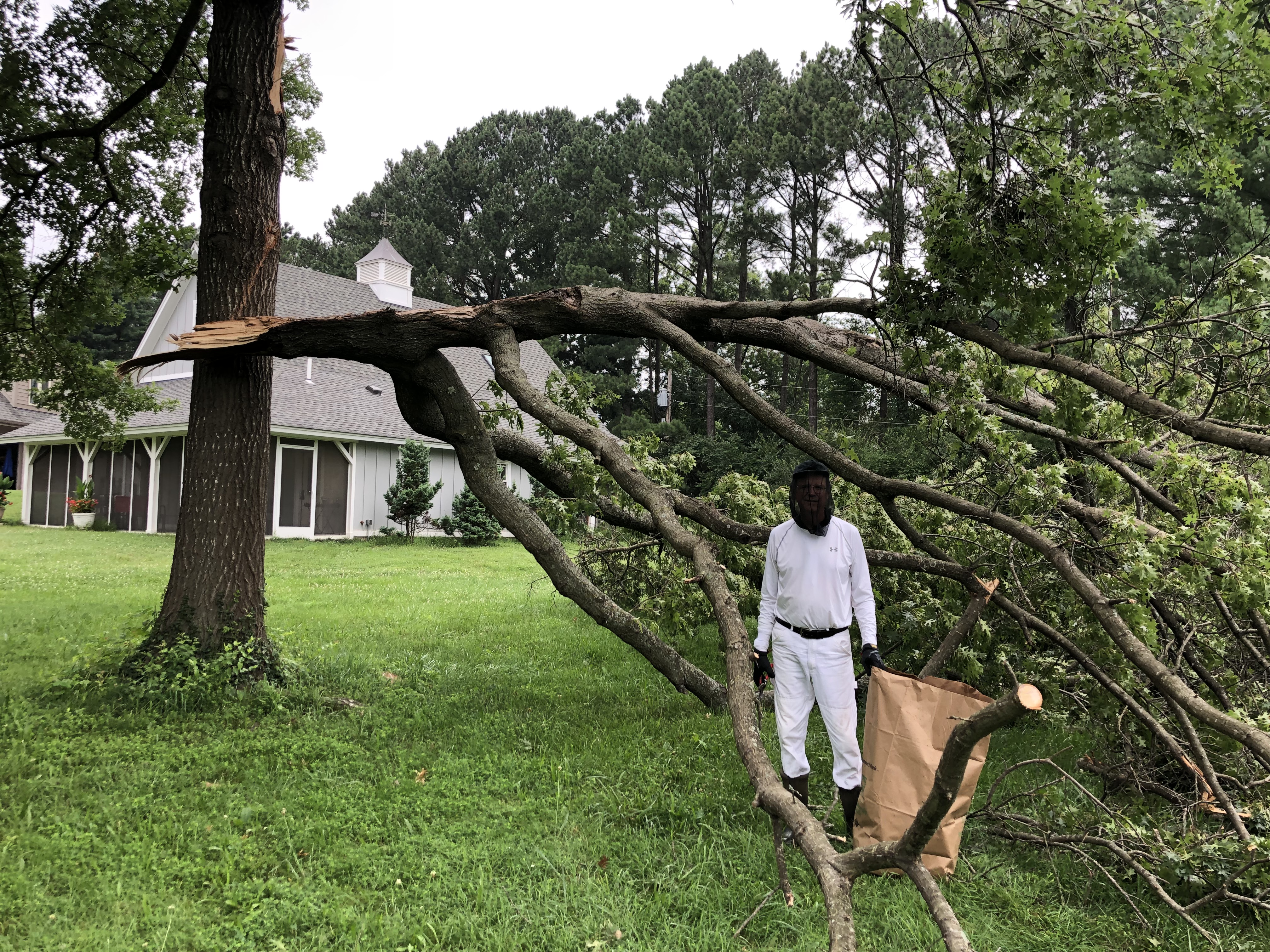 Our challenge now is to remove the downed half and evaluate the removal of the remaining half of the tree which might be subject to future storms. Of all things to be happy about, Dave is particularly relieved that the downed limb did not take out his cucumber patch!