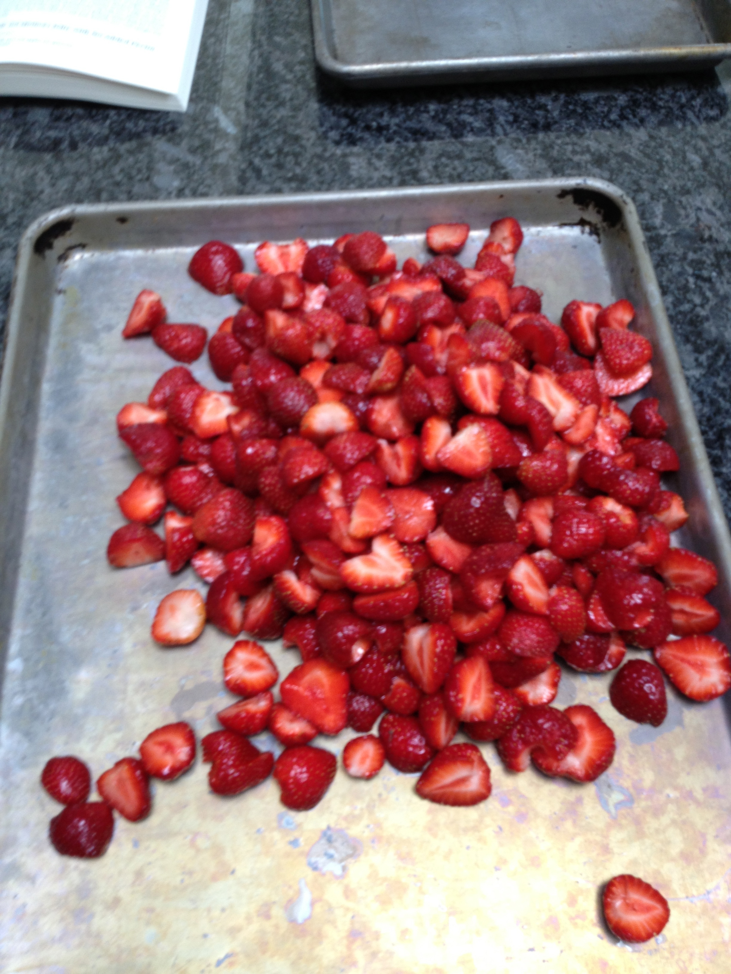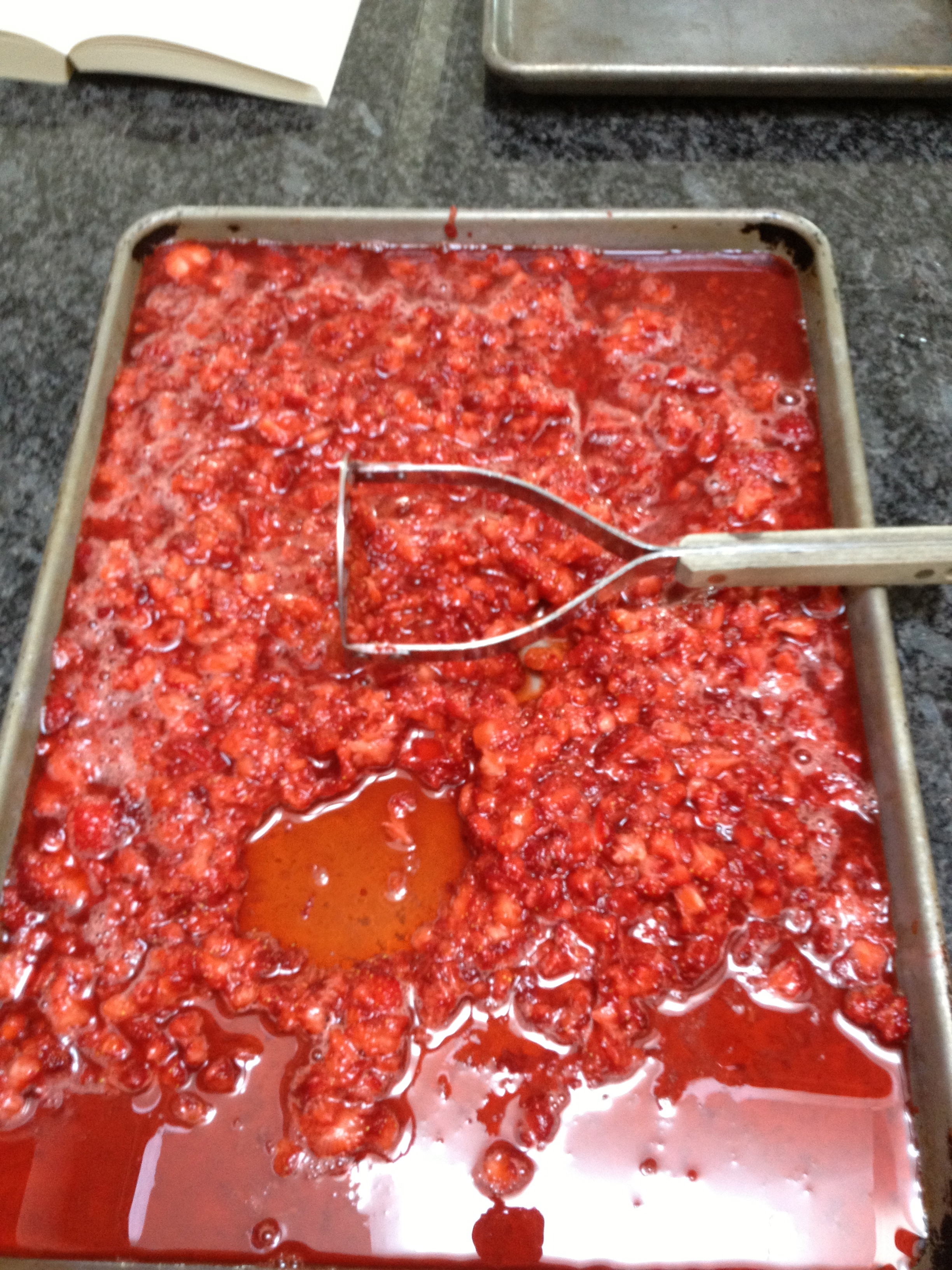 Here are the washed, hulled, sliced berries ready to smash.