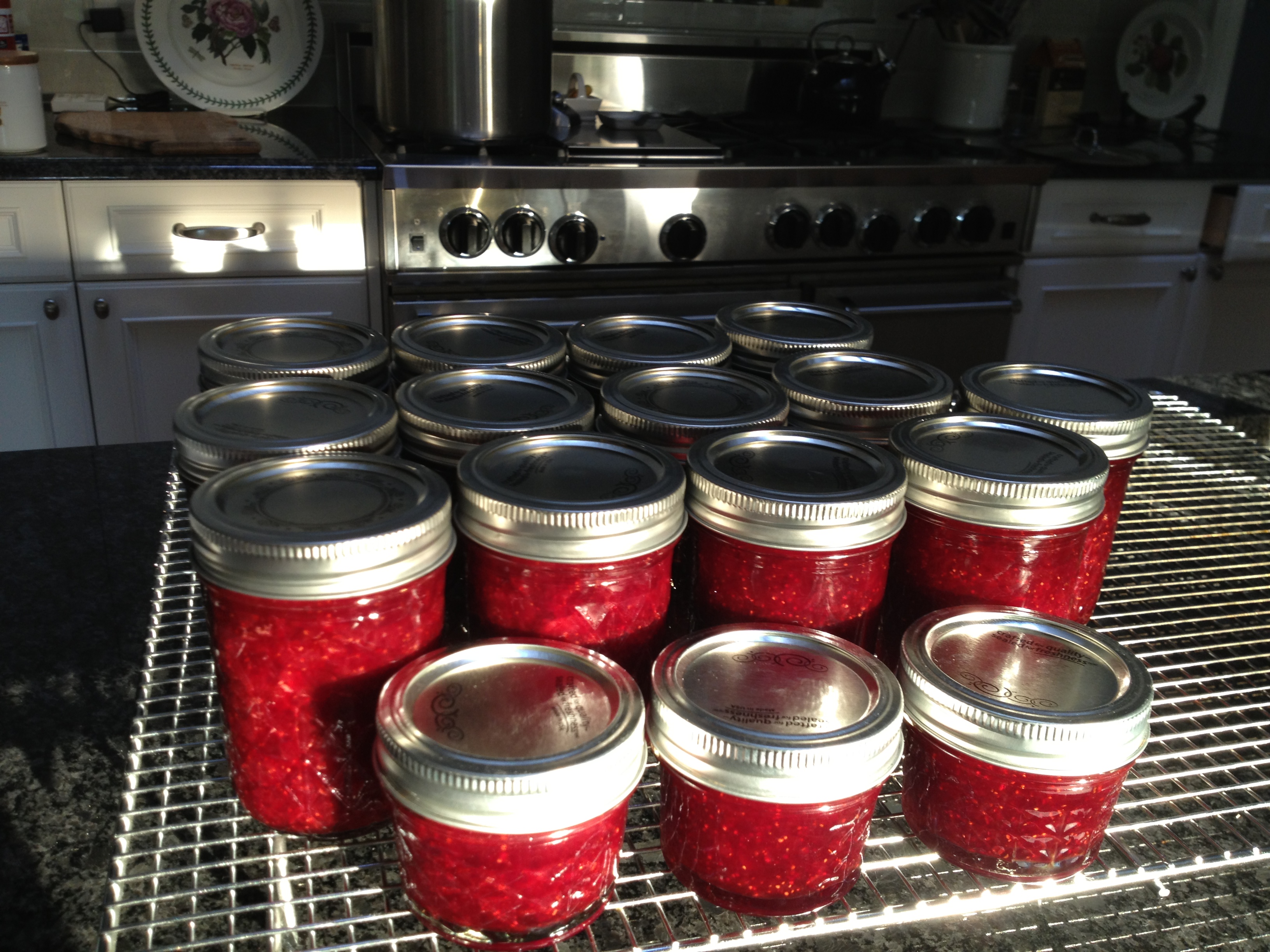 Yesterday was a big day for jam making at Seven Oaks. I experimented with two batches, making them both without pectin but with different amounts of sugar. It is appalling how much sugar one is instructed to dump into jam making! The first batch used 4 cups of crushed berries with 4 cups sugar and the second used 4.9 pounds of berries with 4 cups sugar. (Weighing is going to be my tool of the future since it is faster and more dependable than measuring.) To both batches I added the juice of one lemon. The first batch made 5 half pints and 1 quarter pint jars. The second batch made 8 half pints and 1 quarter pint. I probably could have added more sugar to the second batch but as long as it sets up, I’ll be quite happy!