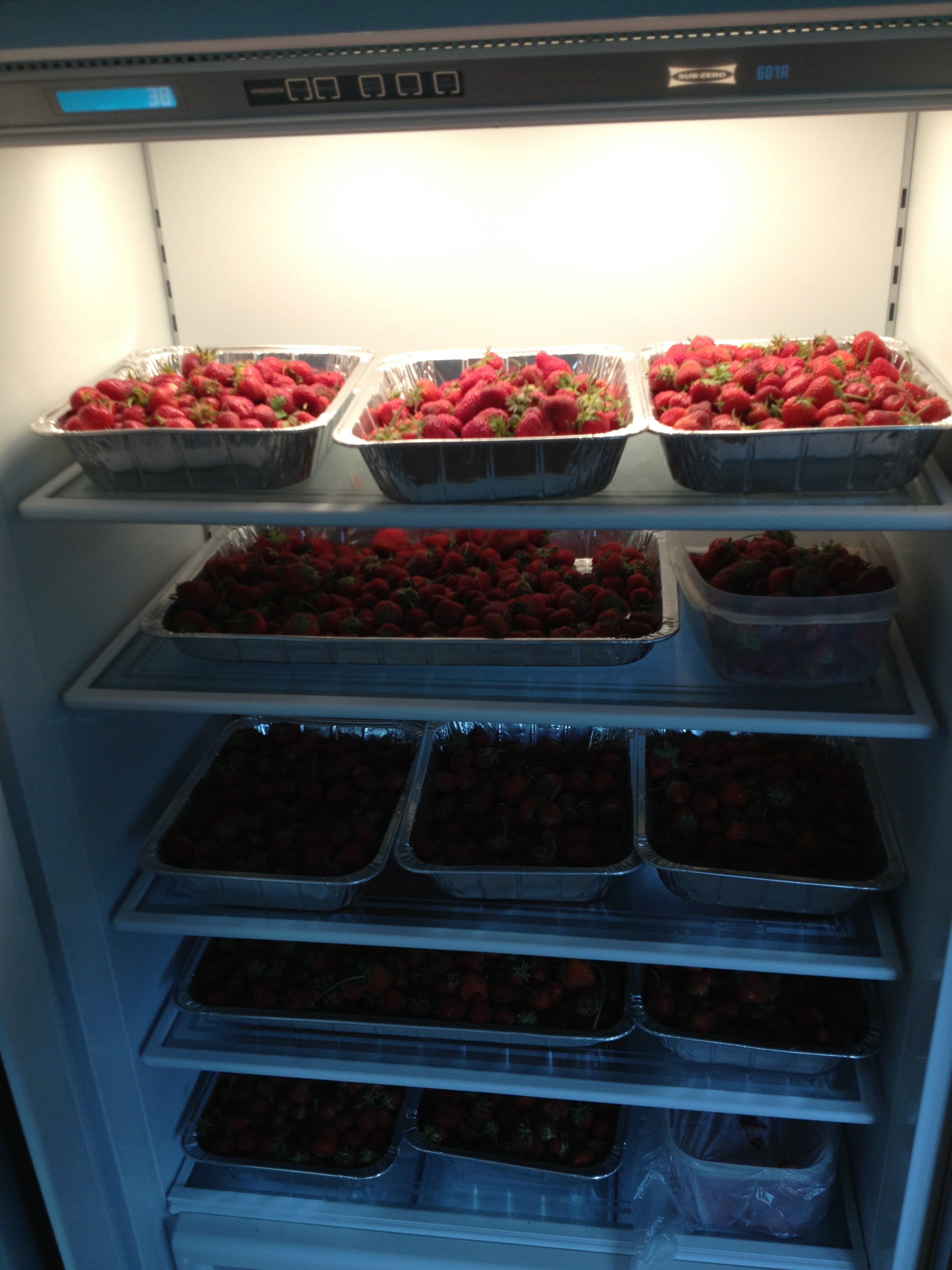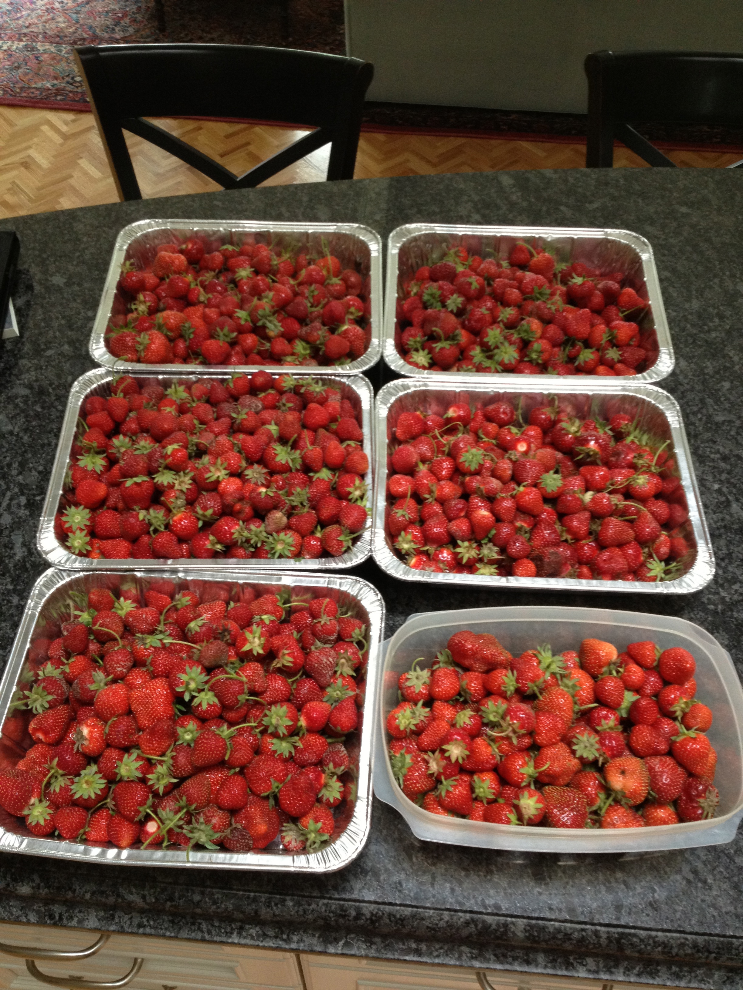 Yesterday was a big day for jam making at Seven Oaks. I experimented with two batches, making them both without pectin but with different amounts of sugar. It is appalling how much sugar one is instructed to dump into jam making! The first batch used 4 cups of crushed berries with 4 cups sugar and the second used 4.9 pounds of berries with 4 cups sugar. (Weighing is going to be my tool of the future since it is faster and more dependable than measuring.) To both batches I added the juice of one lemon. The first batch made 5 half pints and 1 quarter pint jars. The second batch made 8 half pints and 1 quarter pint. I probably could have added more sugar to the second batch but as long as it sets up, I’ll be quite happy!