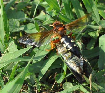 These very large wasps burrow into loose soil (our plowed fields) and deposit their larvae in the burrows. They provide food for their larvae to eat as they develop, by stinging (the females have the stinger – the males lack one – wouldn’t ya know!) and paralyzing cicadas which they then take, as captives, down into their burrow as a food source for their larvae to feed on. Here is a pic of this transaction.