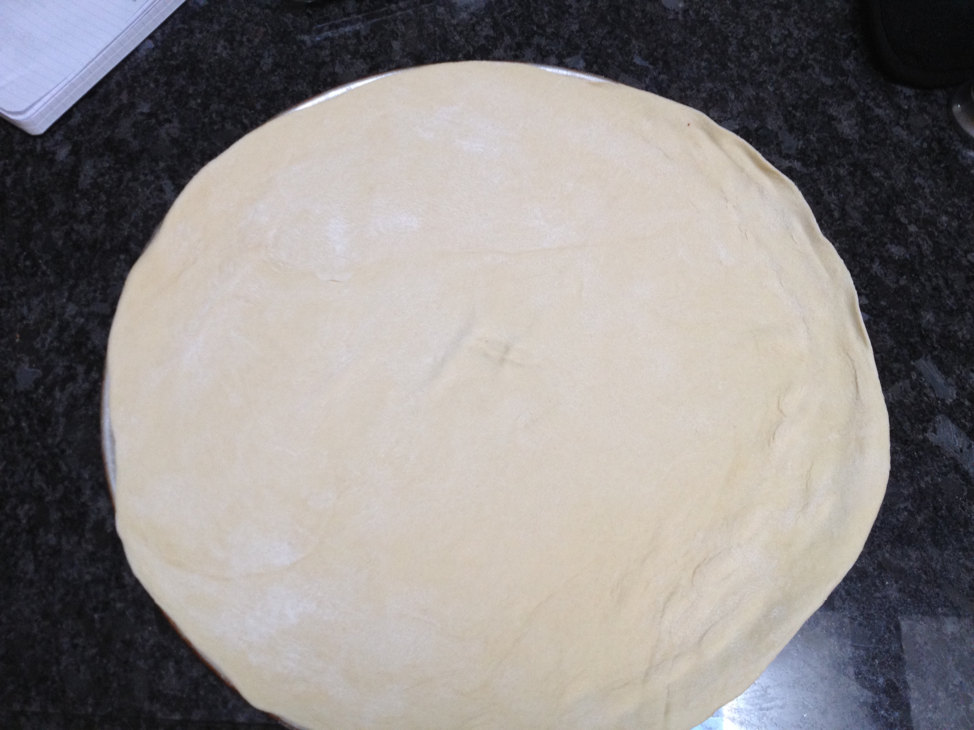 Then I roll out the dough and put it on one of our circular pizza pans. Rolling out the pizza dough doesn’t require any skills, oils or cornmeal on the bottom. I roll my dough and put it directly on the pan and it never sticks.