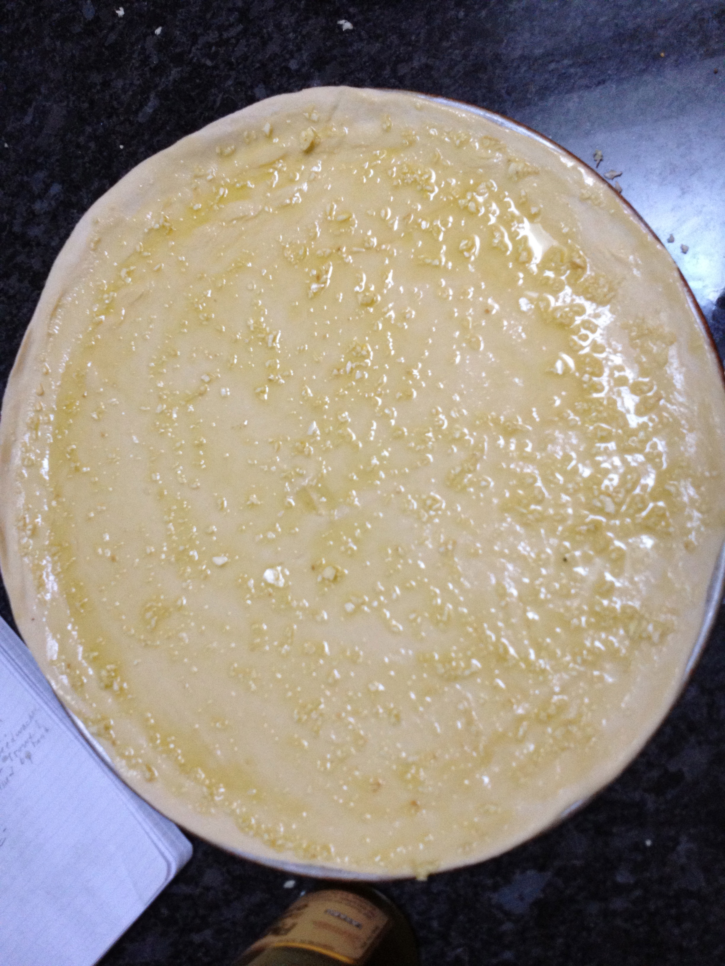 Okay, so then, I smear the surface of the dough with a really nice olive oil. Use a special one if you want some added flavor but it is not necessary. Then, add fresh, minced garlic! In my opinion, use plenty and spread it generously on top of the oil!