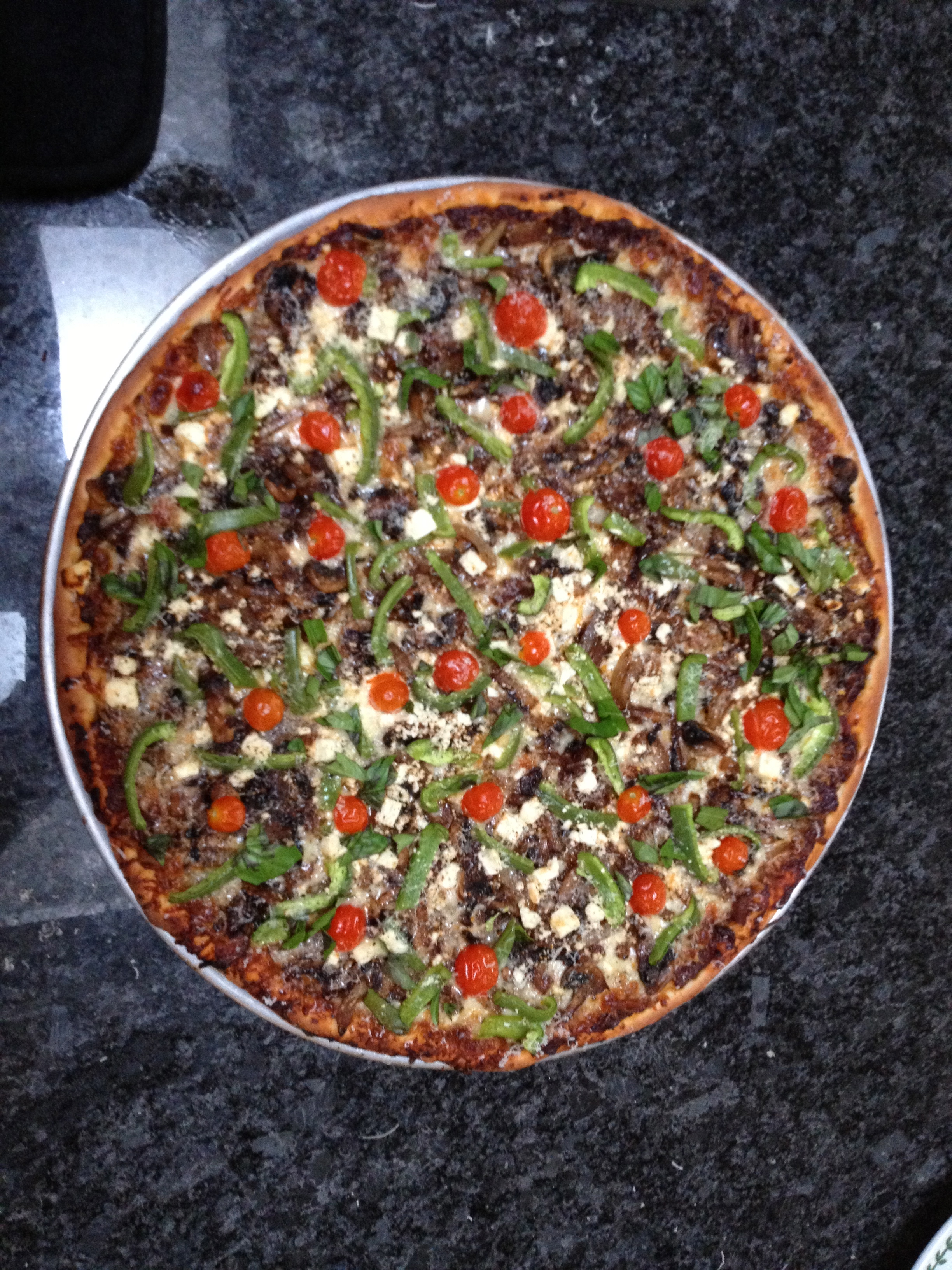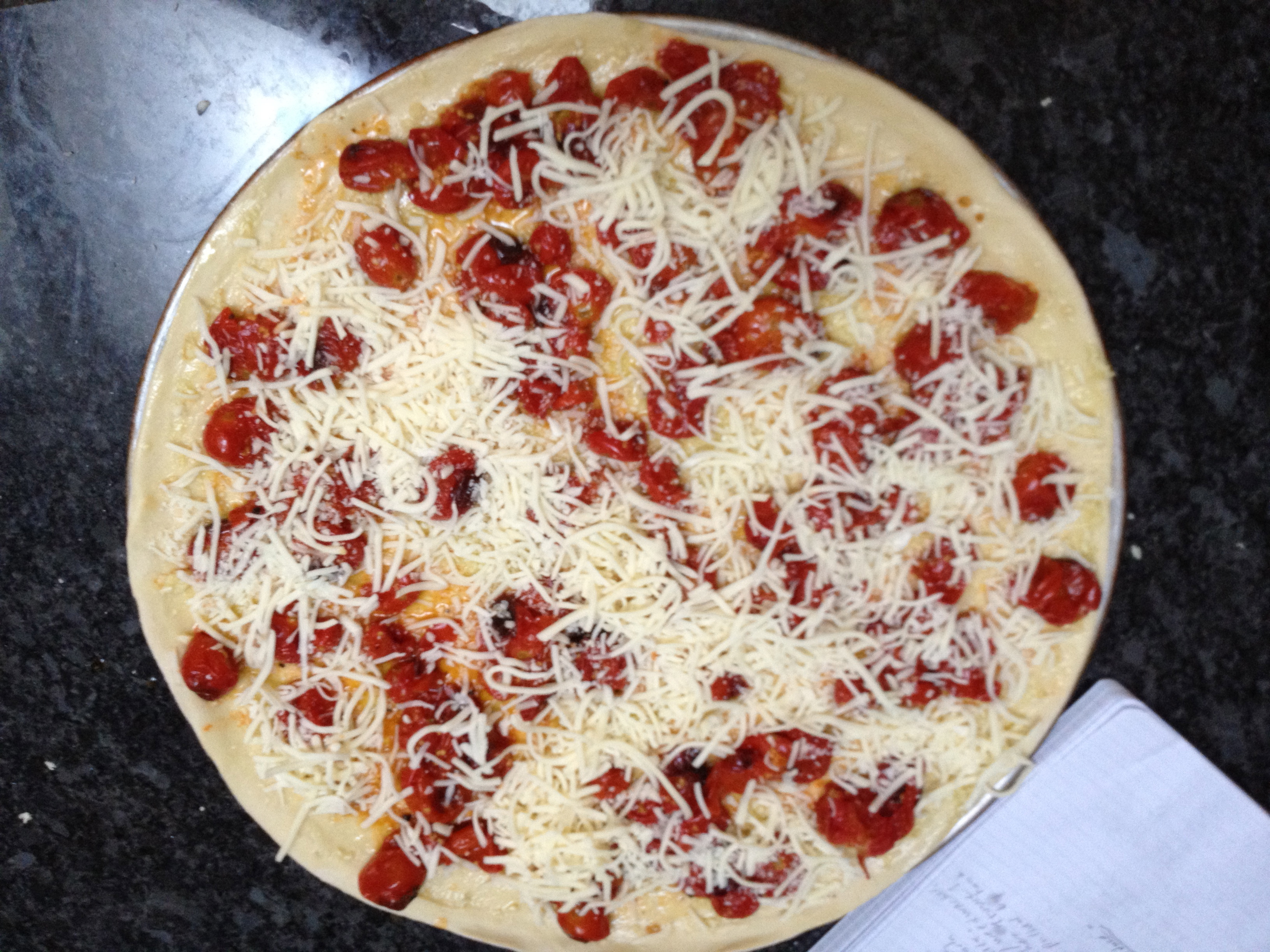 And here are some photos showing how simple it is to make. You cannot really ‘ruin’ home made pizza and once you get the hang of it, you will find it is practically easier (and always better!) than ordering it when out. If you are so inclined, you should certainly try putting the base on the outdoor grill for a change up, but we like it in the oven as well. Home grown ingredients make it all the more special but just about anyone with a back yard can plant cherry tomatoes and basil!