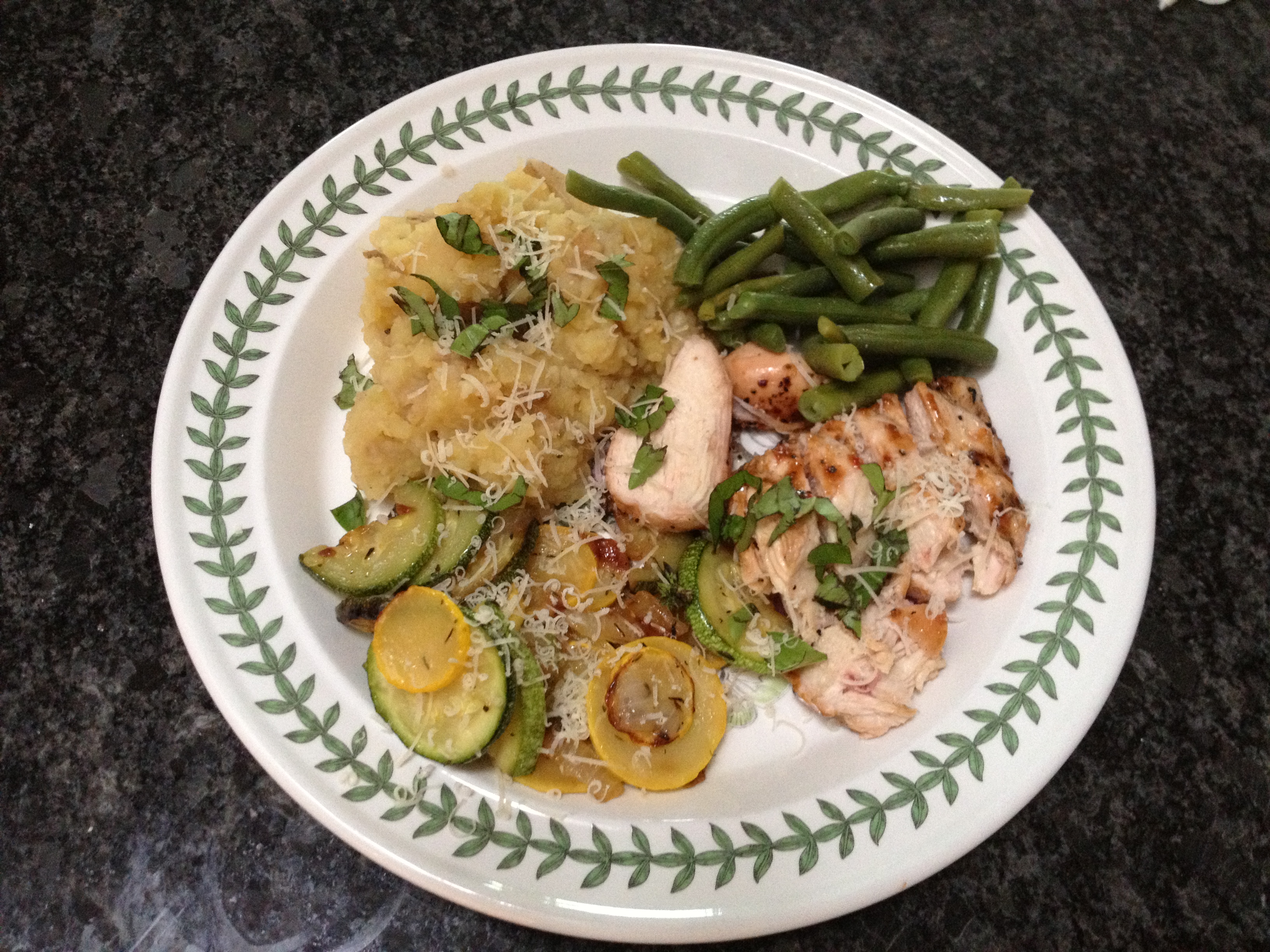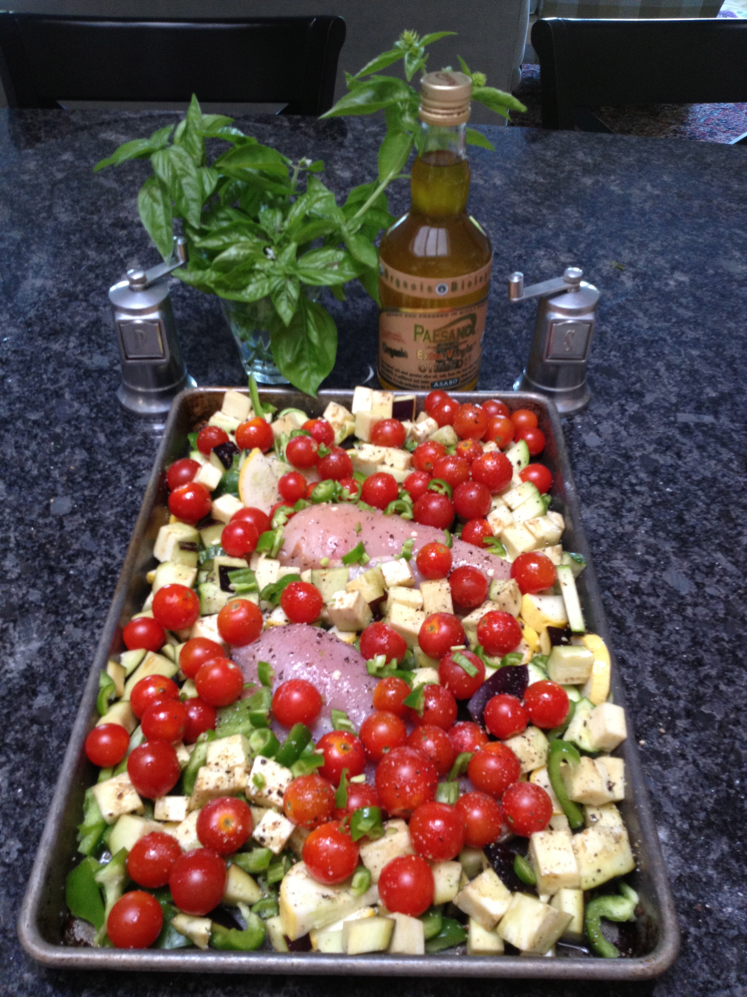 Then, layer your fresh, grated, Parmesan cheese, then the roasted tomatoes (including any juice from roasting) and top, lightly with some more cheese. I’ve used many varieties, including feta, mozzarella, etc.