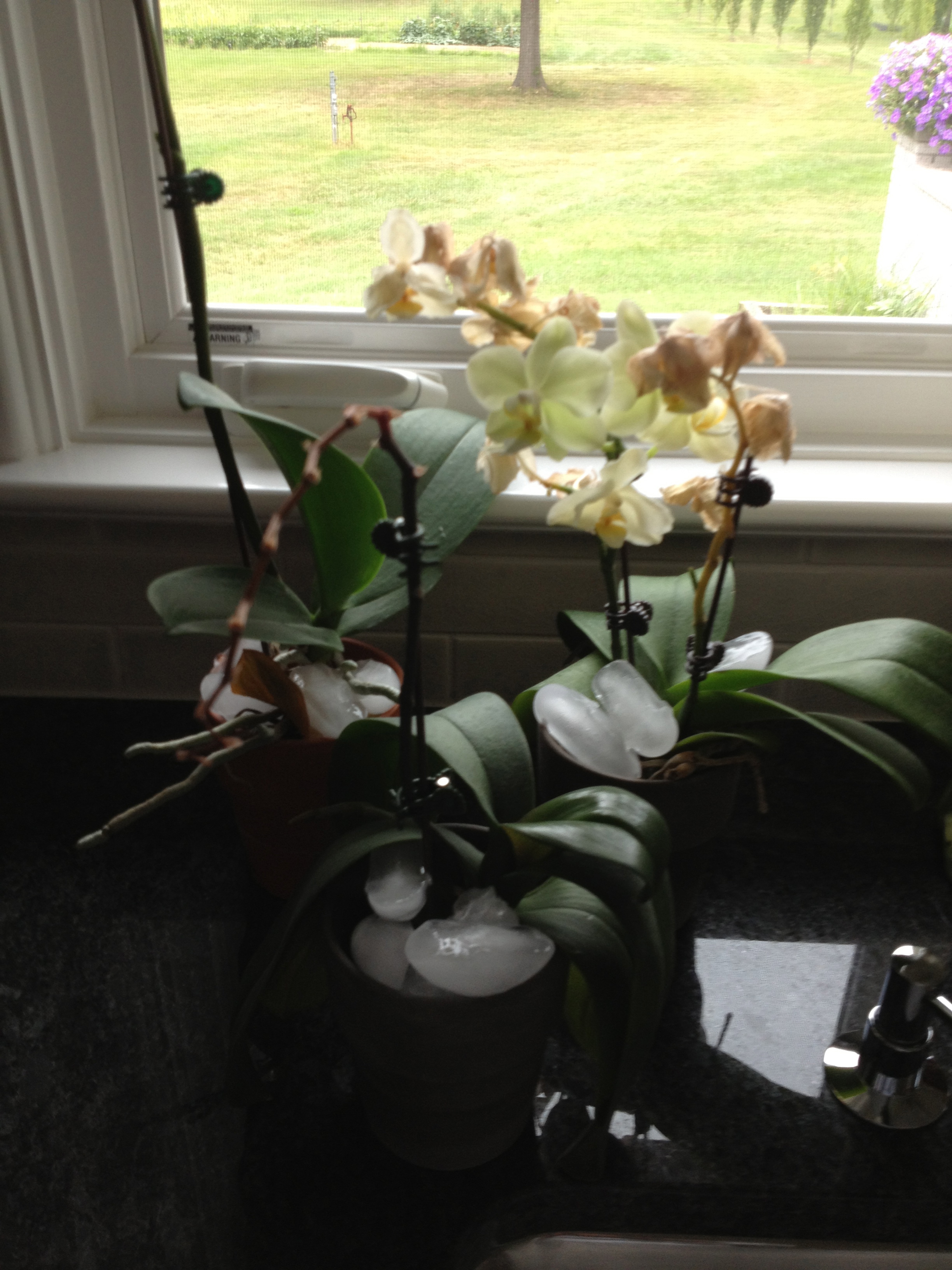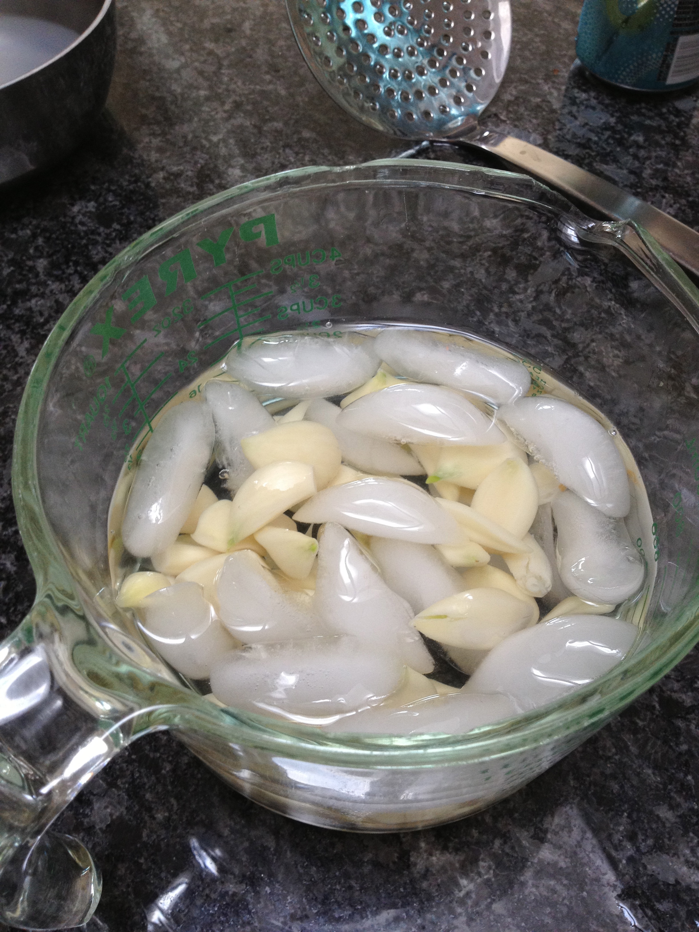 I then blanch the garlic cloves twice by covering them with cold water and bringing them to a boil on the stove top. As soon as they come to a boil, I plunge them into ice water and repeat this process.