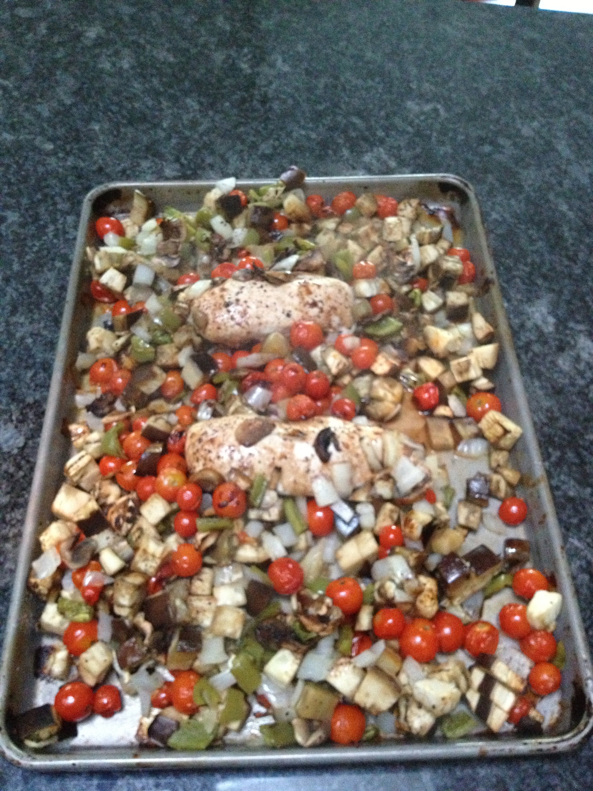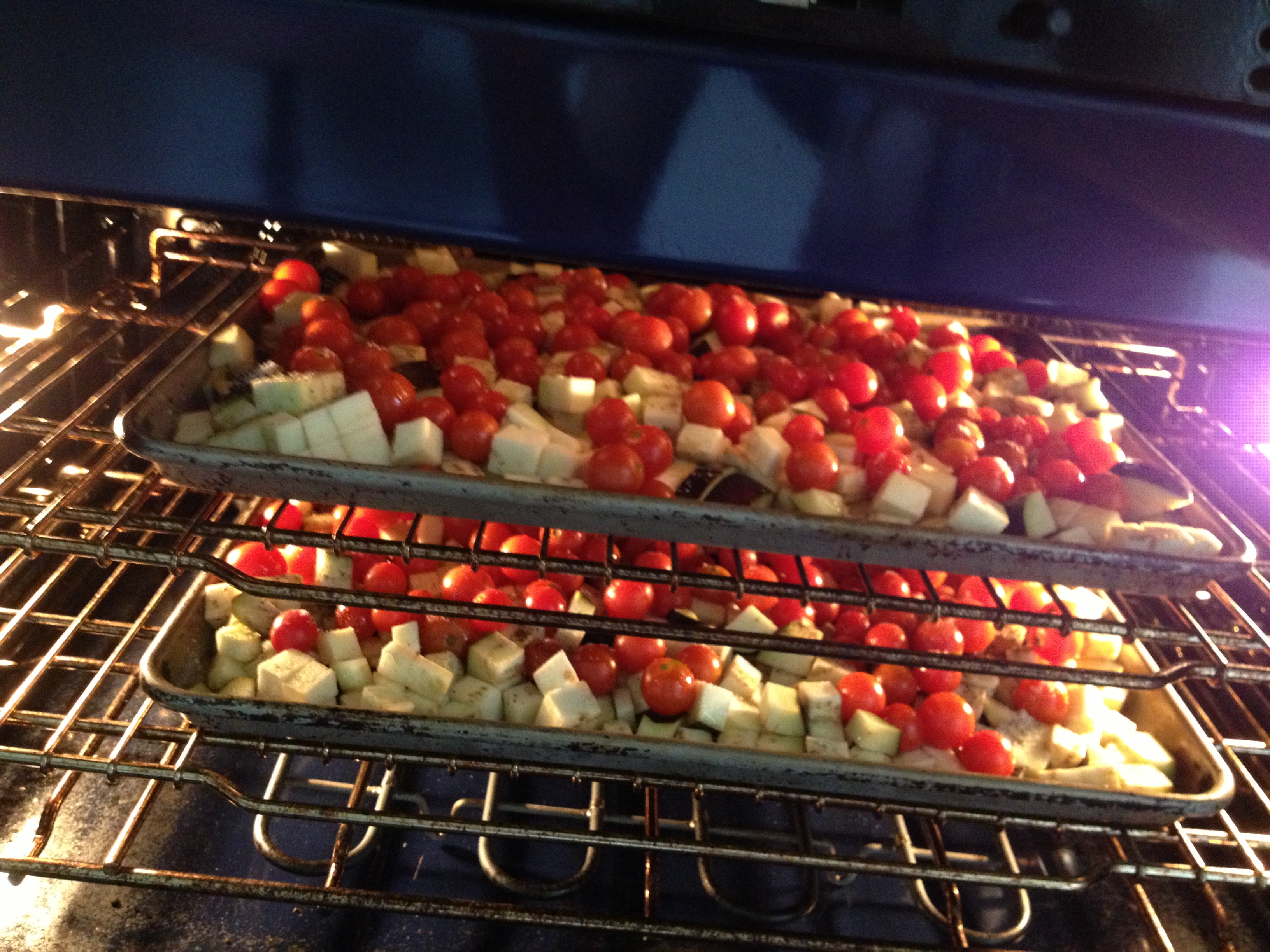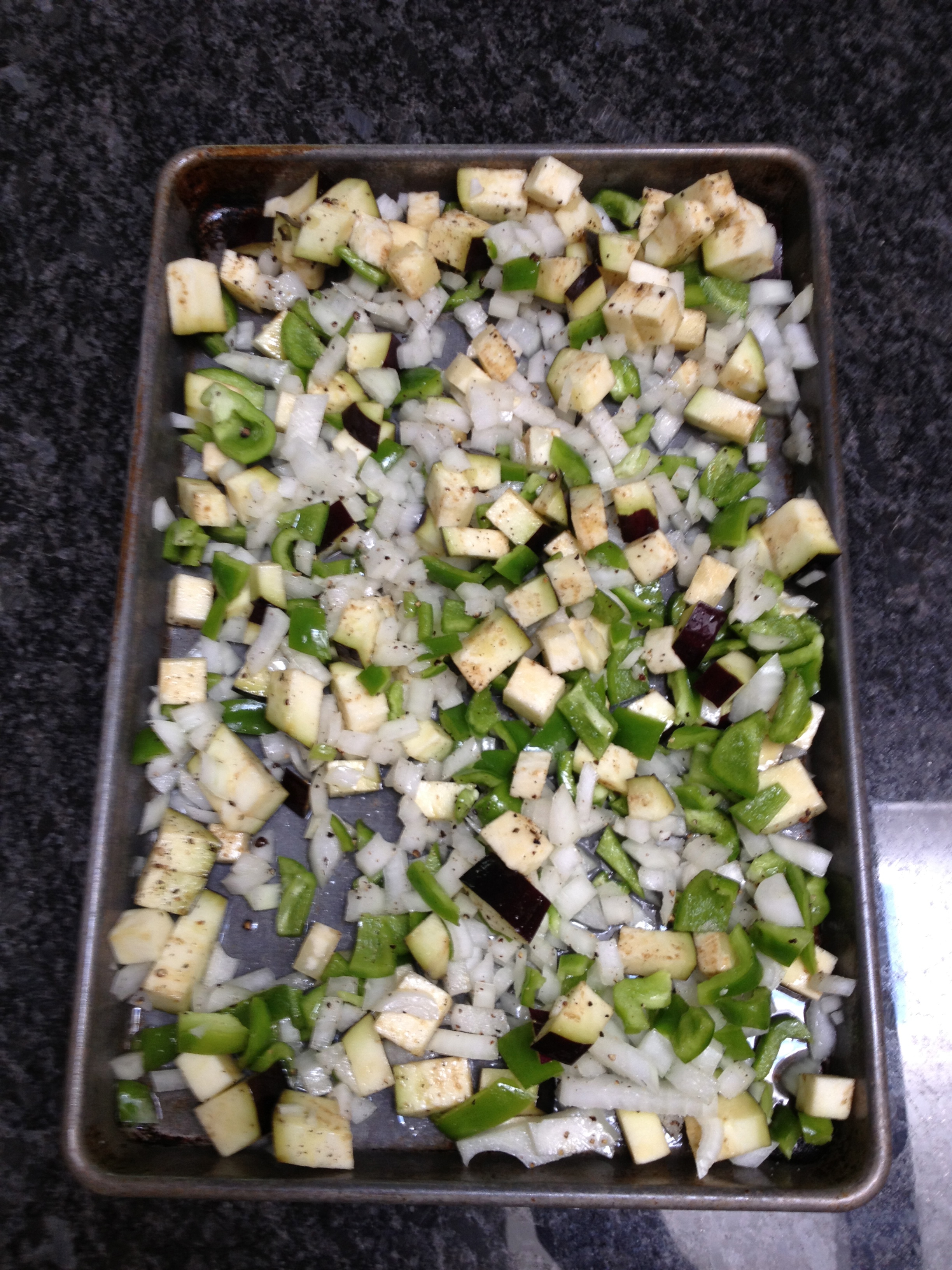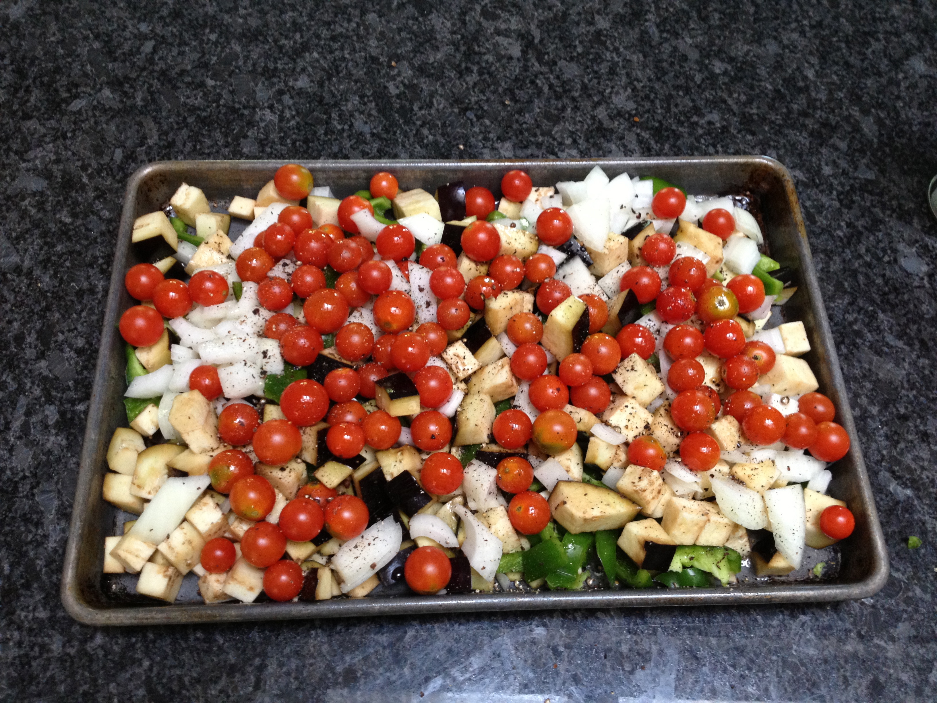 I chopped up some eggplants, green peppers, onions and roasted them on high heat in the oven.