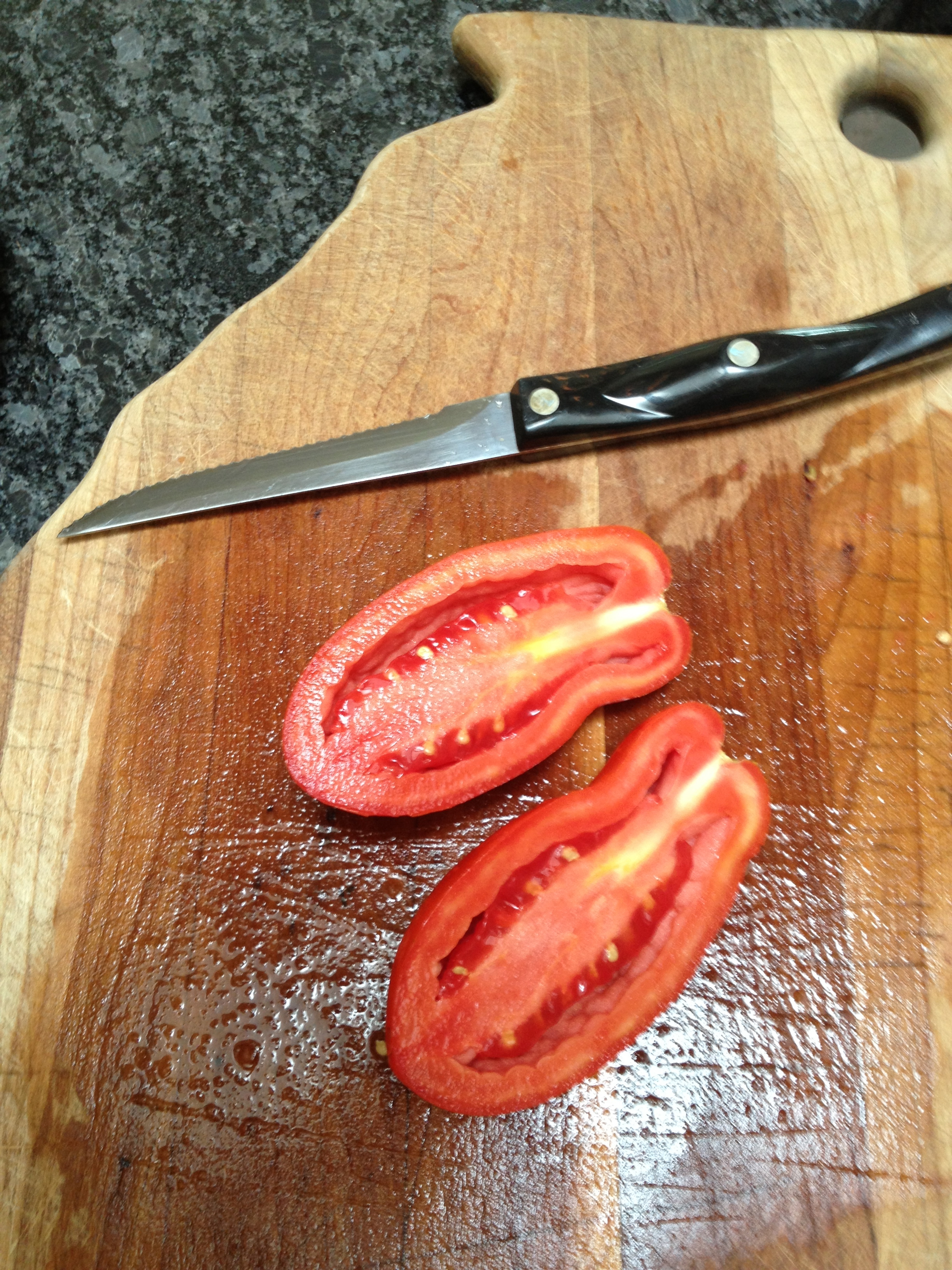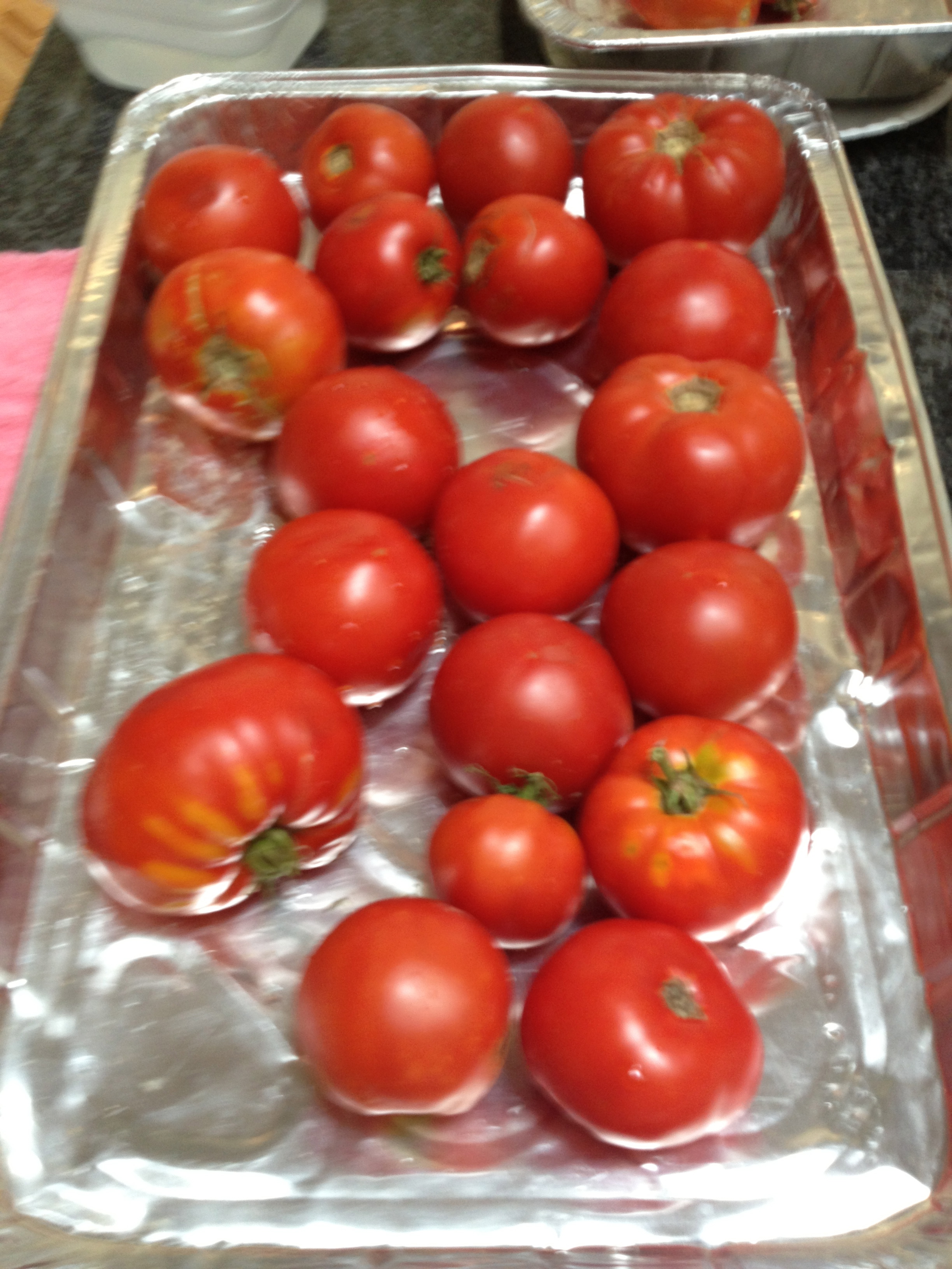 At that point in time I had the next batch of tomatoes cooking away on the stove top and had written a teaser about whether it would be pasta sauce or ketchup since I had not decided what direction to go. Well, I was wrong about that. I had forgotten that my favorite ketchup recipe starts off with some onions in the initial processing of the tomatoes which I had not included in that batch. So, after consulting my recipes, while that batch of milled tomatoes were simmering down on the stove top, I decided to roast some veggies to add to the sauce and make it into a hearty pasta sauce.