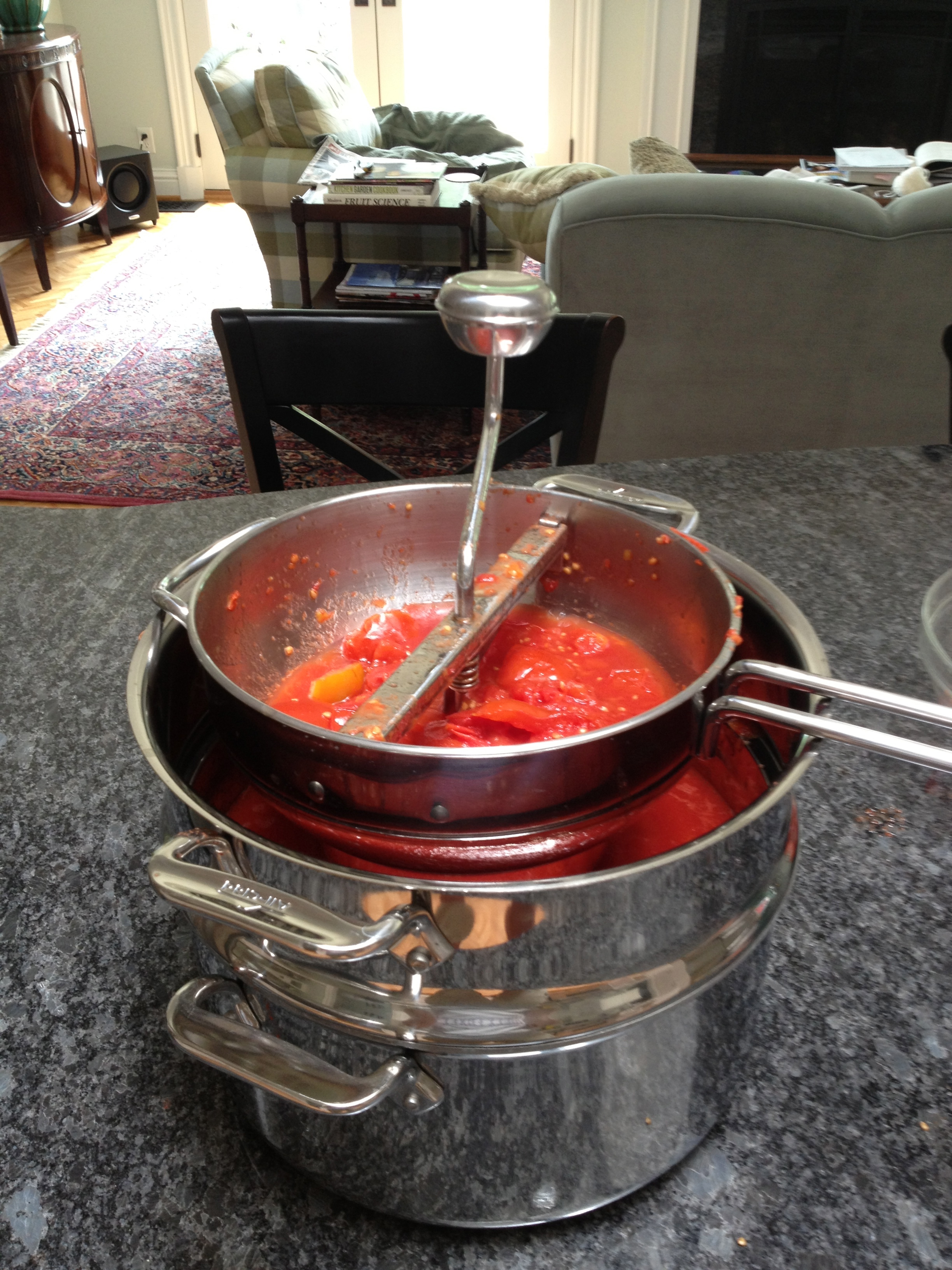 Of course after the tomato/onion combo cooked for the appropriate time, I milled out the skins and seeds and set the results on the stove top to cook down to half the volume which takes hours and hours. Thanks go to Dave and Joyce who helped stir the pot a bit during the long day when I had to run to my job sites!