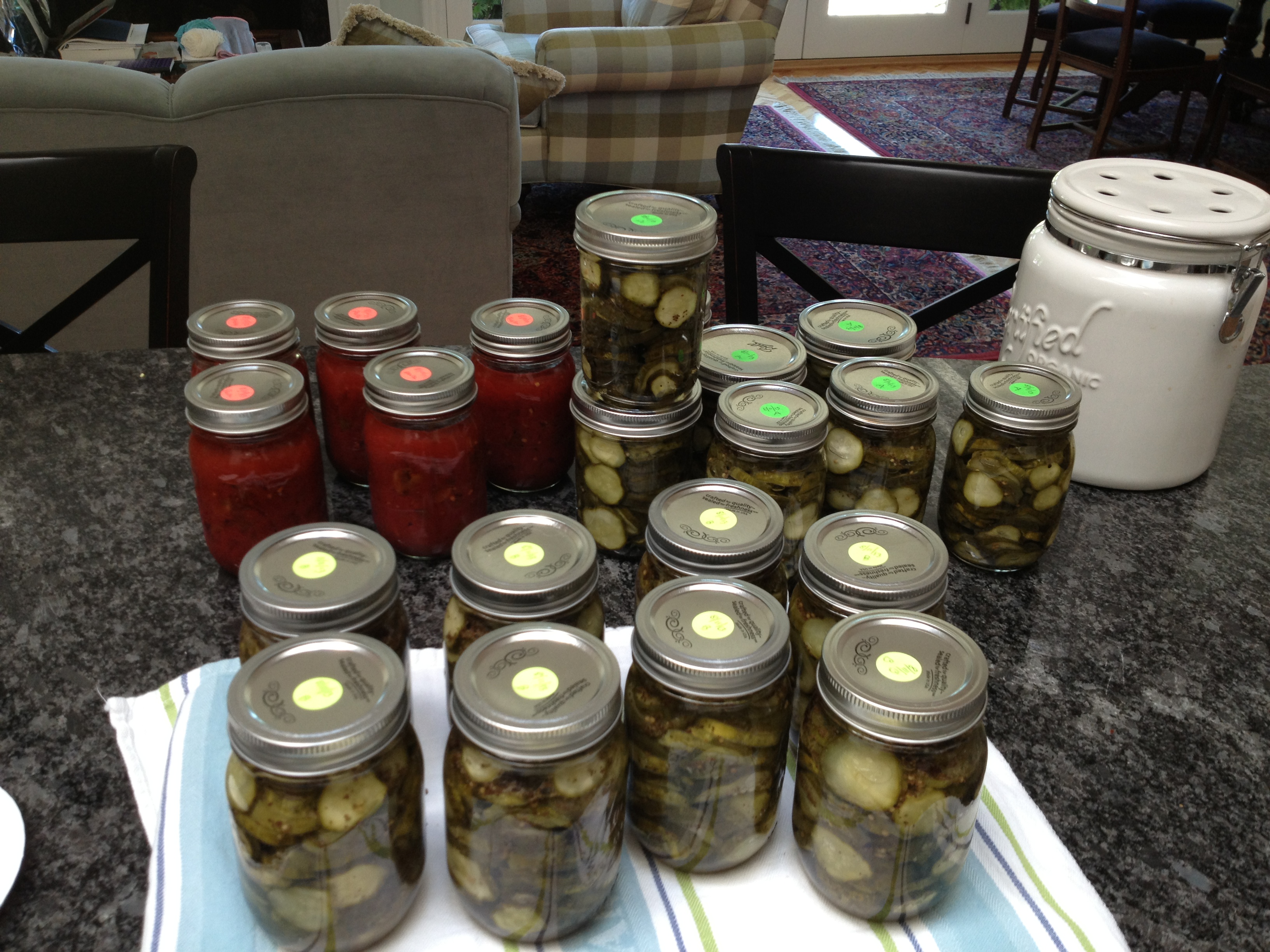 Not sure if I’ve glossed over this, but just to be clear, there are two ways to hot process foods in glass jars. One is pressure cooking which requires special equipment and the other is a hot water bath which just requires enough depth of a pot to submerge a jar of contents in water with at least an inch of water over the top while it boils. The acidity levels of each fruit or vegetable helps to decide which process is safest to use for the best outcome. There are charts and charts of times, sizes of jars and pounds of pressure to read and follow. I never really trust my memory and so I consult the charts and directions each time I work up a batch.