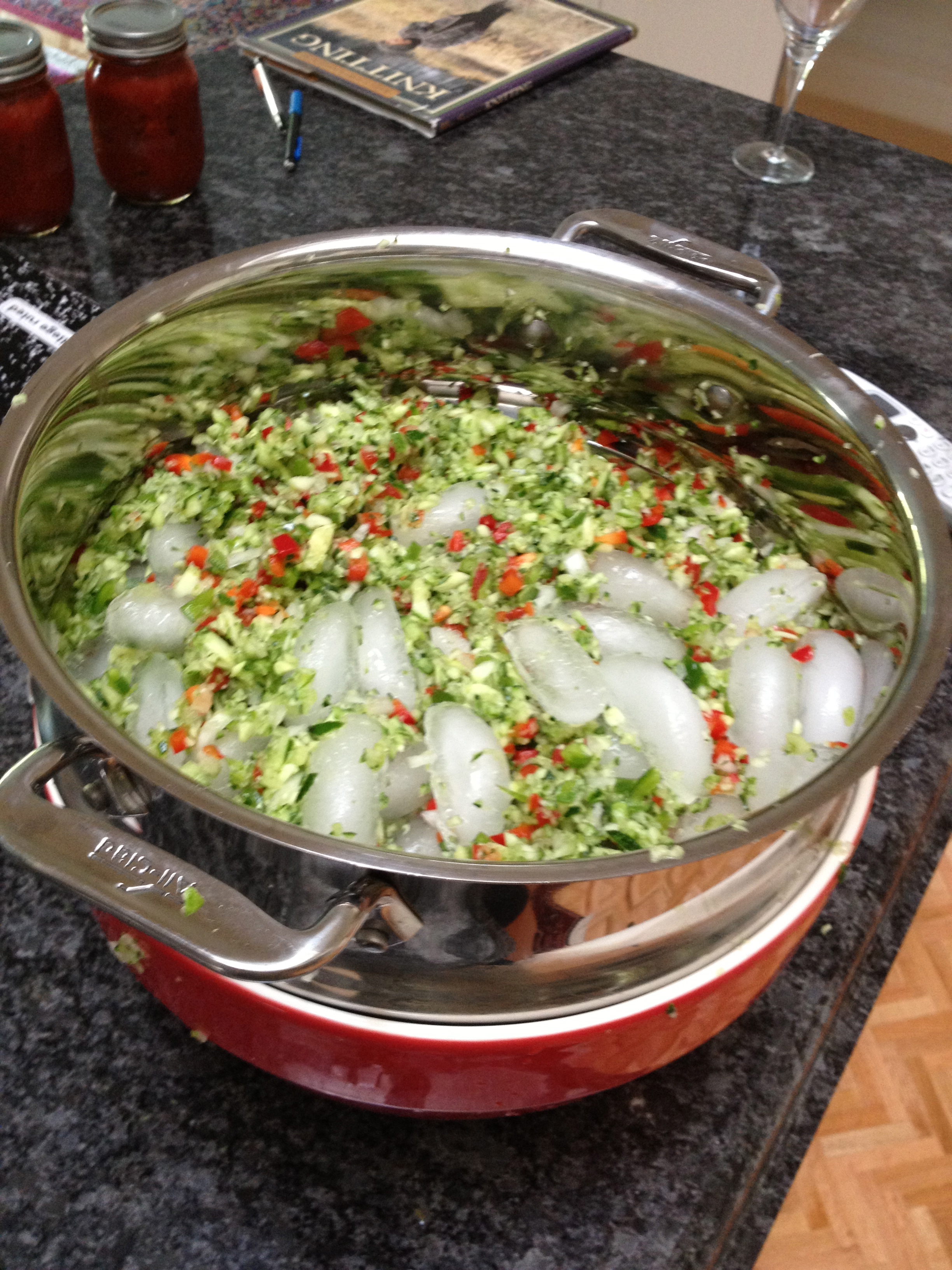 In the mean time, I started to process some cucumbers into some sweet pickle relish from the same recipe I used with success last year. It calls for 6 pounds of diced cucumbers as well as onion, green and red peppers.