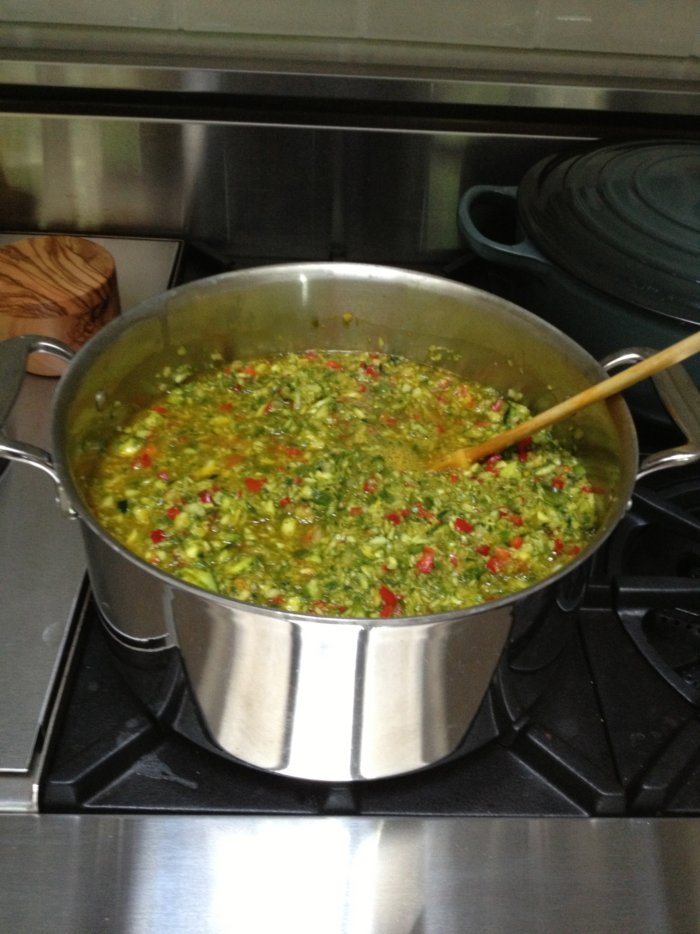 I then put the mixture into the Cuisinart with the metal blade to chop it all finely but it could probably also go into a blender. After this, put it back into its pan and bring it to a boil.