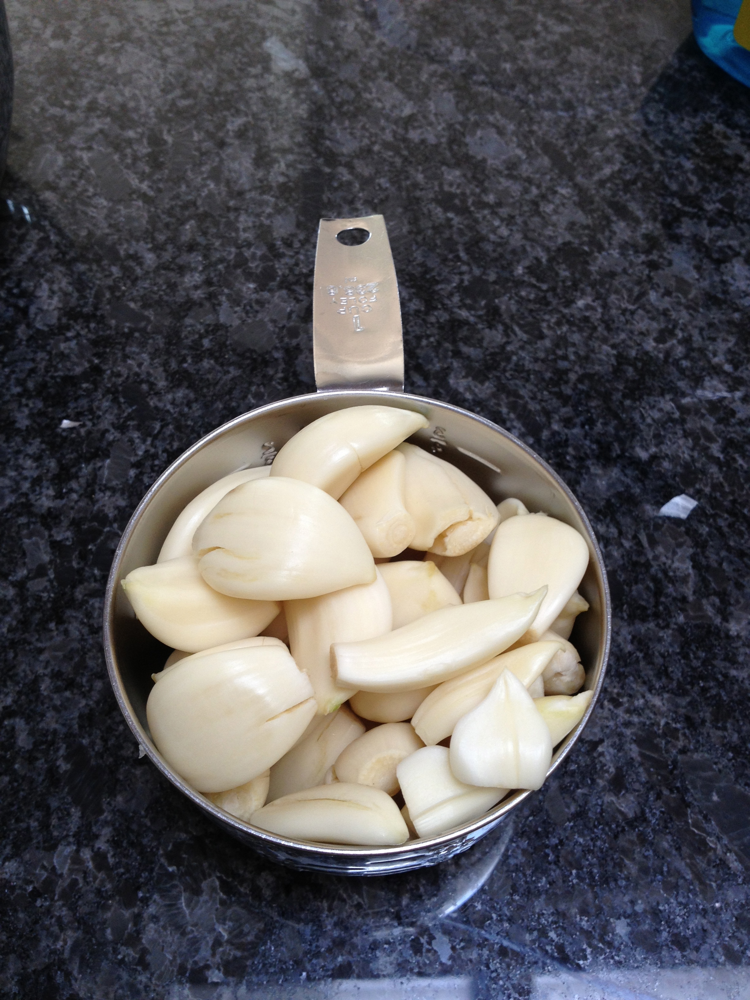 And then I turn my attention to peeling a cup full of fresh garlic. This takes time since there are many, many cloves that make up a cup of garlic!
