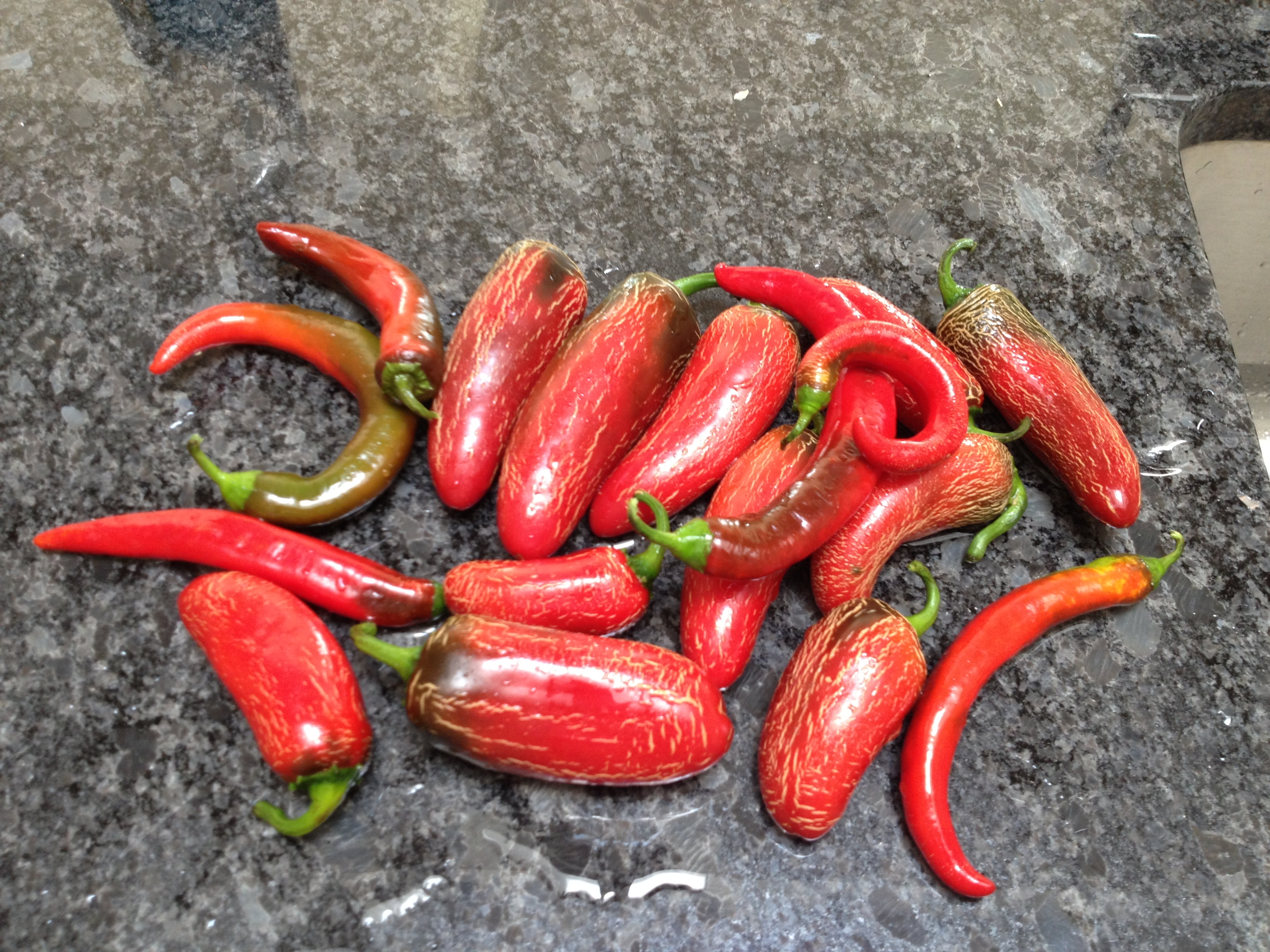 We adore our little red jars of ketchup, but we also have a great affinity (Nancy more than Dave!) for the peppery hot red sauce that I started making last year, called Sriracha. Those of you who read my non-blog previously will be familiar with the process but I’ll repeat it here.