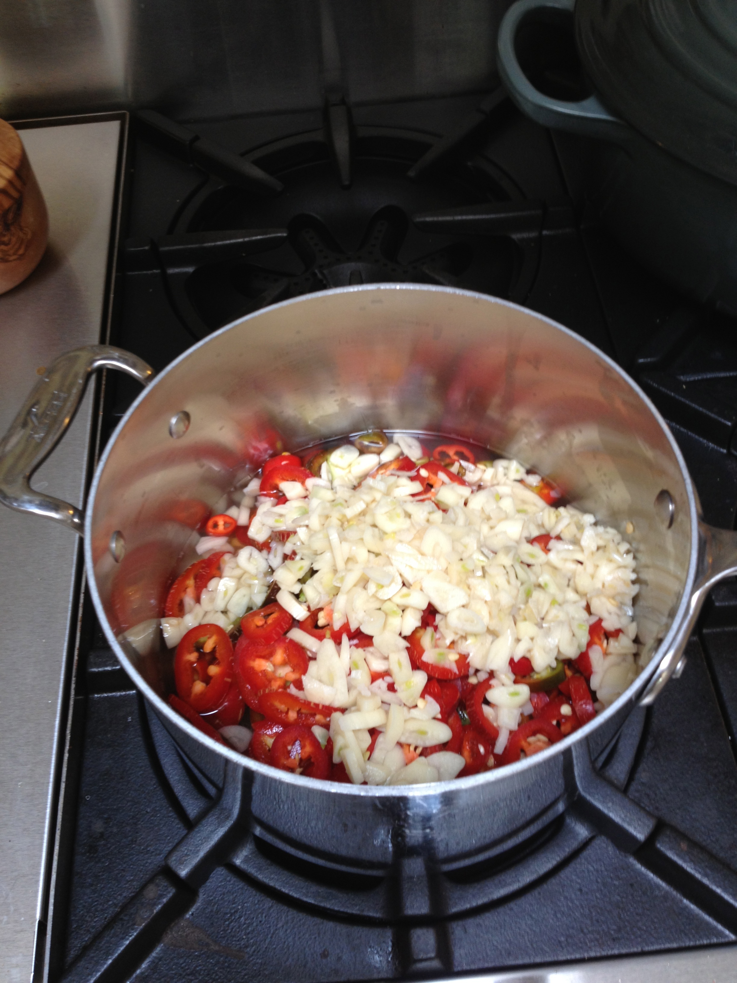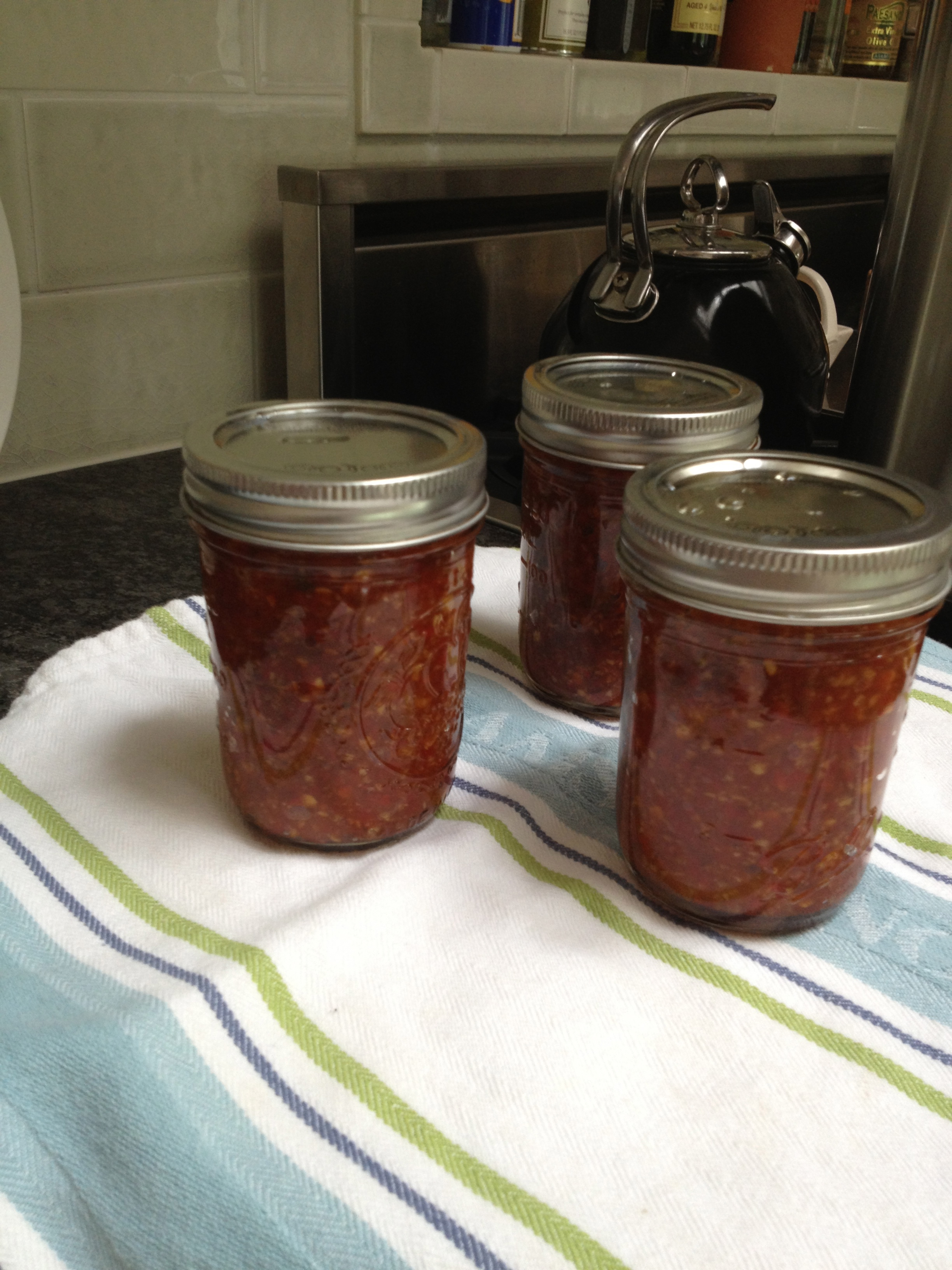 I boil it for 15 minutes or more until it has reduced and thickened. I add a bit of soy sauce and then thicken it all some more with a cornstarch/water mixture before putting the hot mess into jars and processing it in a water bath. After all that work, I ended up with 3 precious half pints of Sriracha!
