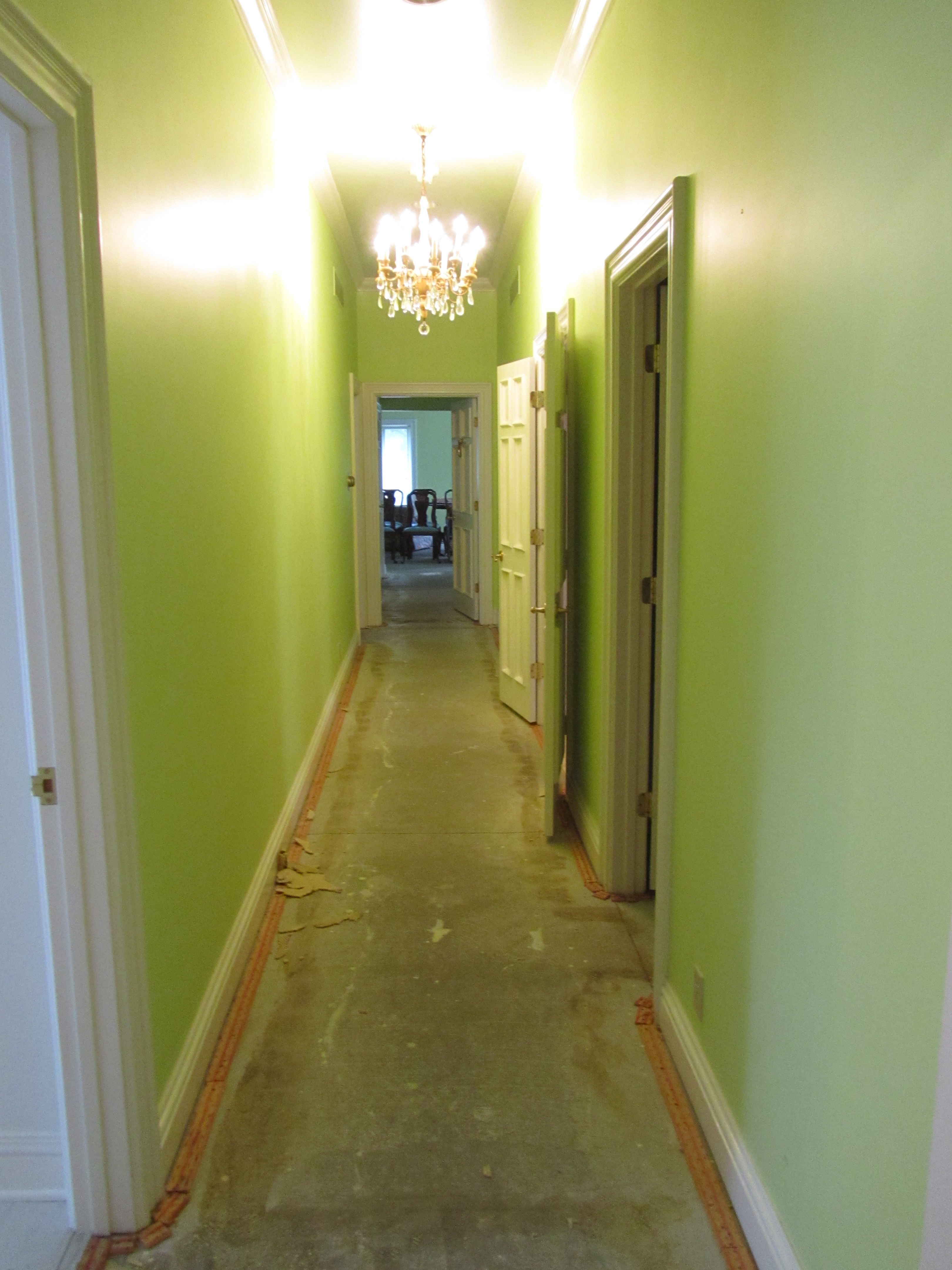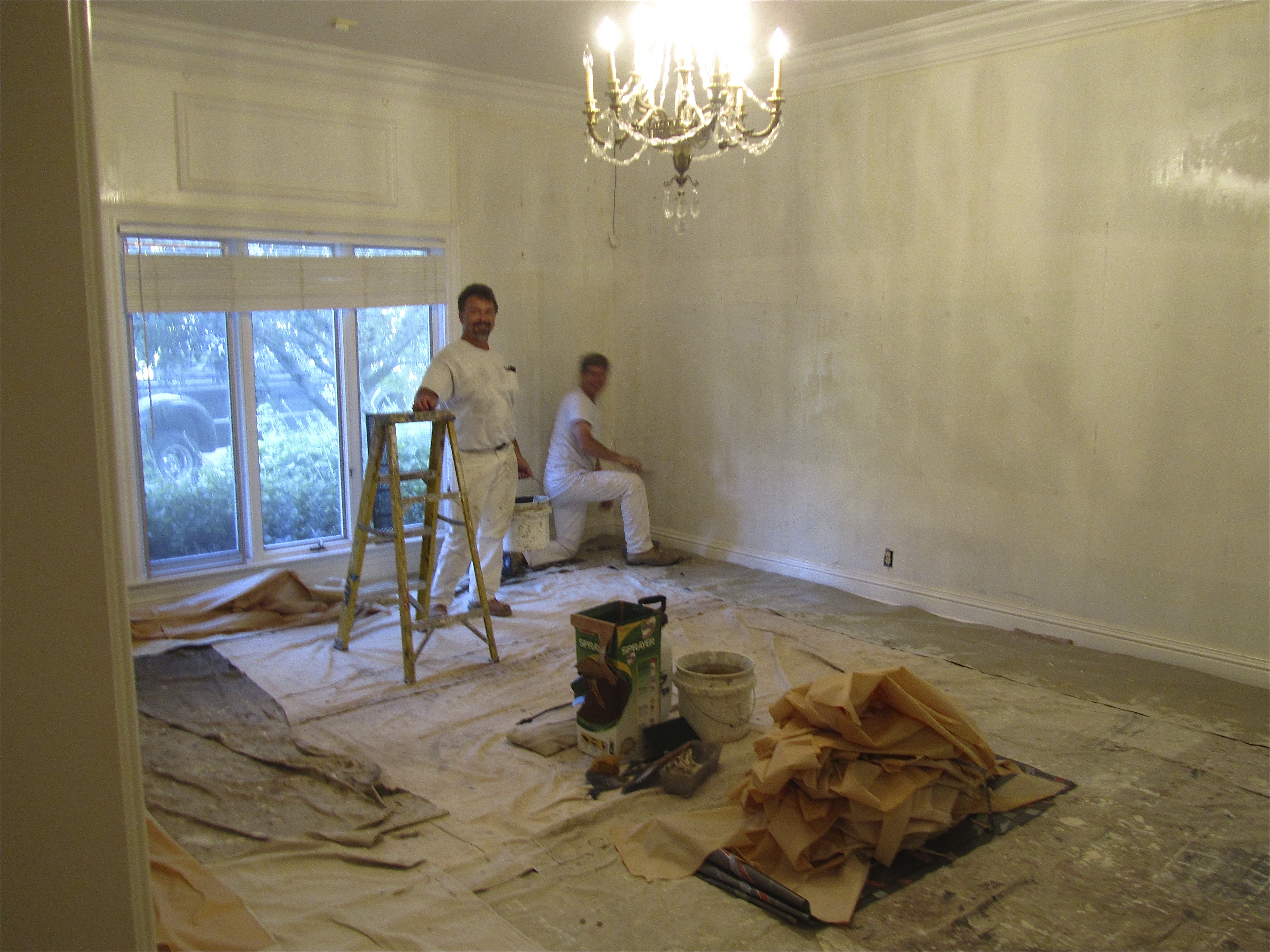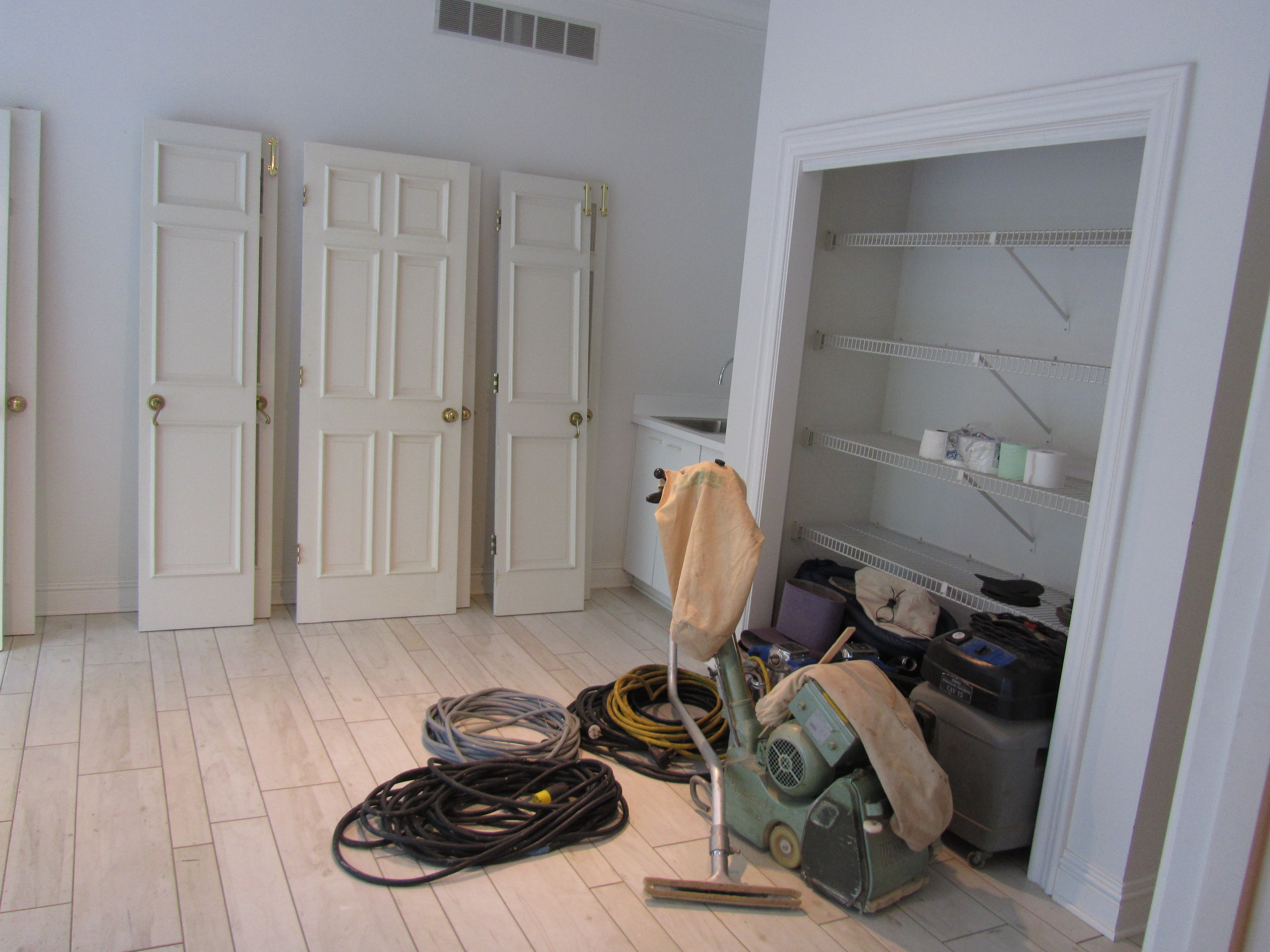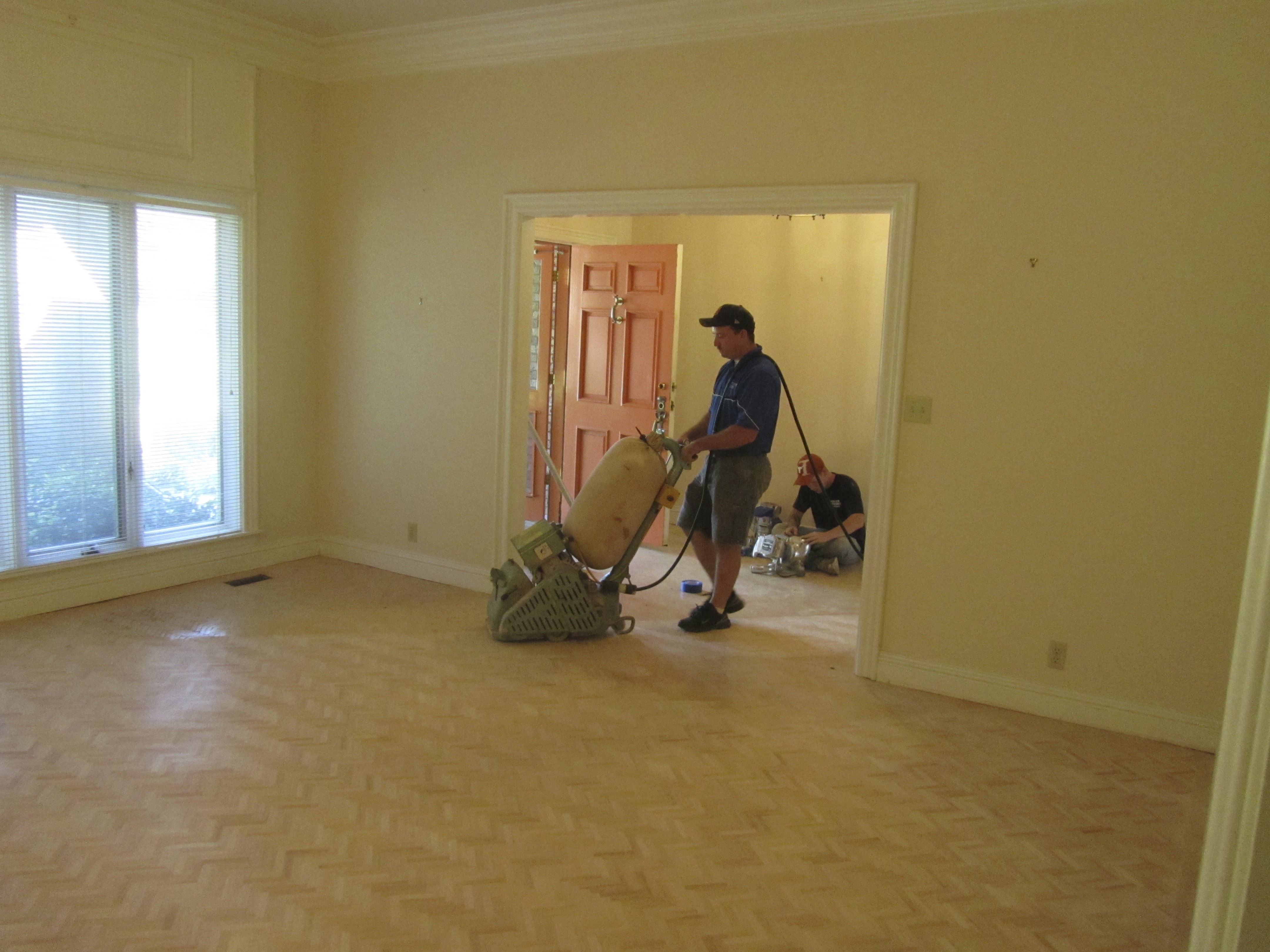 The sad part about the wood parquet was that it was “pickled” or “bleached” to look white, and was severely damaged in many areas from the former owners’ pets. We did not think it could be saved but my great wood floor man, Jerry, was able to restore all of the hardwood to a gleaming finish with restorative results and we then found more of this same raw flooring material in Canada and was able to match it perfectly to continue the pattern in much of the rest of the house as the restoration progressed. Here is Jerry beginning the big job of sanding.