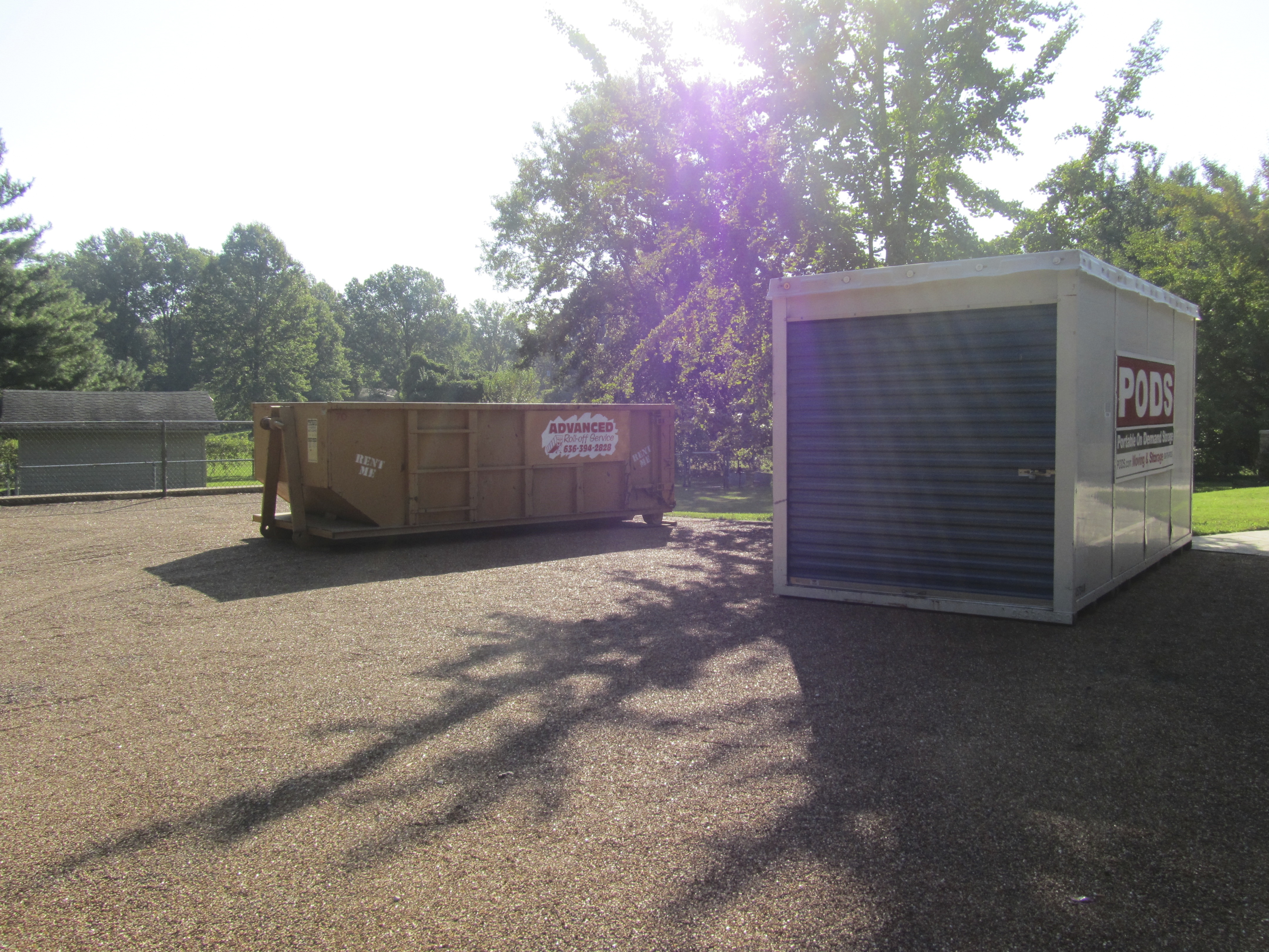 First, we had a dumpster delivered in back along with our POD from the old house.