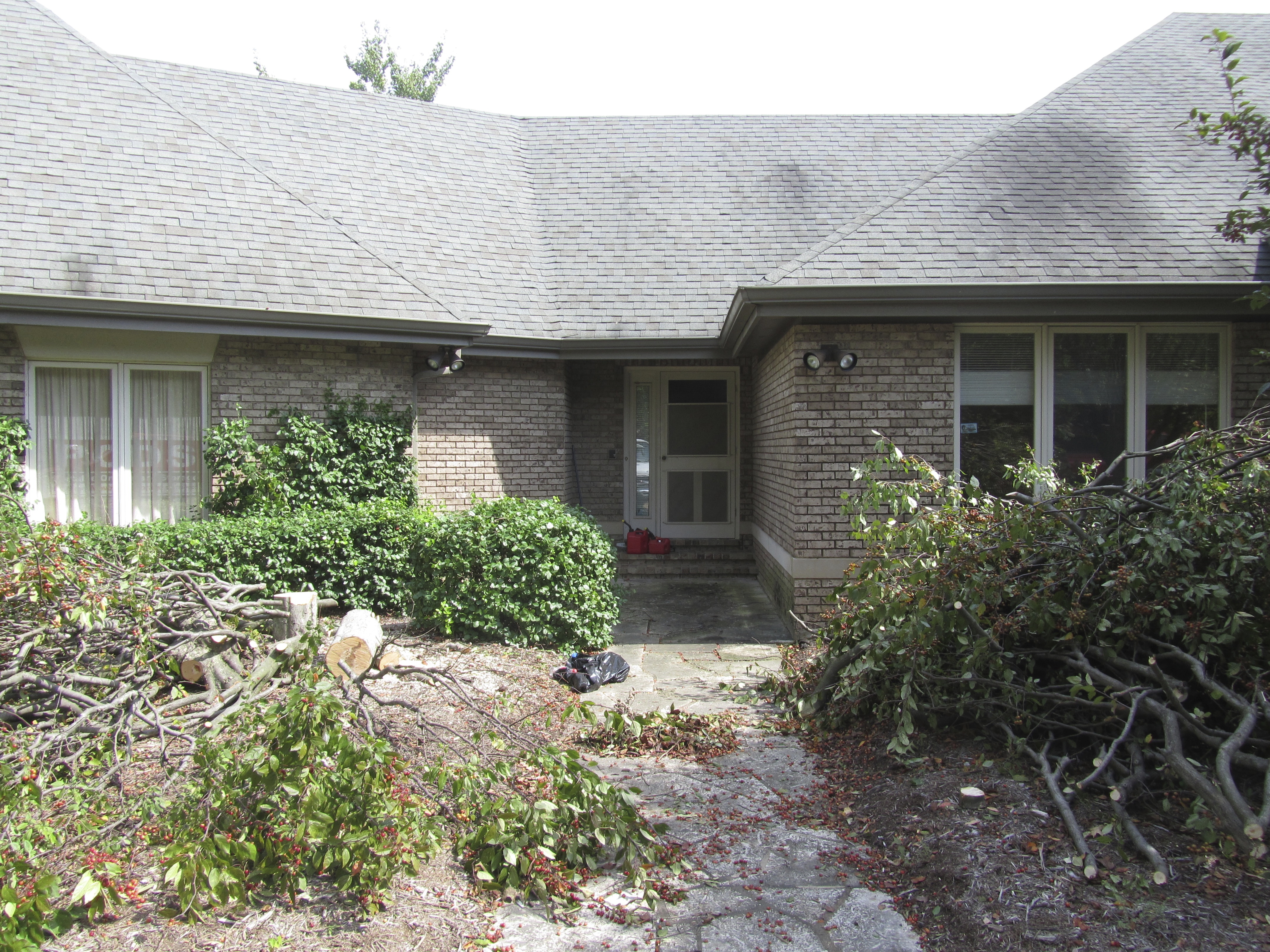 All of the landscaping was overgrown, over mulched and over watered and had to be quickly dealt with to keep the house from further deterioration. Crab Apple trees in front were quickly disposed of.