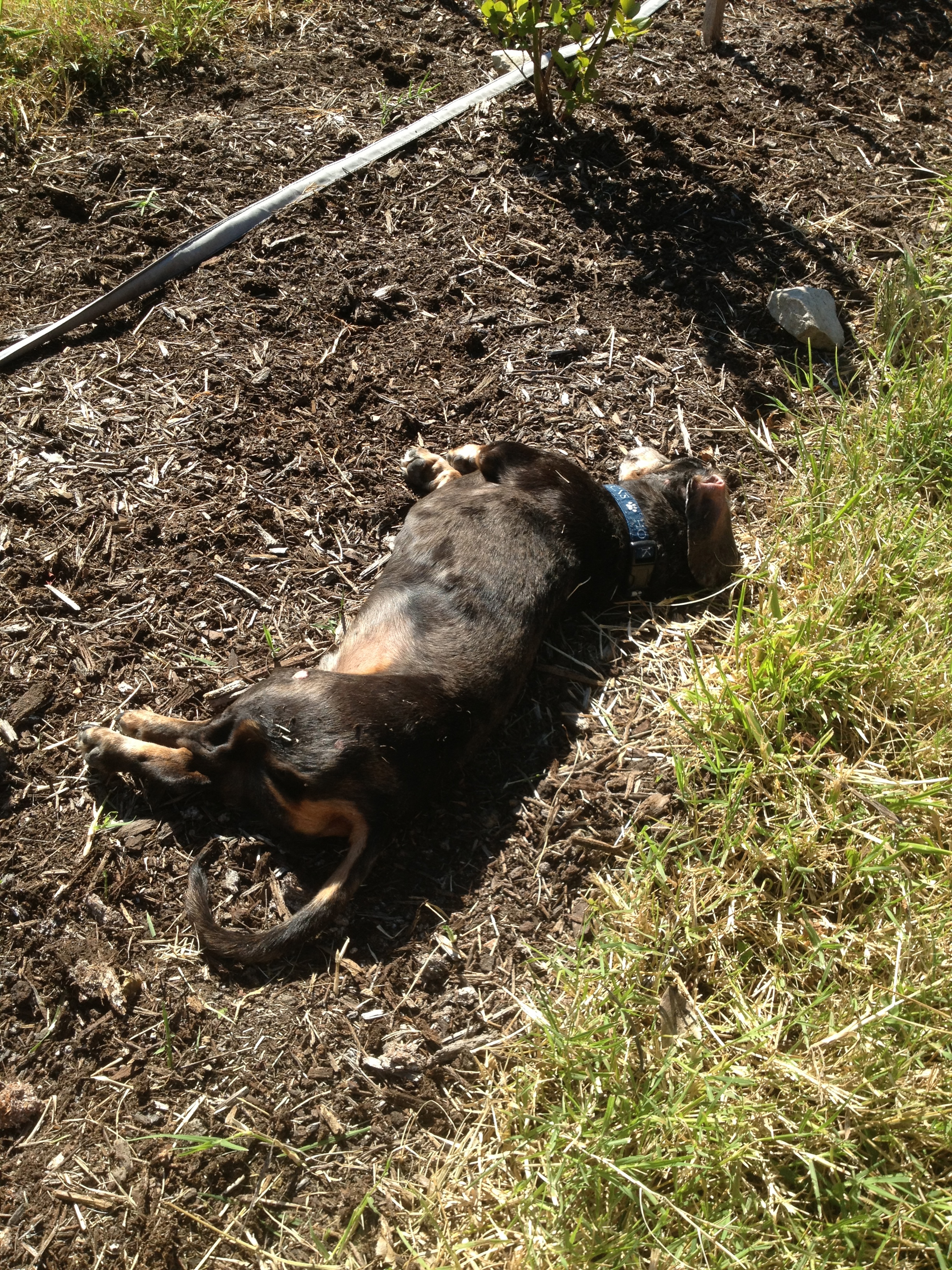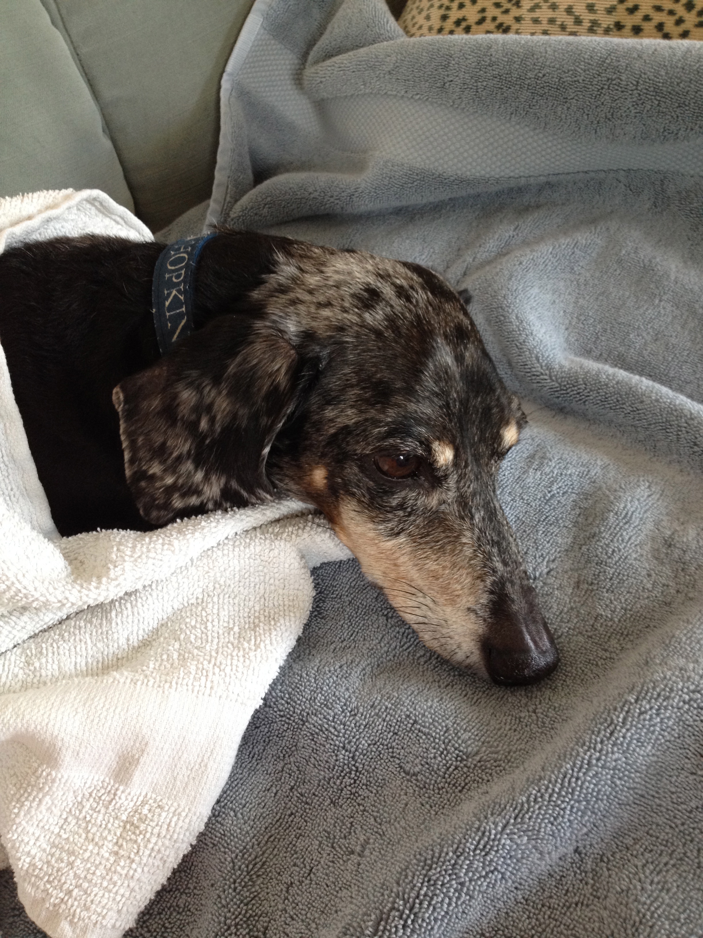 In other news, our little Farley (King of Seven Oaks!), all 12.75lbs of him, is suffering from the back ailment that he had in the spring of 2010. The technical diagnosis is Intervertebral Disc Disease which is common in the long backed Dachshund breed of dogs. As his discs age and deteriorate, the nerves that follow his spinal cord are subject to injury and are inflamed by being pinched. His back legs/extremities suffer the results and he is immobilized (can’t control his rear end). As you can imagine, nothing good comes of this!