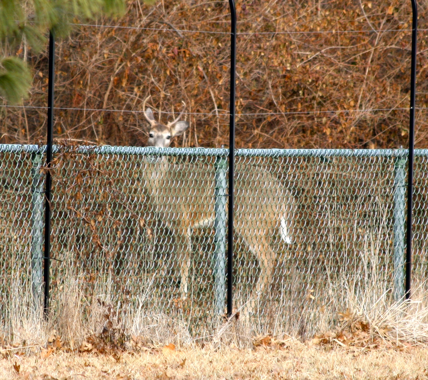 First, we had a sighting of the hobbled deer that I mentioned in the previous post. As you may have noticed by now, we are keen on watching for activity out the back glass and so it was that I spotted a young buck on the north fence alleyway last Monday. He was munching away at honeysuckle and I grabbed my camera and slipped out the back door to observe him, wanting to see if he would challenge the fence or not. He spotted me, stopped eating and looked around to figure out his options. I thought he would dash off along the fence but he hobbled into the woods instead. I managed to get a quick pic but I couldn’t discern any visible damage to his leg other than his odd gait. So here is my crippled deer. I guess I should call animal control? They might just think I’m interested in having one less deer. Well…..