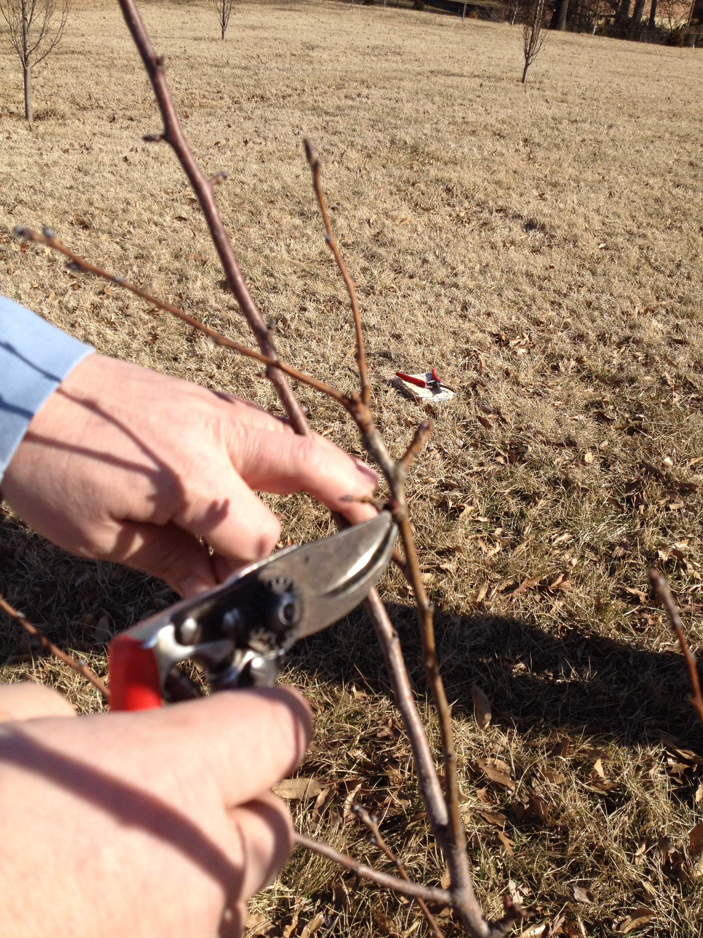 So we spent the morning and early afternoon and with Jon’s help, we evaluated each tree and pruned it appropriately. (Dave keeps a detailed spread sheet which shows each tree position, its name, root stock, bloom time and measurements – both height and caliper as well as how we have rated them over time.) There is so much to learn on this subject since each type of our trees (apple, peach, nectarine, pear, cherry) calls for a different pruning technique. Last year we went through this educational exercise with Jon but each year also calls for a different type of pruning as well so we had different considerations this year from last. It was fabulous to review each tree with him since we could easily identify the cuts we made last year and see the response in terms of growth that happened since then. Although we see these trees all the time when we are out in the field, it is so interesting to look at them through Jon’s eyes and to better understand the full growth/maturity plan as we worked with him. Of course we had our alcohol cleansed clippers at the ready and will continue to keep them clean and sharp for any intermediate cuts that need to be made before next year.