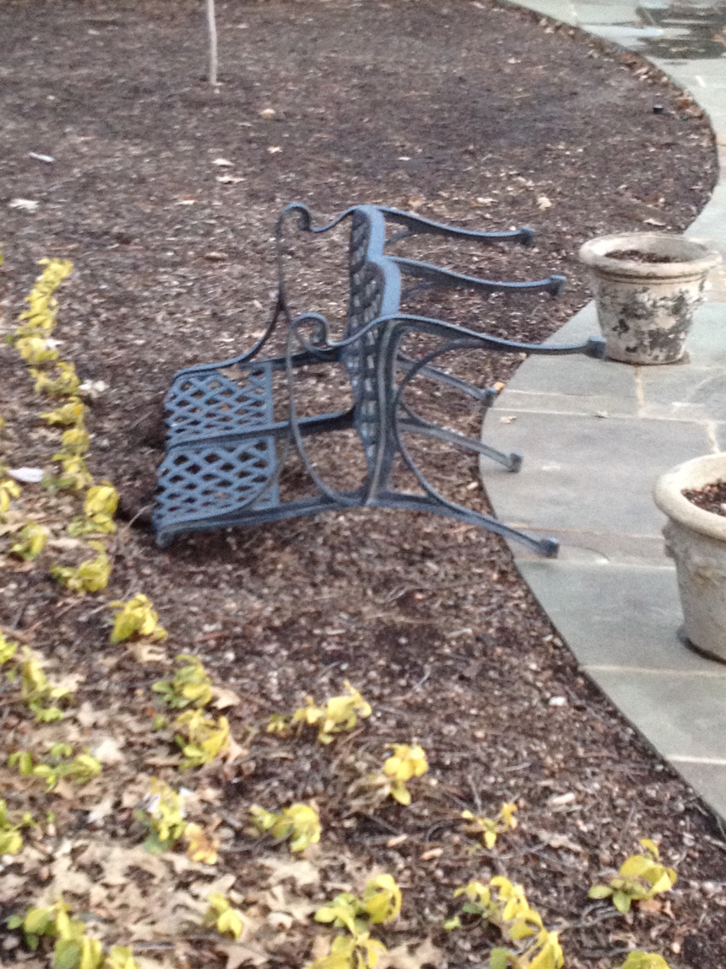 We had decent weather until Thursday afternoon when a terrific storm kicked in with high winds and brief, but torrential rain. The wind was blowing at more than 50 miles per hour and got so bad that at one point we looked out the window and saw one of our wrought iron benches had BLOWN right over!