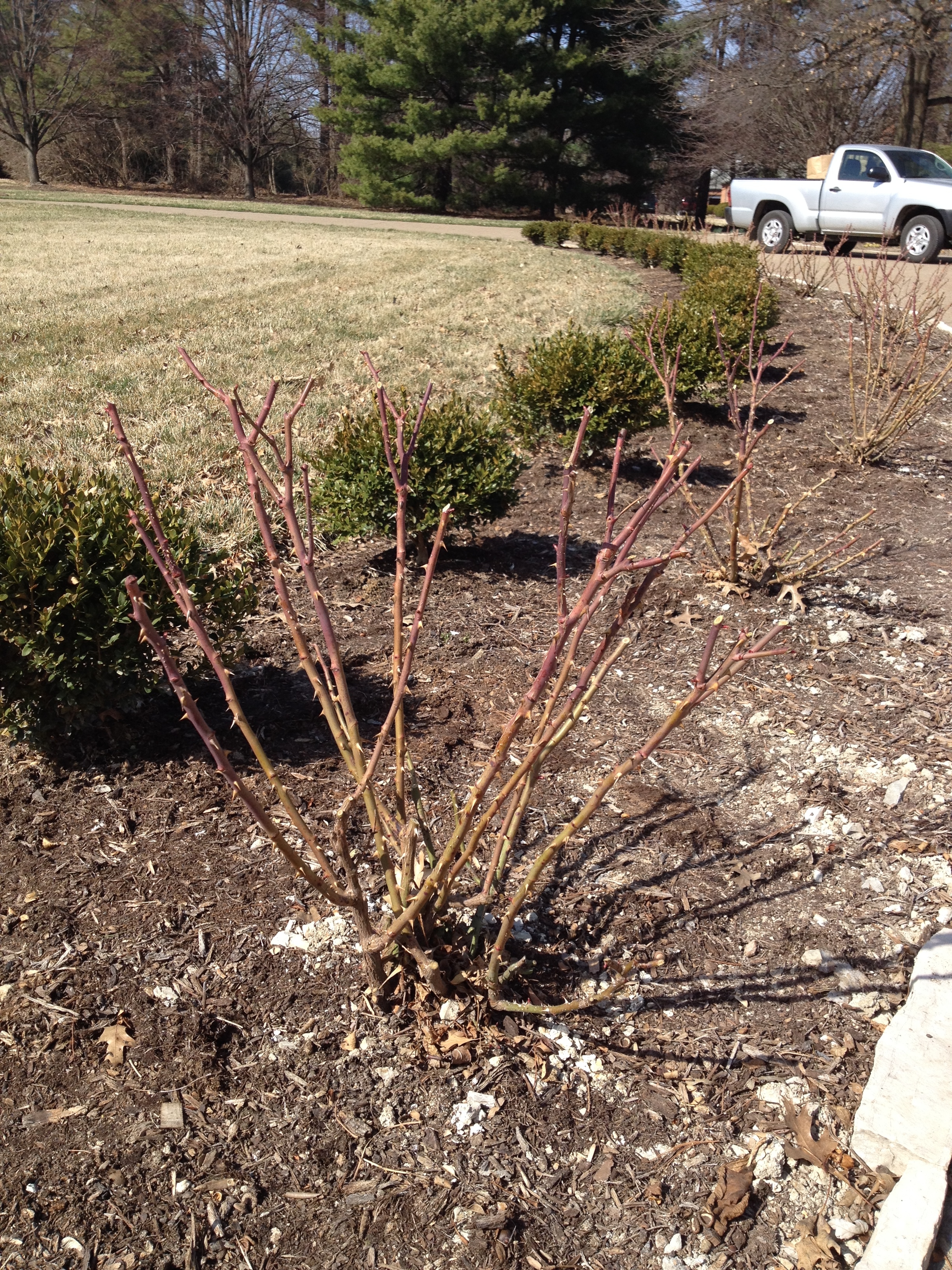 We also started the rose pruning today. We had been holding off on this prickly chore due to the long winter and late spring, but their leaf buds are sprouting and we have so many rose bushes to tend to that we started on the first 16 today and will tend to the remaining 29 another day. They looked naked after we were finished! Our roses are all the Double Knock Out variety which are very hardy and bloom all summer until frost so we typically give them a pretty aggressive pruning so that they don’t become too leggy by the end of the season and this year was no exception.