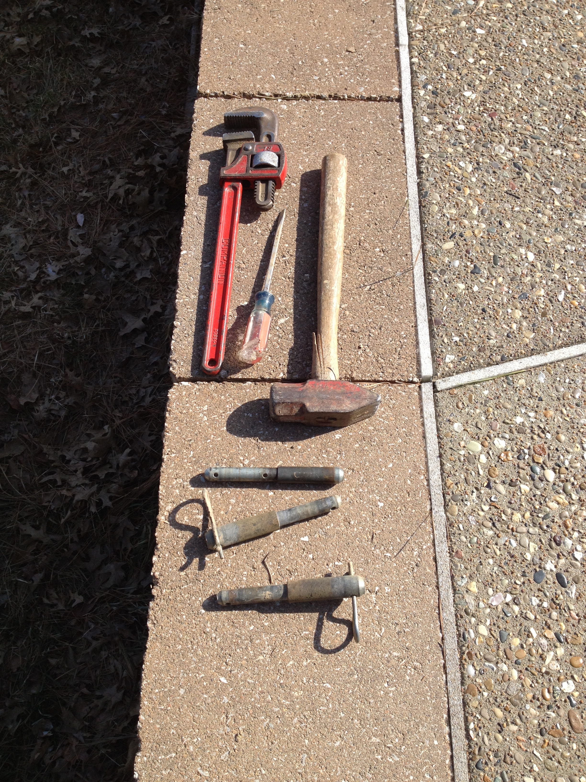 So the plow was the attachment of choice today but it meant changing out one of the other pieces of equipment which is not as easy as you would think. Dave has gotten much faster at this, but it always helps to have an additional pair of hands and some tools to accomplish this, especially for the first time in the new season when things have been sitting out in the elements. (The tractors has a parking spot in the garage but at this point the other features do not.) Here are the tools of importance when taking the connecting pins off and on between the hitch and the implements. Our favorite is the big, red, metal hammer which we call “The Persuader” since it is used to finagle the pins in and out of position.