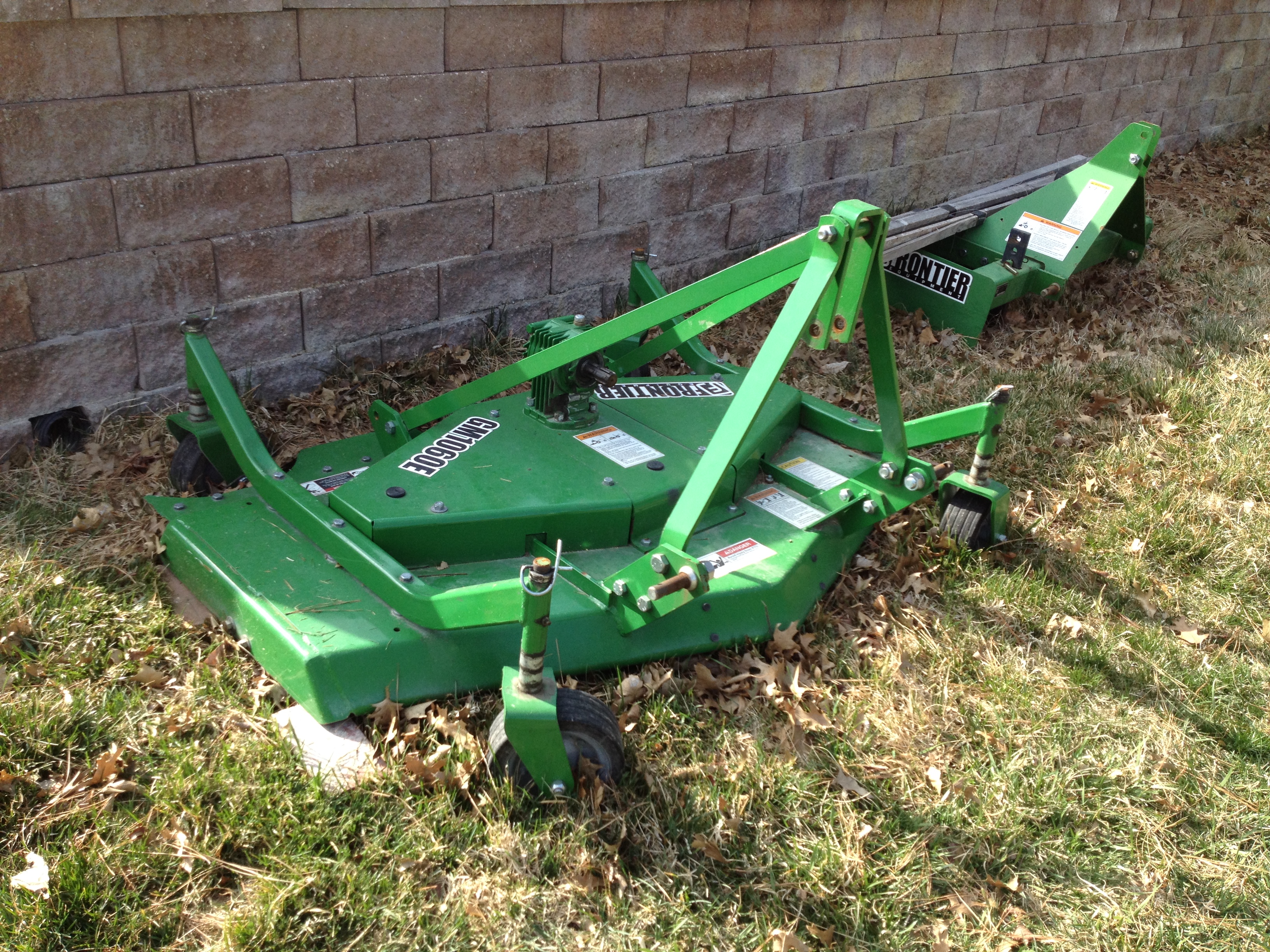 As everyone knows, we bought a John Deere tractor after we moved to the farm which is something that has made life easier in so many ways, but it also gives us a whole new challenge when it comes to switching around the implements we use with it. Our tractor is equipped with a PTO or Power Take Off which is a drive shaft that spans the distance between the tractor and the rear implement. I always thought PTO meant ‘power train operation’ since this is what comes to mind when I consider how this operates. Anyway, the PTO transmits power and torque from the tractor to the implement you are dragging behind when that piece of equipment needs to rotate. We have four rear attachments for our tractor: a mower, a tiller, a box blade, and a plow. (We also have a front loader which is used to move dirt or plow snow, but that is another story.) The mower and the tiller use a PTO since their blades require power to operate where as the box blade and plow are just dragged along behind and only raised and lowered to accommodate their use. Since we cut all of our own grass, the mower is used constantly all summer long and is helpful to us because of the width of the cutting swath and the fact that when it cuts it also mulches the grass. It looks like this.