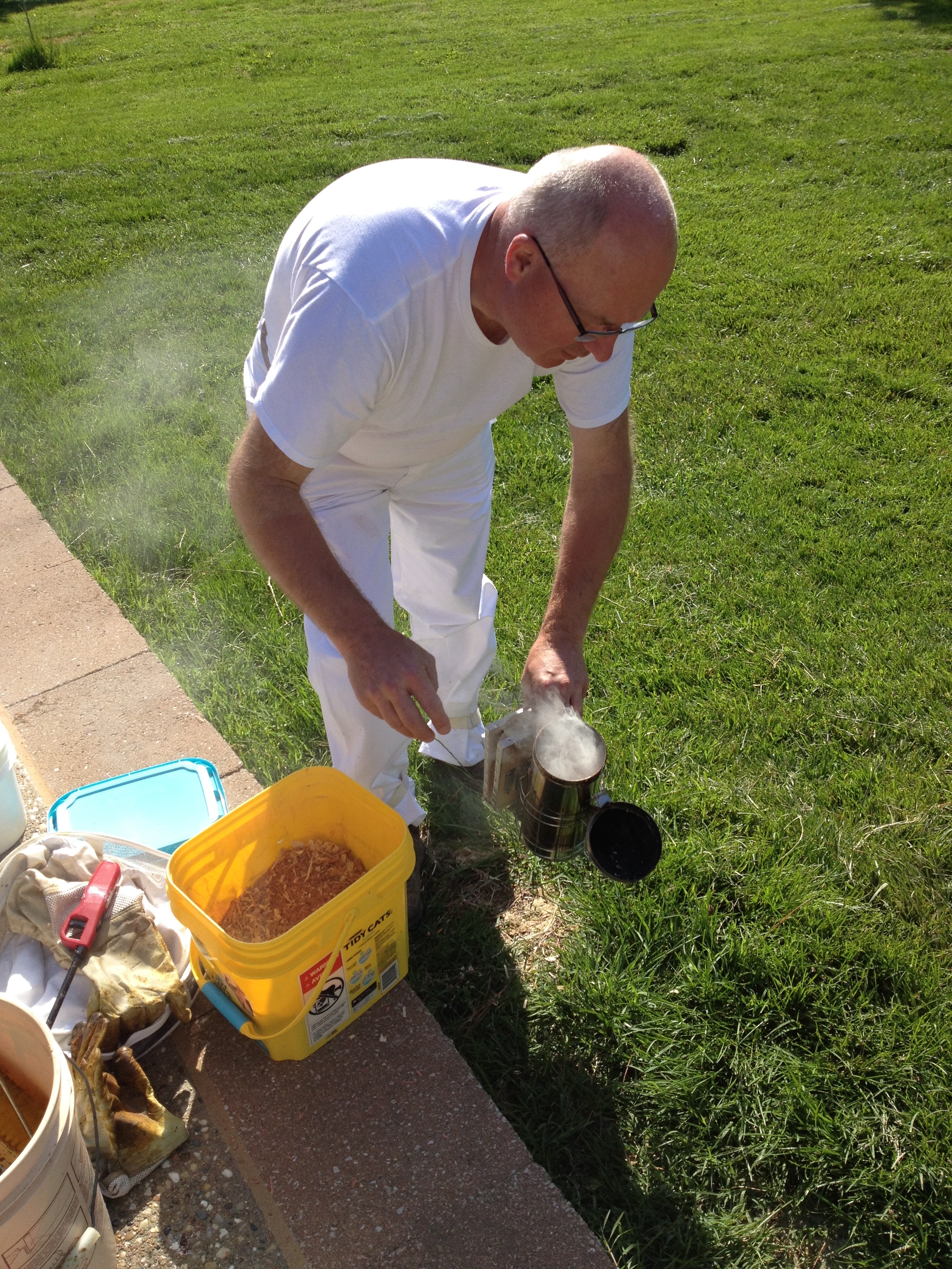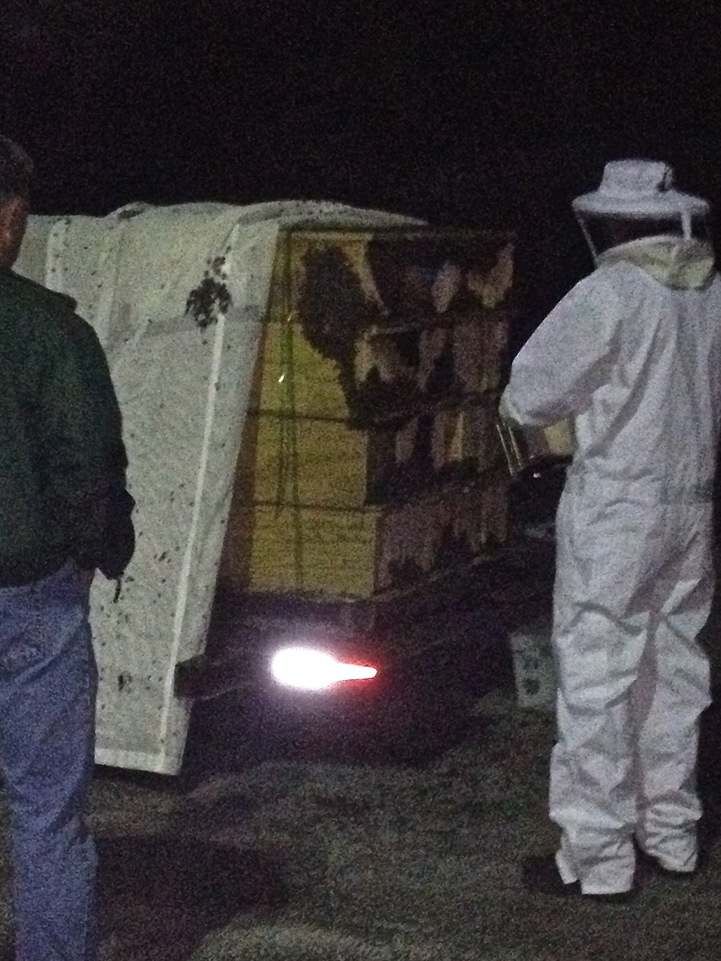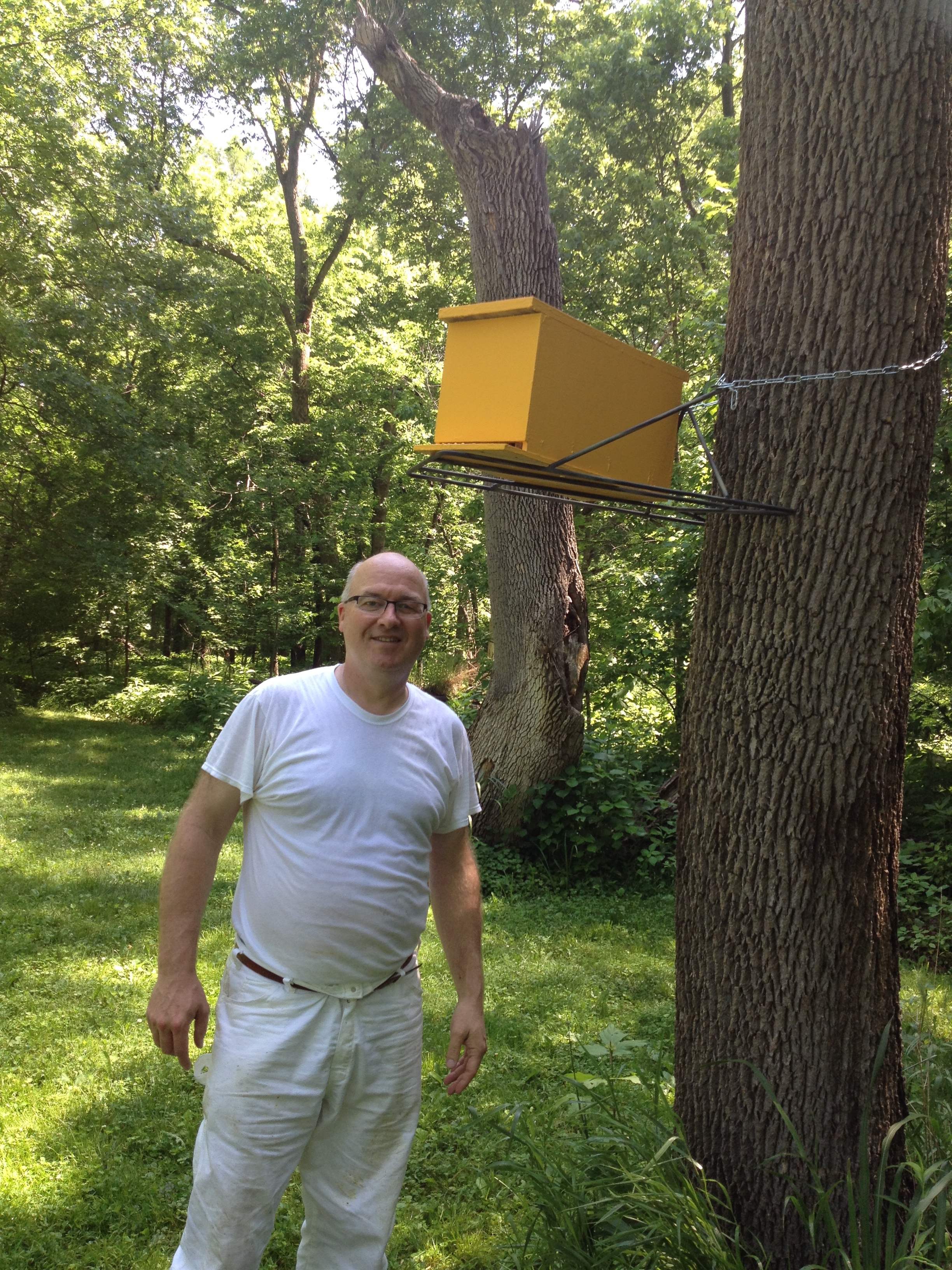 After we finished up with these hives, we continued on to his other locations around town and found some good news at one hive in particular where Jurgen had tried a little experiment. He hoped that a queen would develop out of a swarm cell that he had placed in a queen-less hive and he found that he was successful! Not only did he spot the newly laid eggs to indicate that she was laying brood, but he also found the young queen herself which made him very happy! This is how good beekeepers work to expand their colonies. He also decided to add a swarm catcher to one of the locations so we took a break from our bee suits to walk around and find a place to hang the bracket up in a tree. A nuc box with bait for the bees completed the set up. This swarm catcher could attract a wild colony or also one of his own colonies that might decide to swarm. I think Jurgen is smiling because he is taking his beekeeping skills to a new level.