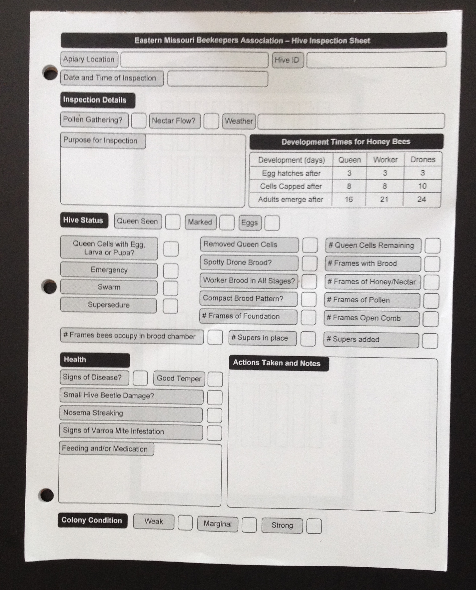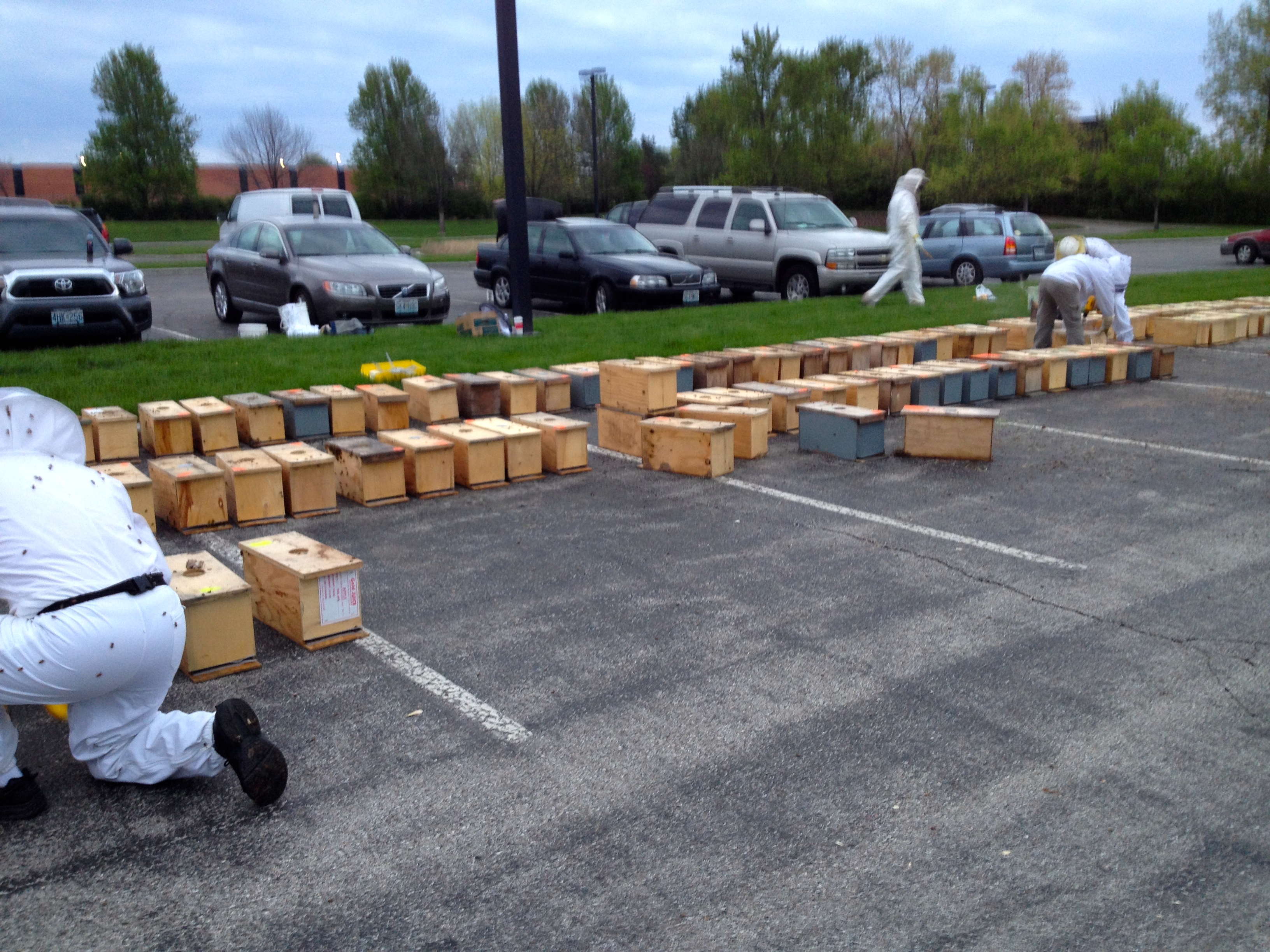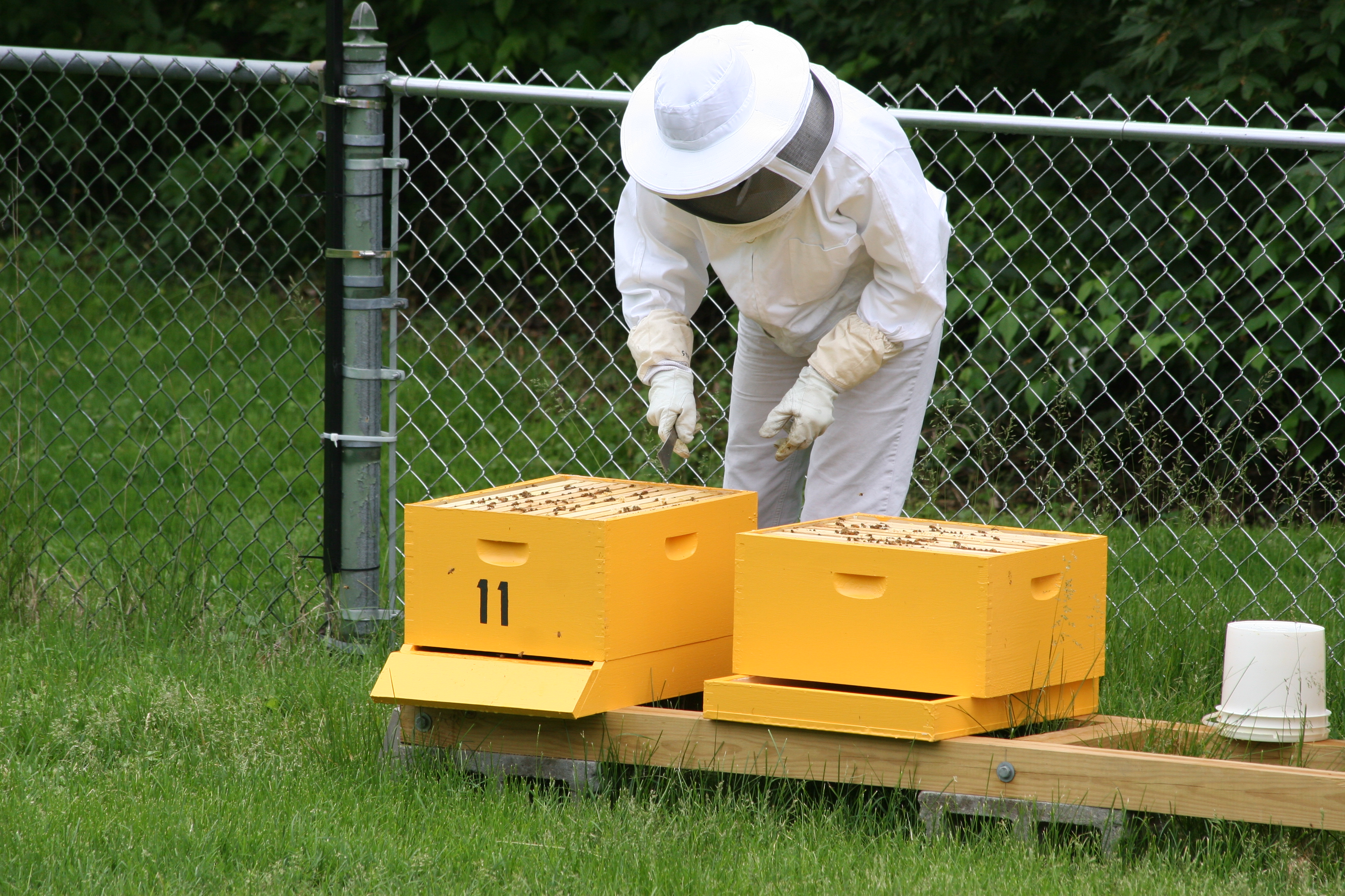 After we finished up with these hives, we continued on to his other locations around town and found some good news at one hive in particular where Jurgen had tried a little experiment. He hoped that a queen would develop out of a swarm cell that he had placed in a queen-less hive and he found that he was successful! Not only did he spot the newly laid eggs to indicate that she was laying brood, but he also found the young queen herself which made him very happy! This is how good beekeepers work to expand their colonies. He also decided to add a swarm catcher to one of the locations so we took a break from our bee suits to walk around and find a place to hang the bracket up in a tree. A nuc box with bait for the bees completed the set up. This swarm catcher could attract a wild colony or also one of his own colonies that might decide to swarm. I think Jurgen is smiling because he is taking his beekeeping skills to a new level.