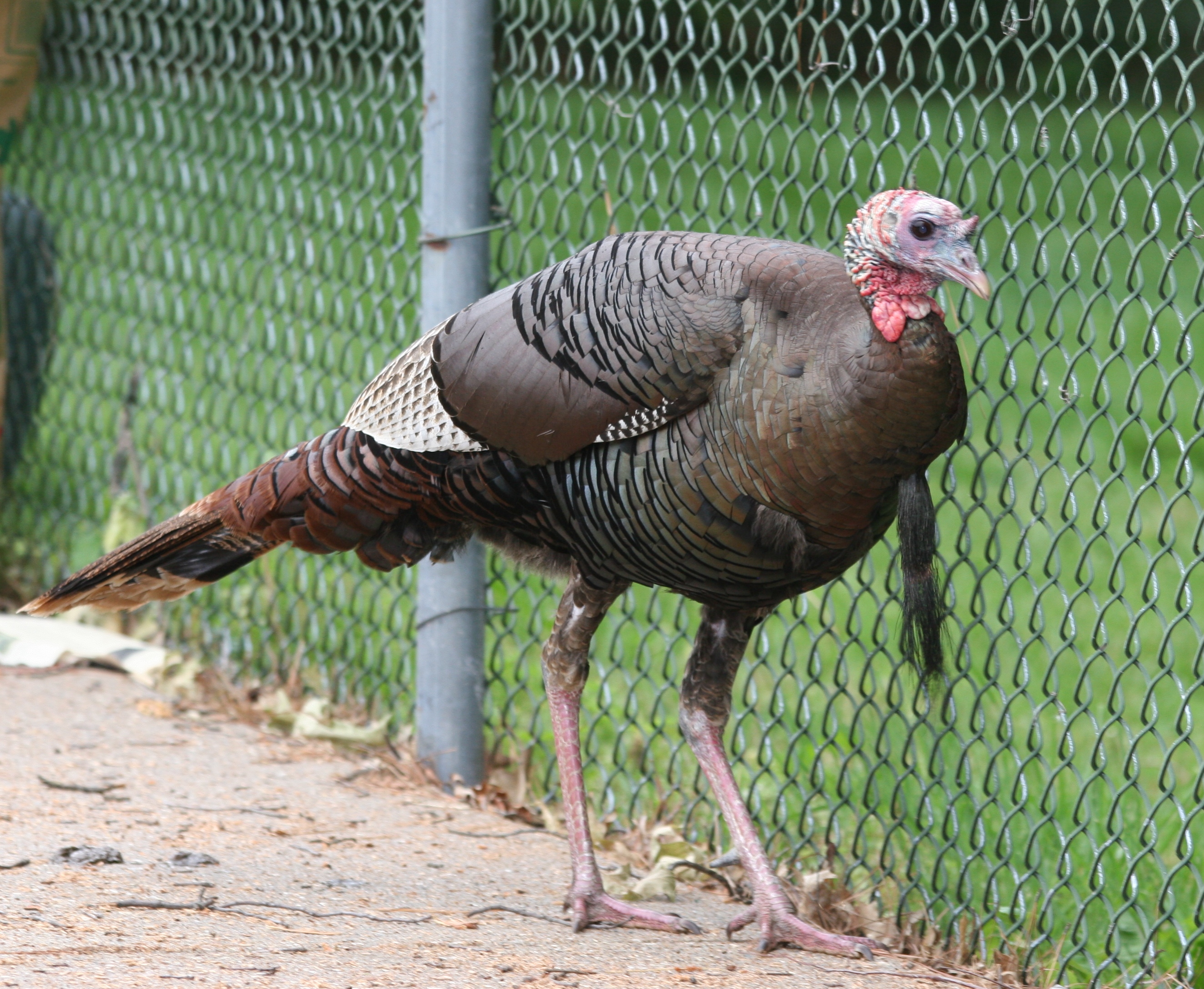 The turkeys are making their presence known and although we see lots of them browsing about, this big tom was available for a nice photo as he found himself in a corner against the fence before gathering enough energy to fly up and over the roof of the house to get away.