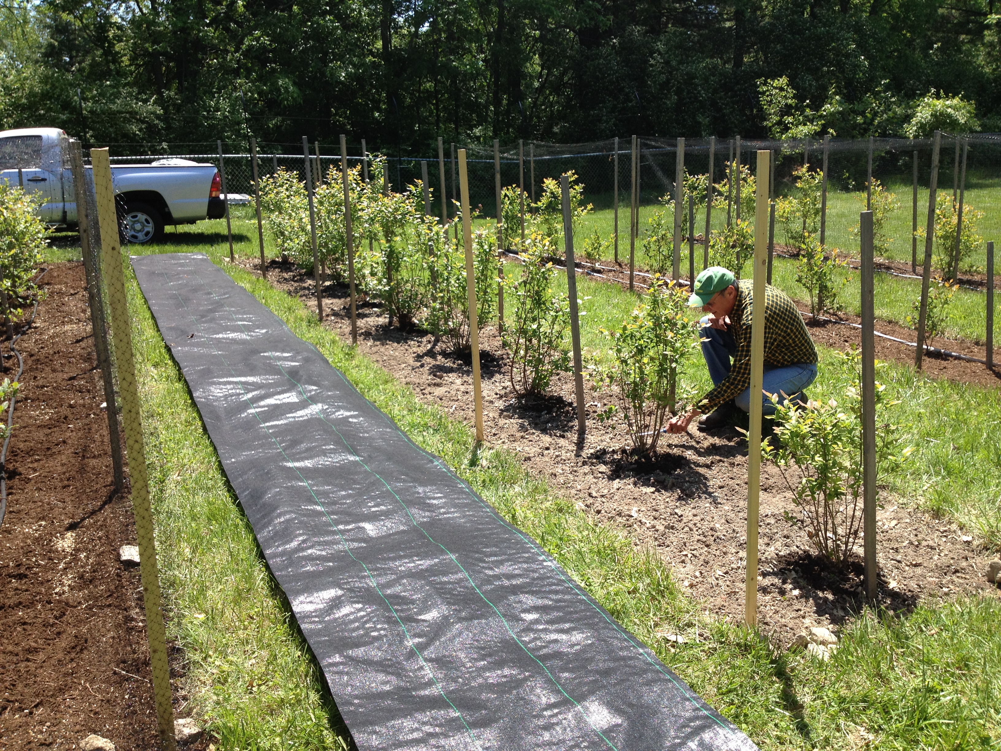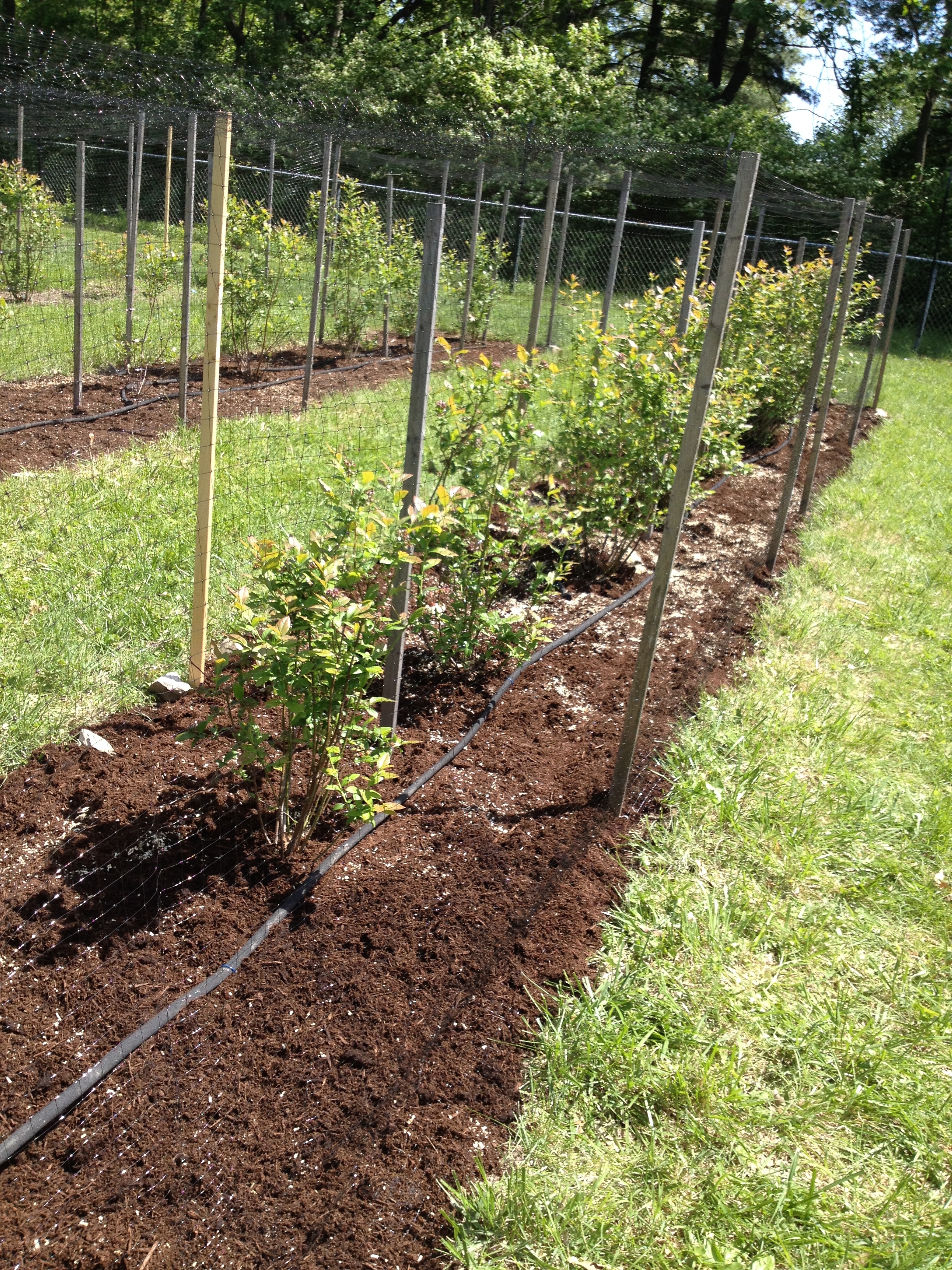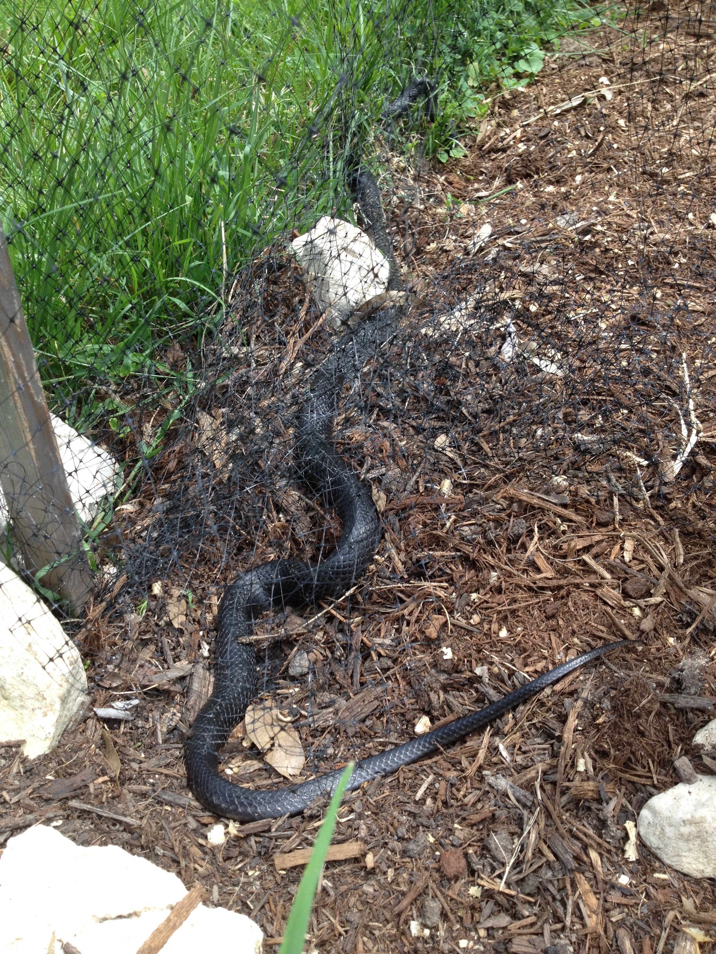 The last blueberry row has finally been thoroughly weeded and mulched so we added the netting today but not before two black snakes, (Romeo and Juliet?) found themselves entangled in the blueberry netting at either end of the same row. Unfortunately, like so many other black snakes before them, they were not able to extricate themselves from the netting. I think they are attracted to the black soaker hoses that we have laid out in the rows. We are sad to have lost two more of these since they do their bit here by helping to keep the small rodent population in check.