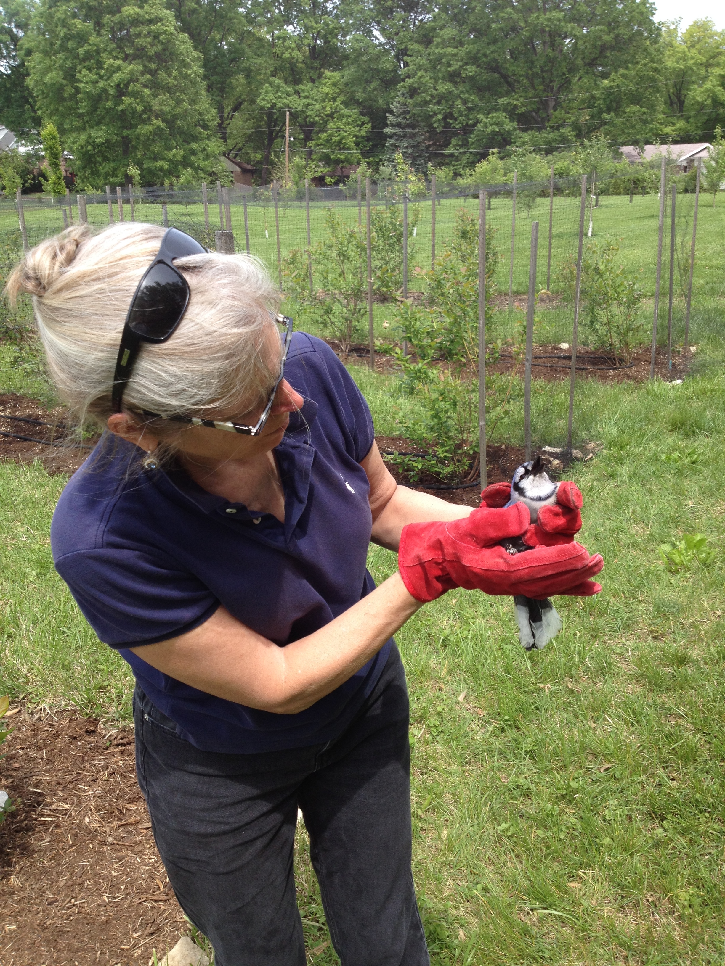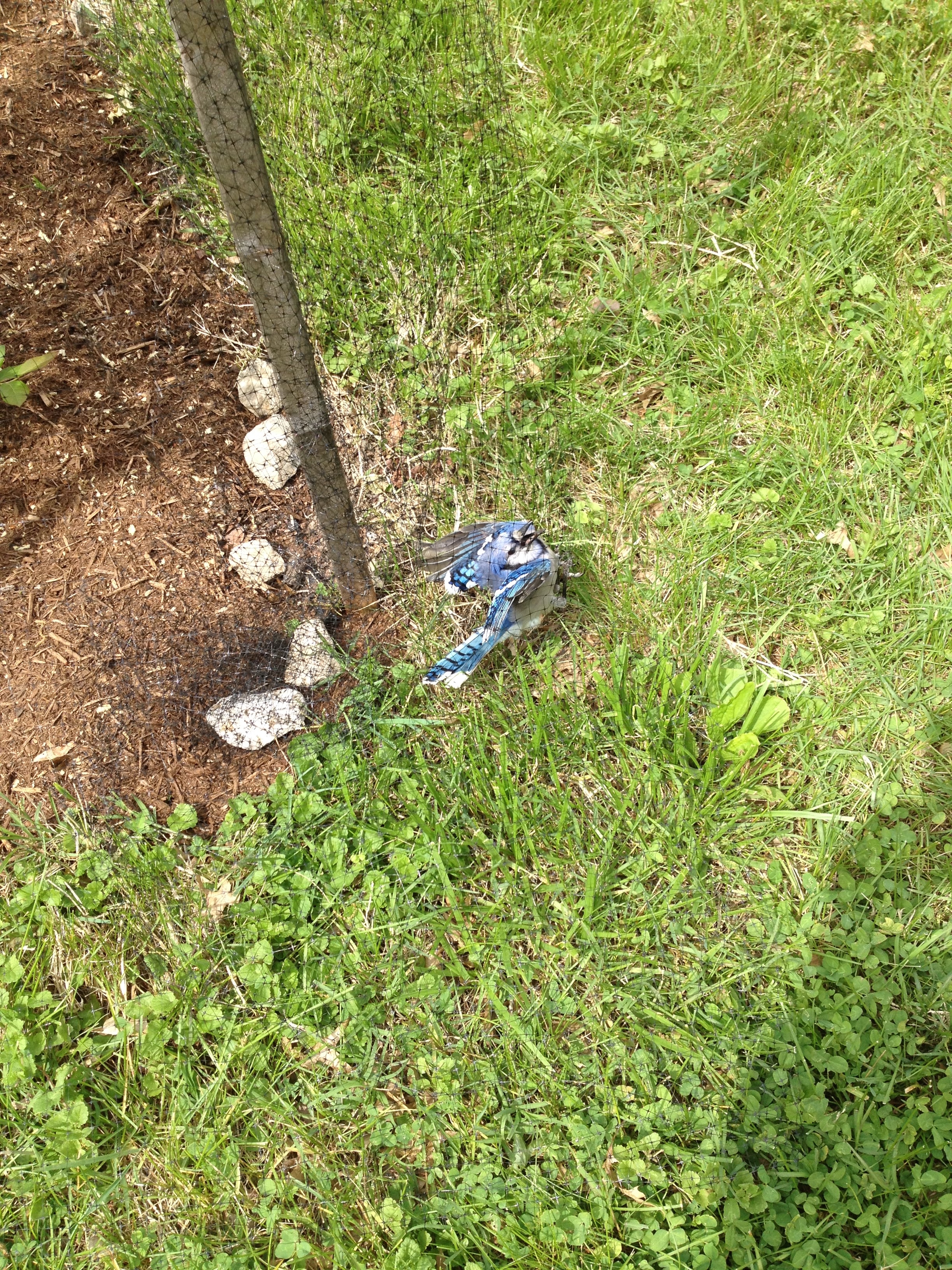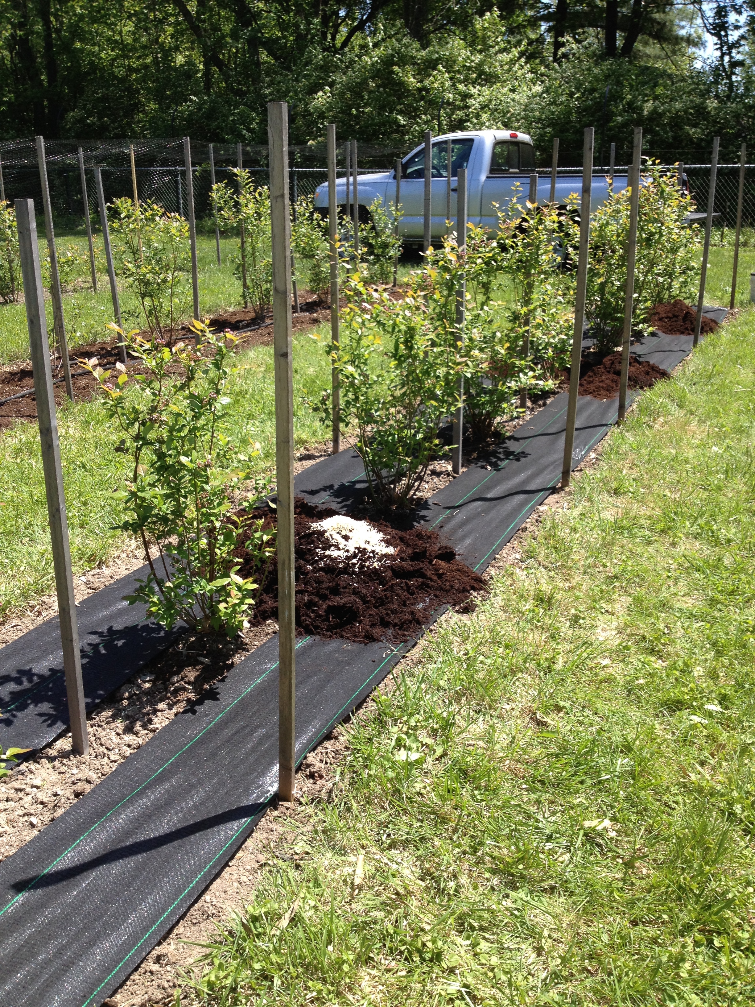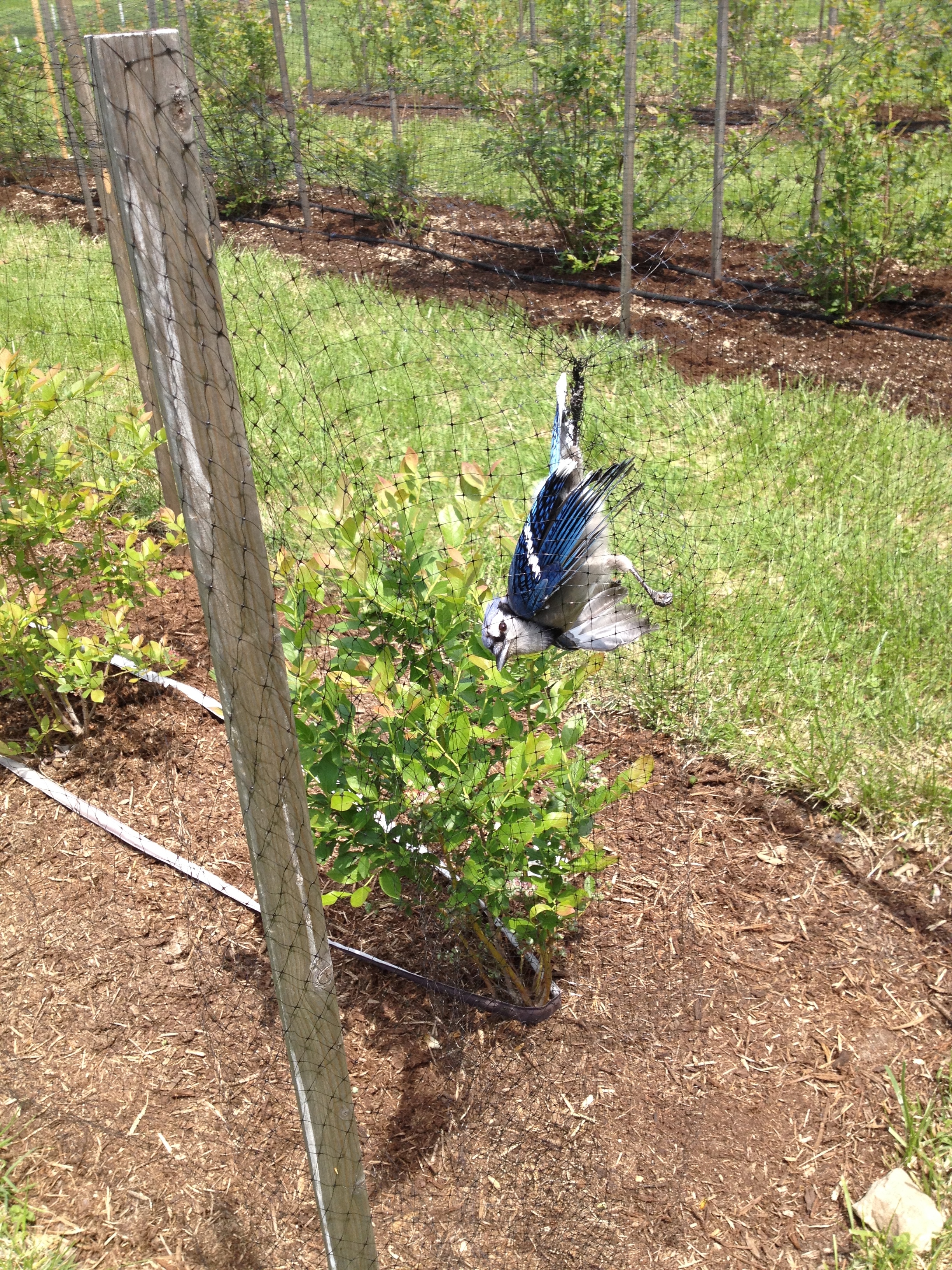 The last blueberry row has finally been thoroughly weeded and mulched so we added the netting today but not before two black snakes, (Romeo and Juliet?) found themselves entangled in the blueberry netting at either end of the same row. Unfortunately, like so many other black snakes before them, they were not able to extricate themselves from the netting. I think they are attracted to the black soaker hoses that we have laid out in the rows. We are sad to have lost two more of these since they do their bit here by helping to keep the small rodent population in check.