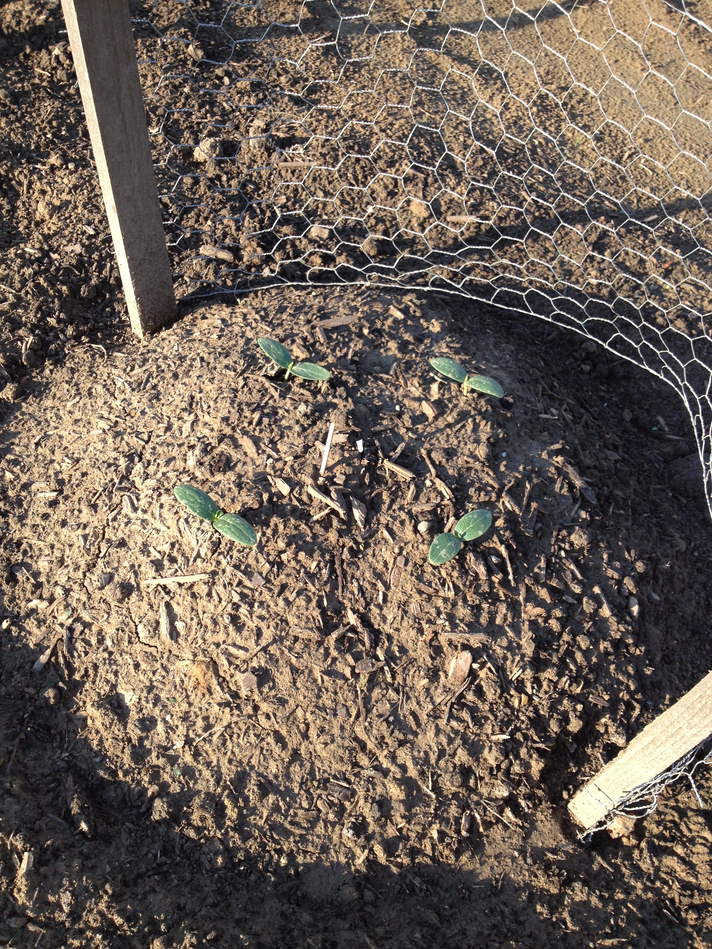 The cukes are finally up as well. Dave plants these in hills and then puts a trellis around one half to support the fruits.