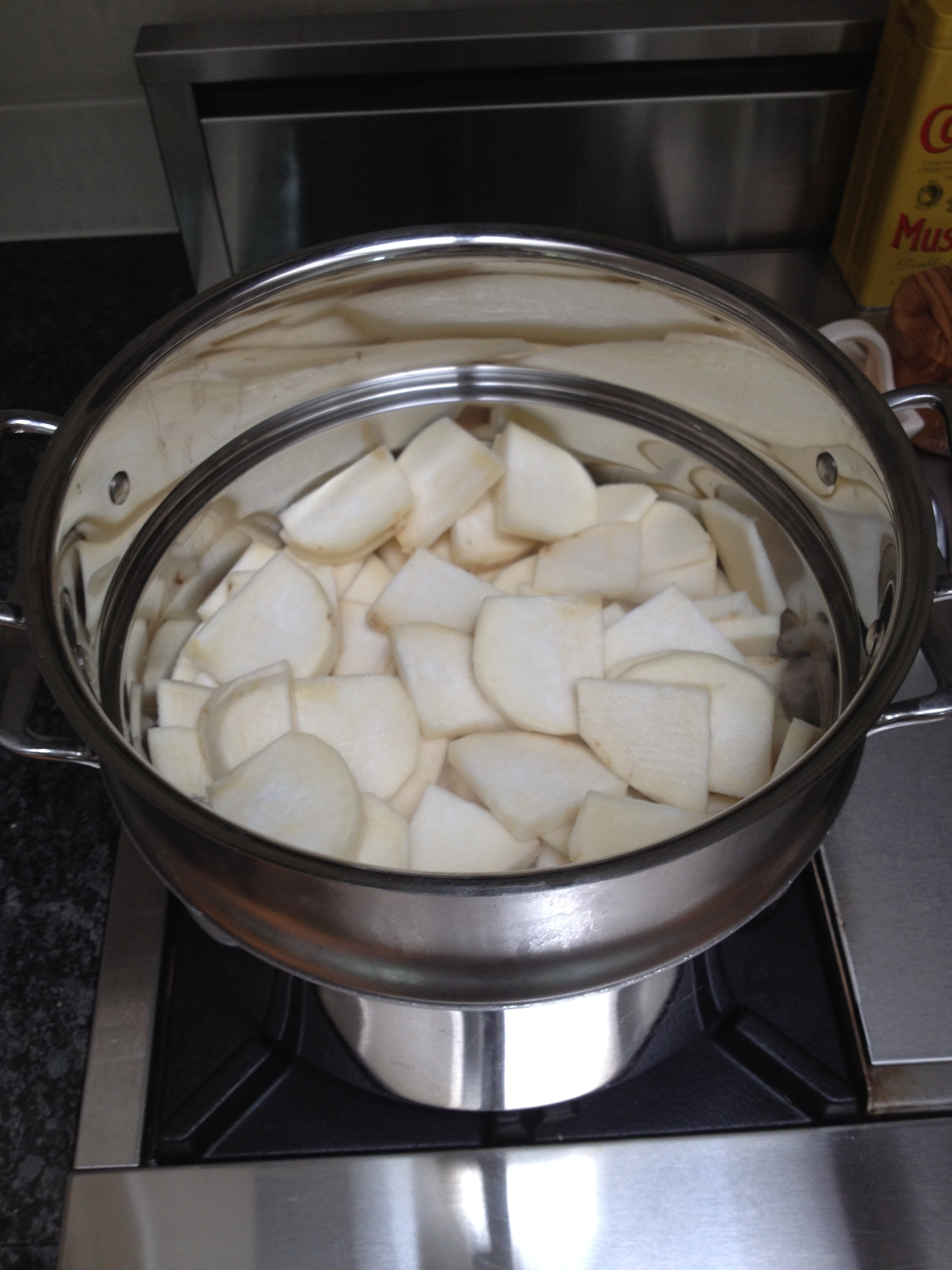 After getting several turnips sliced up, I put them in batches into the upper section of my largest steamer with about an inch of boiling water in the pot below and put a lid on it and steamed them for exactly 3 minutes.