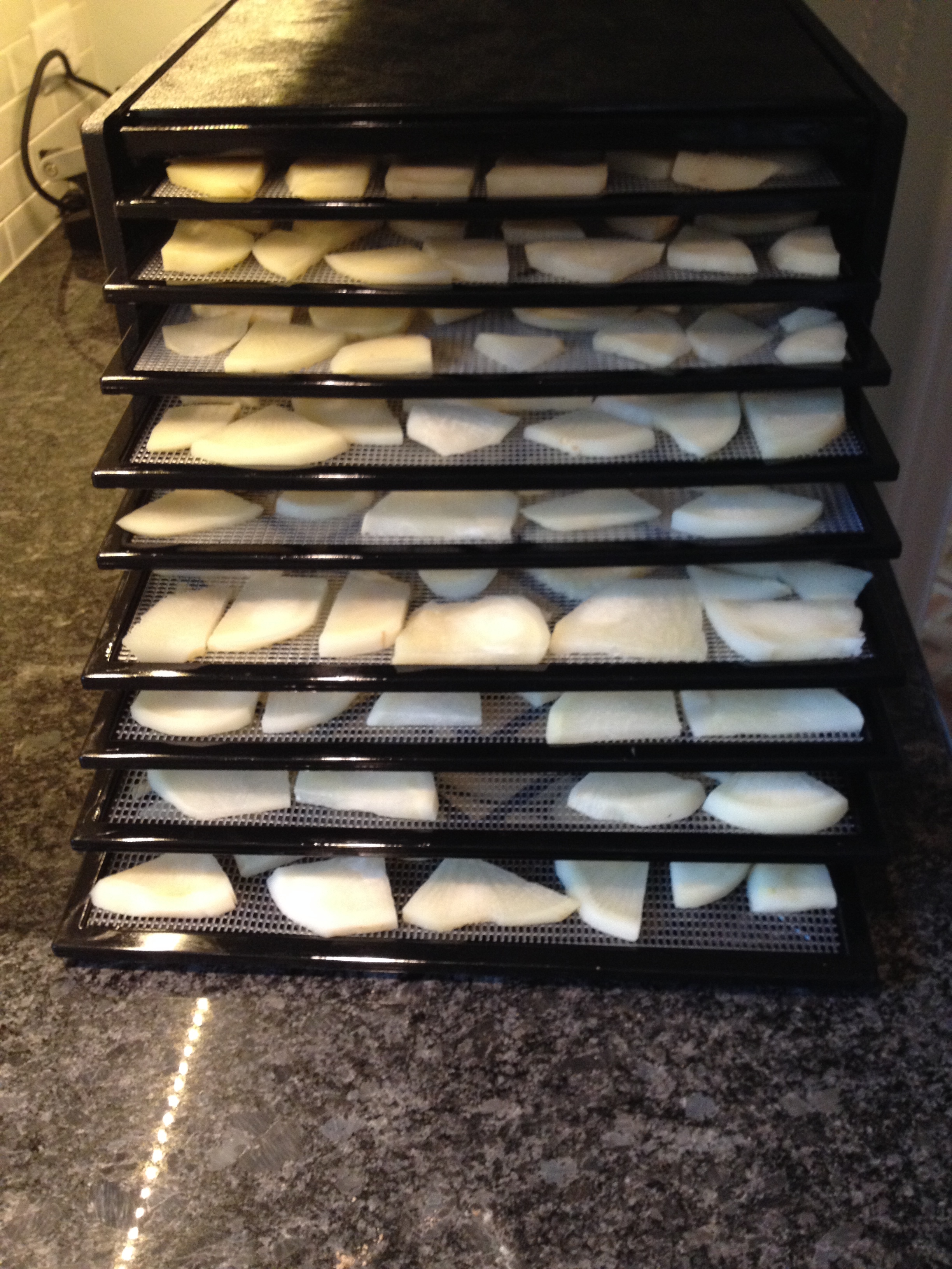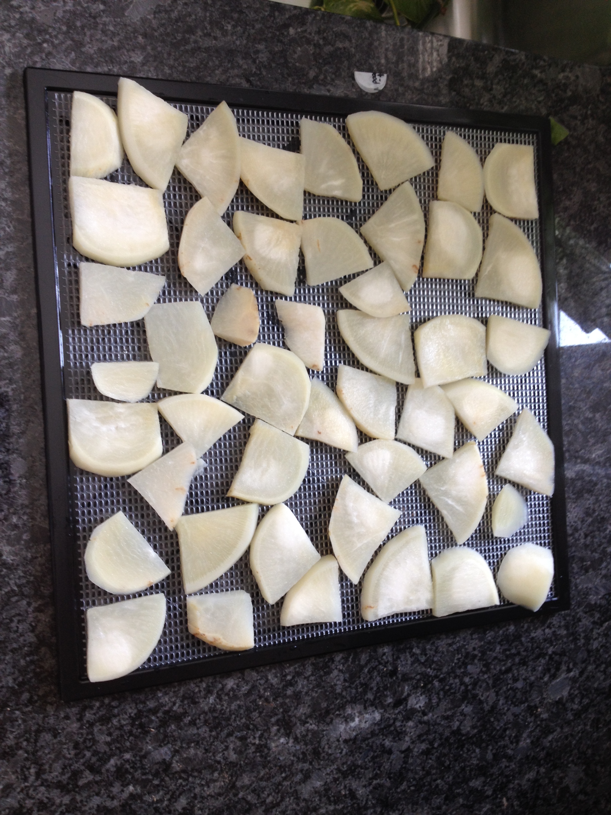 Not everyone thinks about dehydrating turnips…you don’t often see them in the bins at places like Whole Foods where you can buy banana chips, apple chips and other assorted dried foods to snack on. I don’t really intend to snack on the turnip chips but rather it is important to me to figure out how to use them successfully over time next winter when the glut of fresh garden produce is only a fond memory. We have enjoyed eating lots of turnips out of the garden this spring but they are considered a cool season crop and they aren’t going to last too much longer in the heat of the summer. So we harvested 10 pounds yesterday and had a few additional pounds in the refrigerator to process 14 pounds all together. As usual, I compared several sources of information on how to dehydrate fruits and vegetables in general and then specifically turnips.