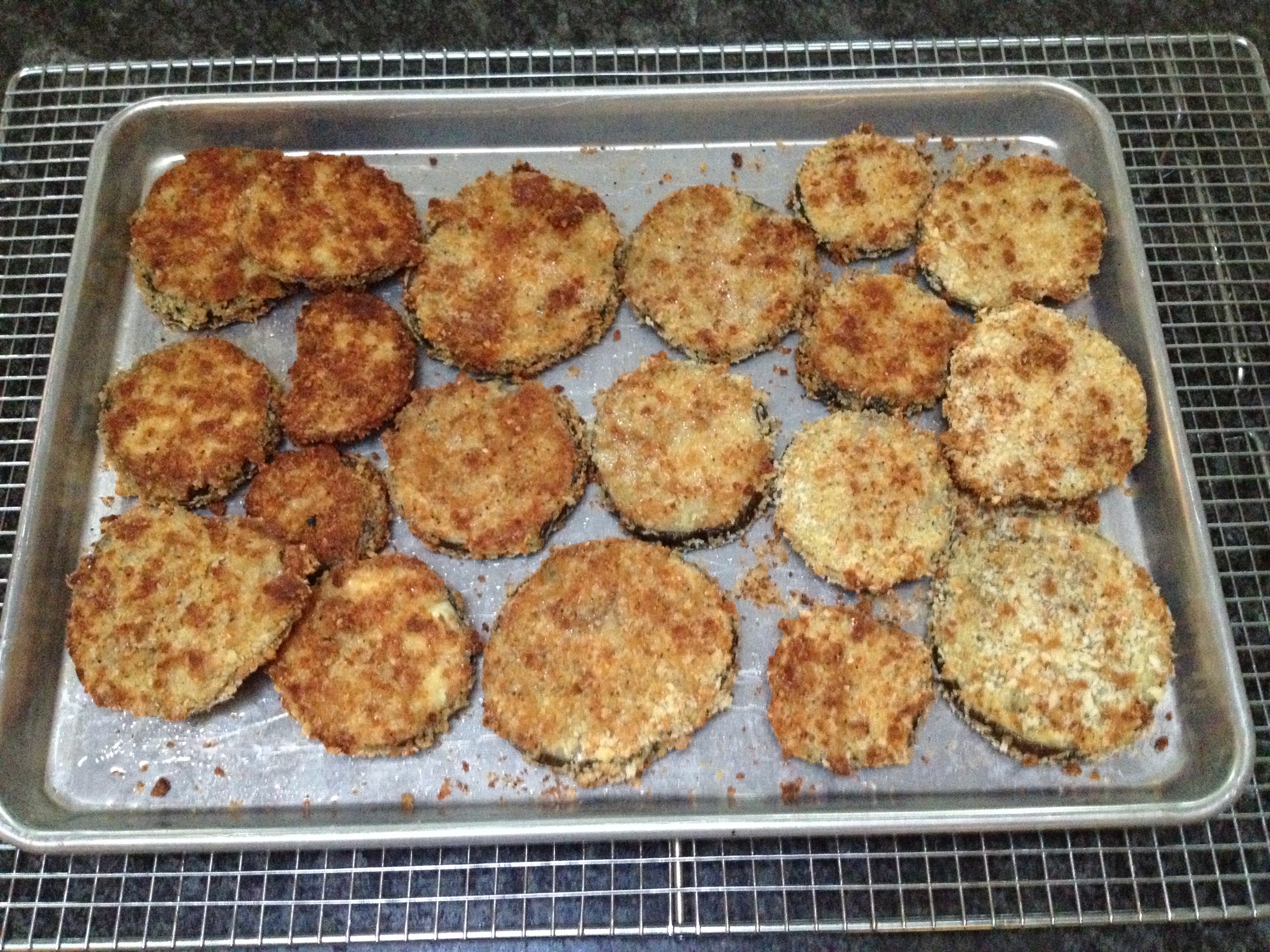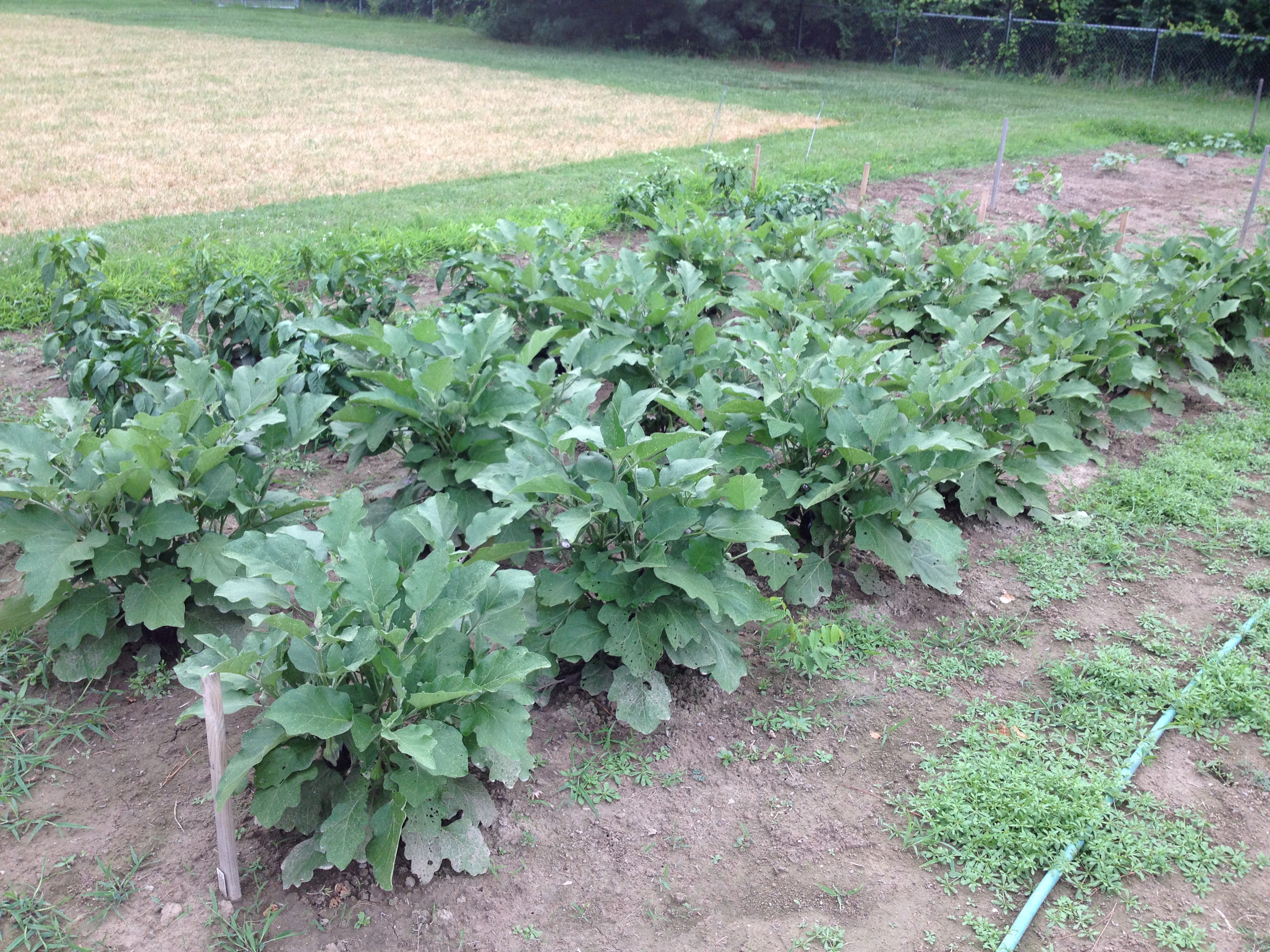 While the turnips were dehydrating I started preparing for the first eggplant Parmesan dinner of the season! As many of you know, we froze a lot of eggplants last year using my favorite recipe for this dish. It bears repeating here since it is outrageously good when eaten fresh or frozen and reheated. In fact, we found ourselves loving these eggplant slices eaten on buns as veggie burgers last winter. Here is the eggplant patch.