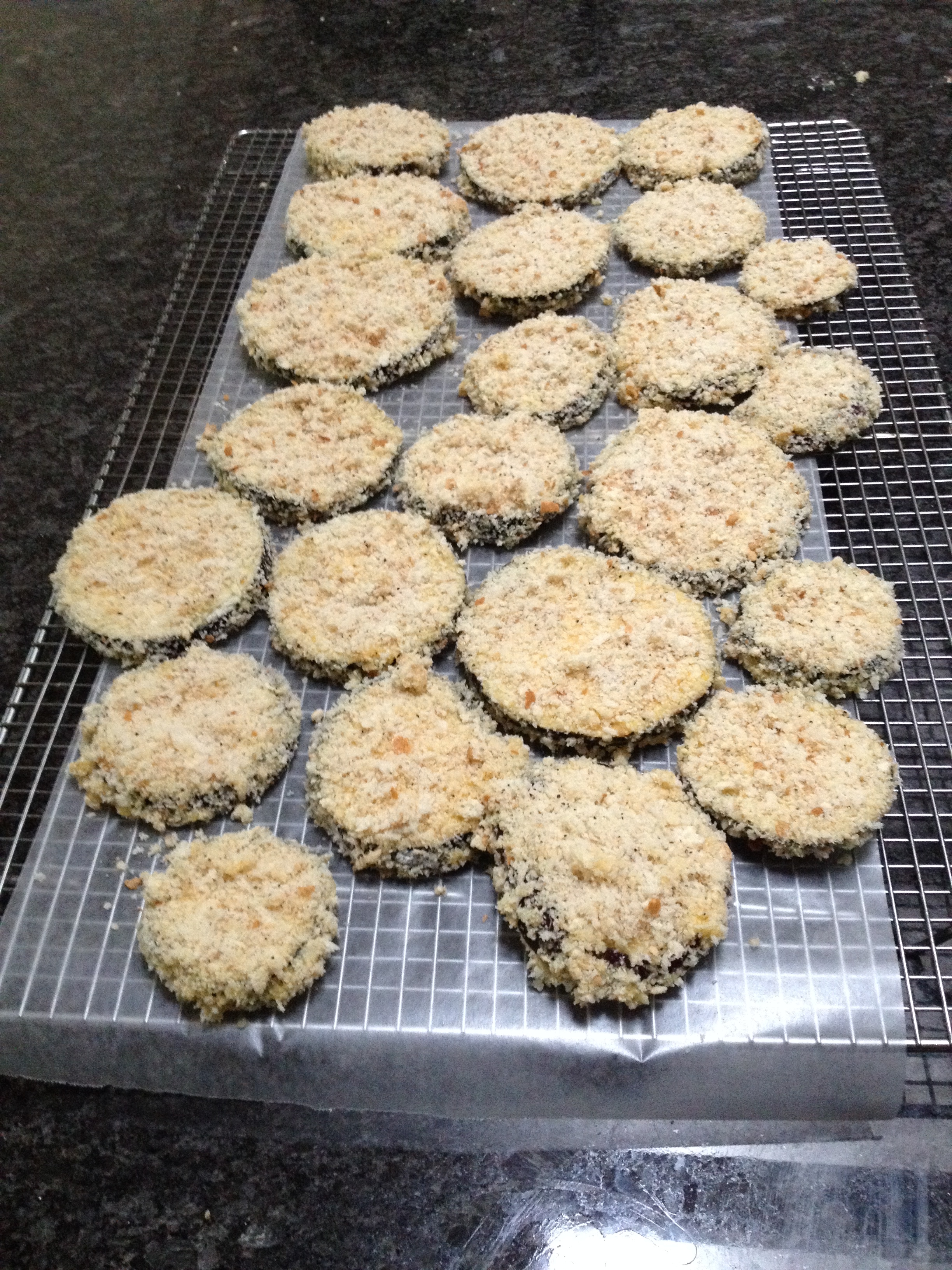 Then they take turns getting dipped into a peppery flour mixture, followed by an egg bath and finally get coated with a bread crumb and Parmesan cheese coating.