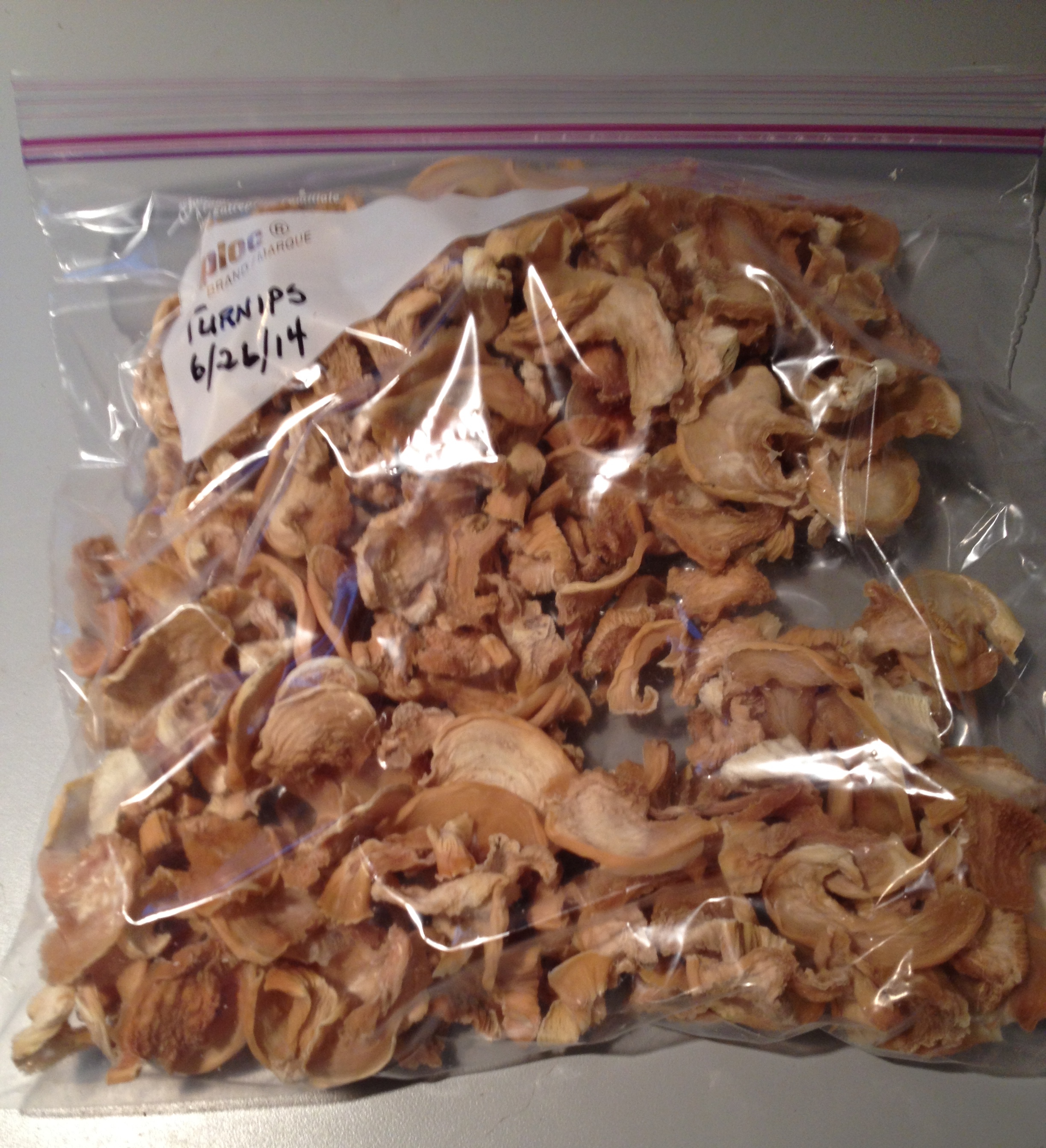 The recommended time for drying turnips varied between sources. One book said 8-10 hours and another one had a slightly higher temperature for the first hour and then a shorter drying time. I was ever so thankful that the dehydrator I purchased operated on a timer since after all the work I put into this, I didn’t really want to be hanging around at midnight to shut off the machine! I checked on them before bed and they weren’t completely dry yet so it was with great joy this morning that I found them nicely dried out and cooled.
