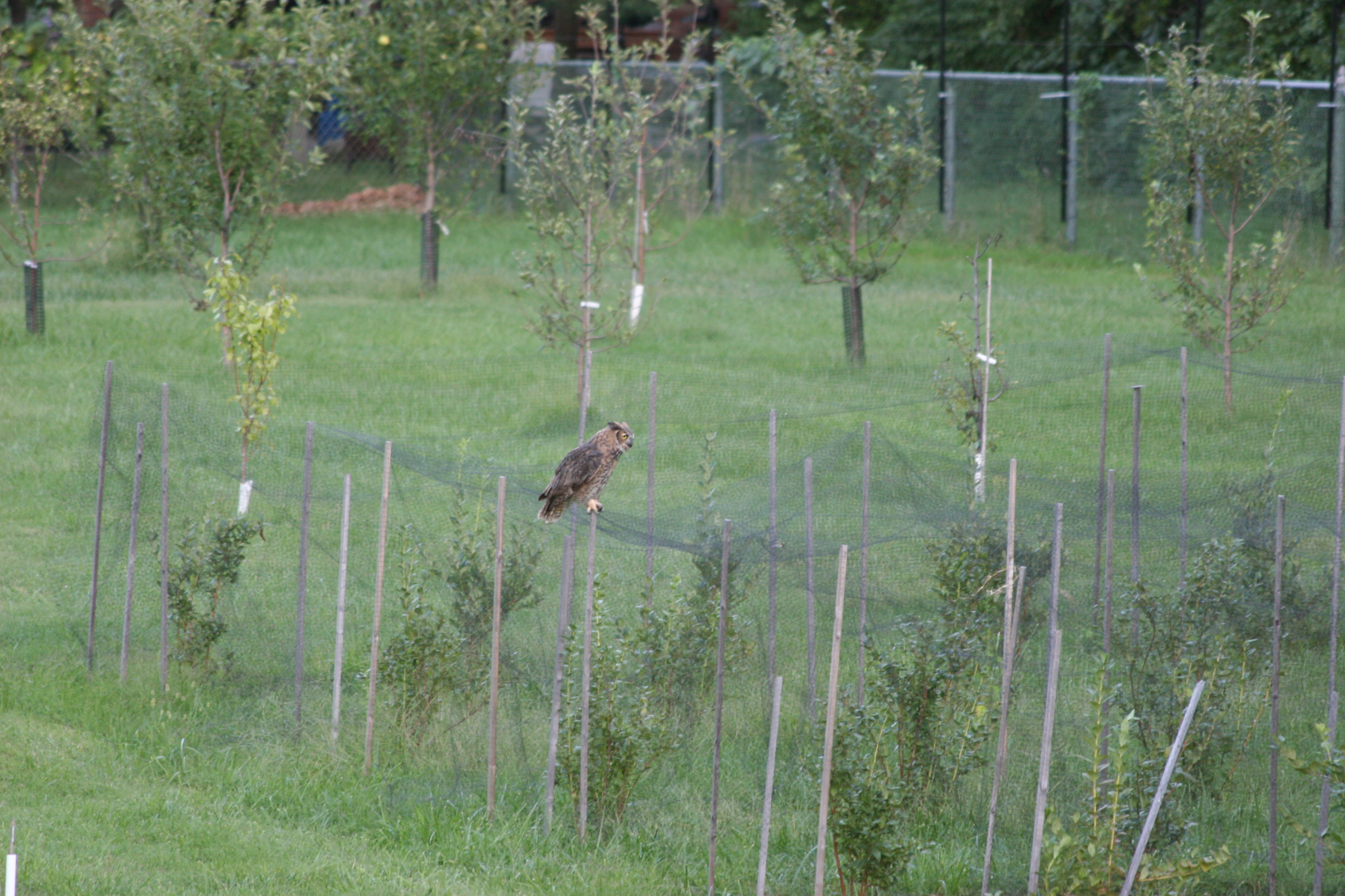 Our owl population seems to be quite healthy. I spotted a family of them hunting in the berry patches nearly every evening this fall. They have a unique bird call other than hooting which alerted me to their regular presence. They sometimes made themselves available for a photo op. They are heavy enough to have broken some of our netting posts!