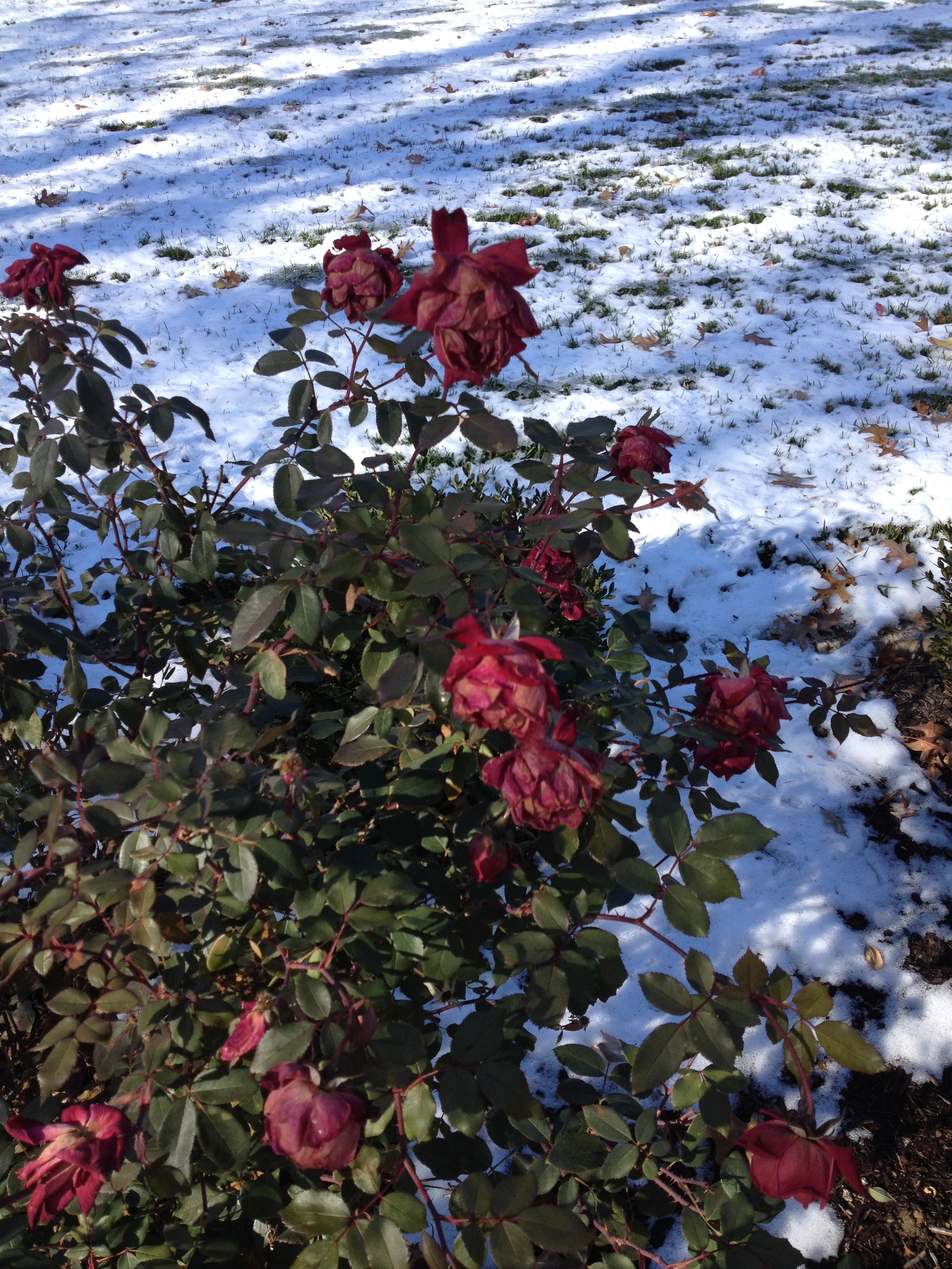 For the most part, we experienced a mild fall and then all the sudden we had frosty temps and snow on the ground. The season changed so quickly that the trees and shrubs didn’t have a chance to doff their leaves or even their blooms! Case in point, our roses were blooming one day and were covered with snow the next!
