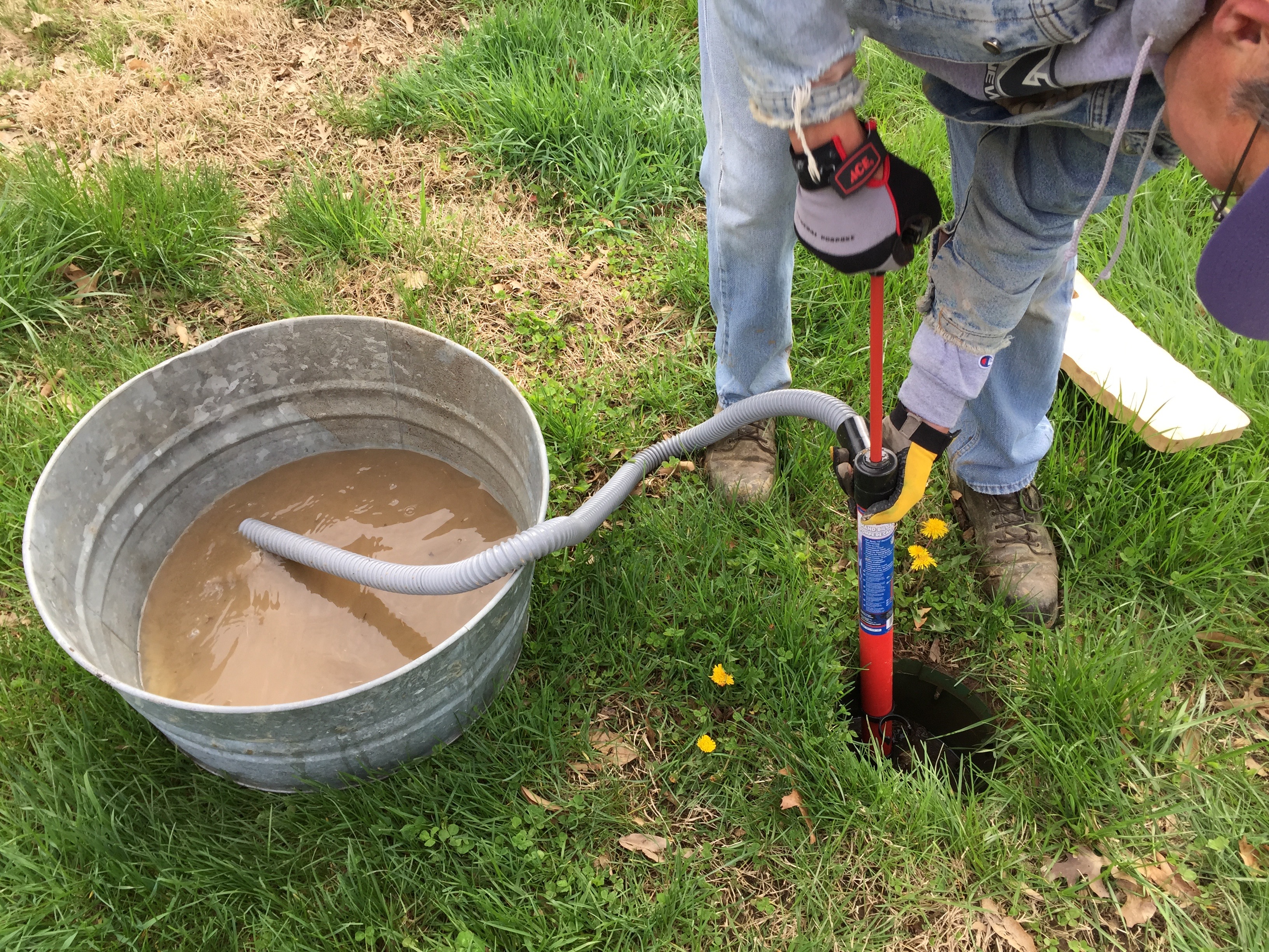 Spring is finally here at the farm but not without what has seemed like endless rain. (In fact, it is raining now which is why I’m getting a chance to compose a post!) If you recall, we had trouble stringing together enough dry days to get the tractor into the fields to plow them but it has been equally difficult to get the fields tilled for planting the early spring crops. With the ground still so wet and cold, there really isn’t any reason to have anything planted anyway since cold, wet seeds will just rot in the ground without the warmth of the drying sun! You know it is way too wet to work your soil if you can’t even weed your flower beds. Such was our predicament the last couple of weeks. An example of the high ground water is evident in the fact that our in-ground water spigots were actually too flooded to operate. Although we could simply wait for the water to subside, the plastic collars around these sub-surface spigots actually inhibits drainage so we used a hand operated bilge pump and put it to work relieving some of the excess water. Yes, it was a bit of a pain, but as you can see, we were able to drain off lots of water from each spigot site as well as from some of the flooded furrows in the fields.