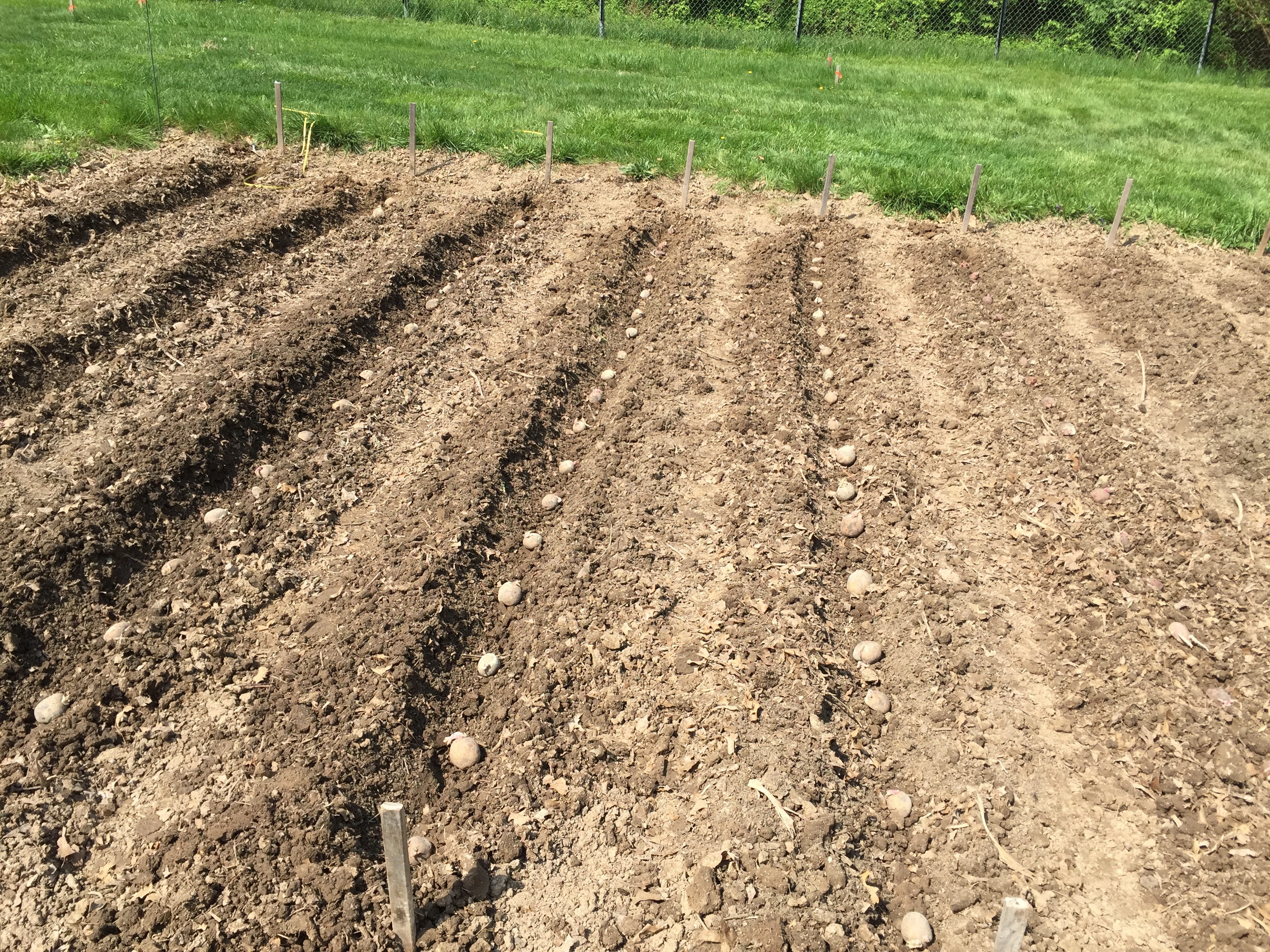 With this task under our belts, we prepared the seed potatoes for planting. This year, in addition to the standbys of Yukon Gold and Pontiac Red varieties, we added two rows of Dakota Pearl potatoes to the mix. According to one website these potatoes “make delicious chips and are outstanding for roasting or mashing and produce high yields of smooth-skinned spuds with attractive creamy white flesh”. How could we go wrong?
